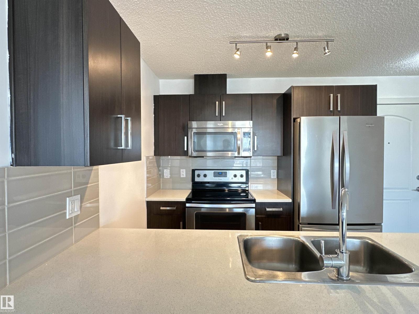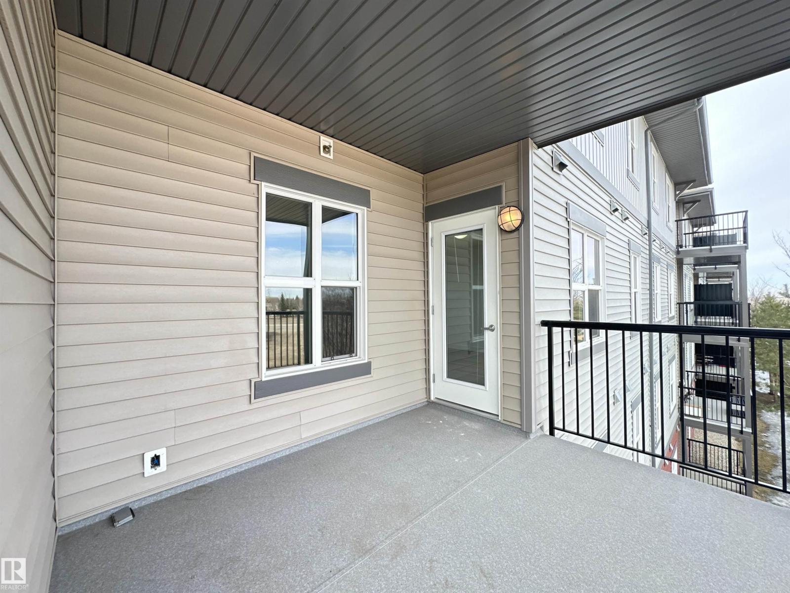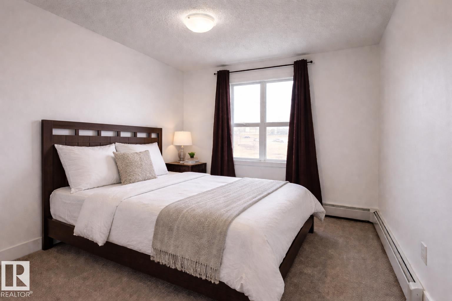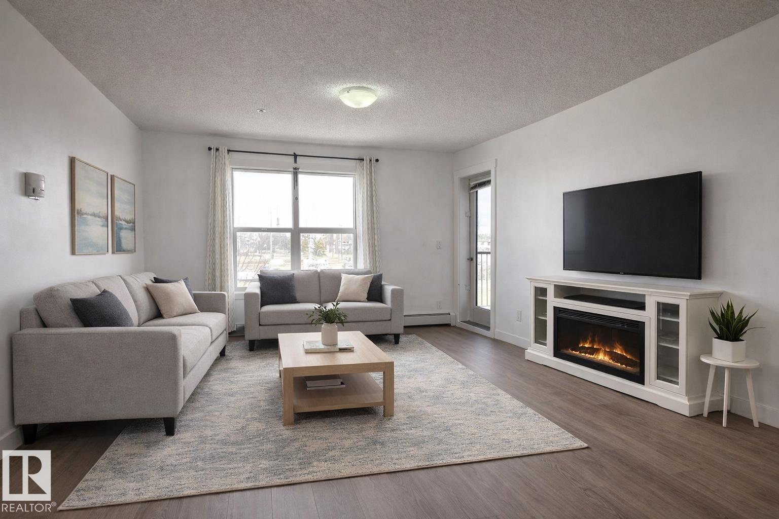 Welcome home to this bright & spacious 2 bed, 2 bath apartment in a highly coveted South Edmonton location. Well-designed unit, modern kitchen with SS appliances, quartz countertop & a generous bar seating. Open-concept living area is filled w/ natural light, direct access to your private covered balcony. The primary bedroom offers a peaceful retreat w/ a walk-through closet & a 4-pc ensuite. The second bedroom is positioned on the opposite side for maximum privacy, conveniently located next to 4-pc bath & in-suite laundry. A versatile den provides flexible space for a home office, guest room or additional living area. Enjoy the secured building access, elevator service, plus titled underground parking & a dedicated storage unit. Quick access to Highway 2, Anthony Henday Dr, 10 mins to South Common, 20 mins to YEG Airport & Premium Outlet. Steps to bus stops, Walmart, Sobeys, Real Canadian, restaurants, shopping, and all major amenities. Please note some pictures are virtually staged including fireplace. (id:63190)