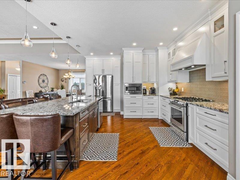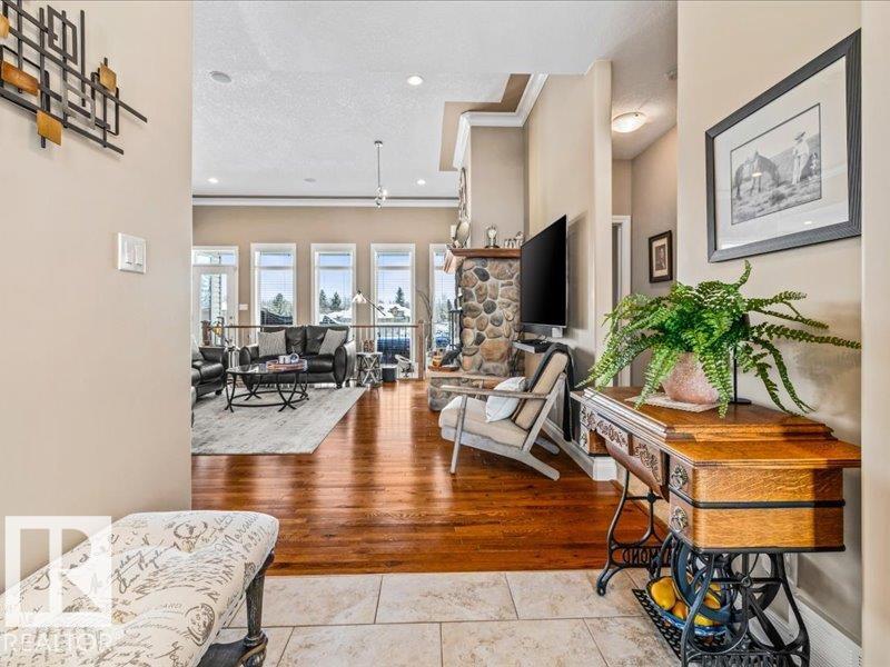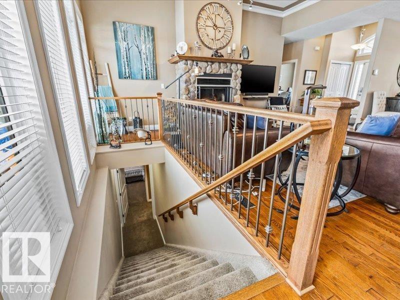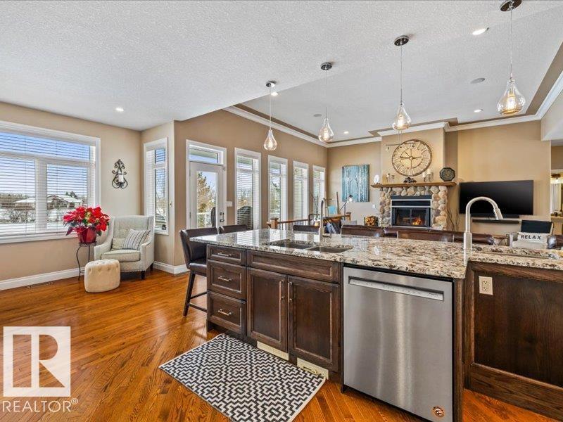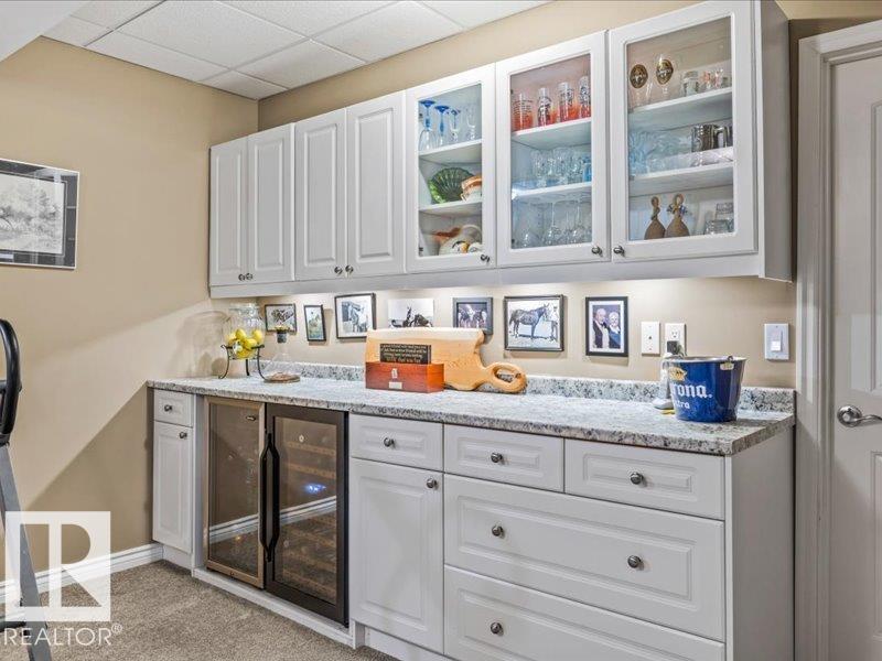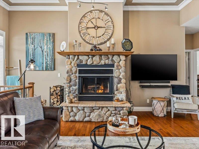 Perched on a half-acre in the serene Habitat Acres subdivision, this thoughtfully designed bungalow offers the rare balance of natural seclusion and city convenience, just minutes from Sherwood Park. Every room was intentionally oriented toward the stunning wetland backdrop, where wildlife roams year-round. The open main floor features 11-ft ceilings, a wood burning fireplace, custom floor-to-ceiling cabinetry, and stone countertops sourced specifically for this home. The primary suite captures morning sun through east-facing windows. A fully renovated ensuite, matched original hardwood throughout, and an updated kitchen reflect a meticulous renovation by a master contractor. The lower level adds two bedrooms, a theatre room, a bar, and a full bath. City water. Half-acre lot. A property of this caliber, in this setting, rarely comes to market. (id:63190)