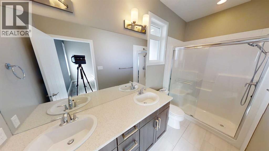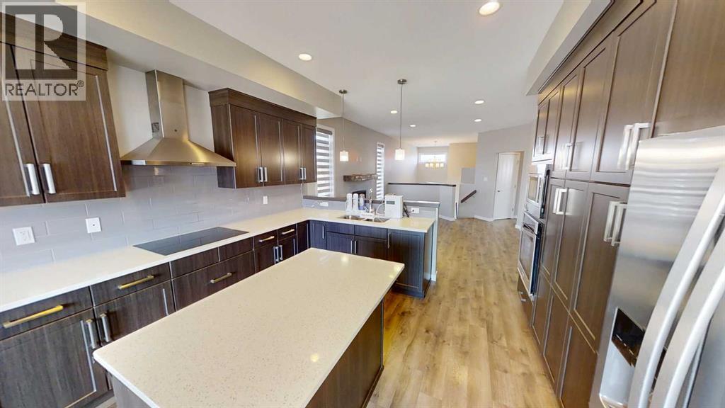 Check out this fully developed home with 5 bedrooms and 3 full bathrooms! Your main floor offers laminate flooring throughout the open concept main floor living, kitchen and dining, great for entertaining, plus your 2 bedrooms and 2 full bathrooms, including your primary bedroom with walk in closet, ensuite housing double sinks and walk in shower. Your basement is fully developed at ground level giving you big bright windows, THREE bedrooms, large family room, another 4pc bathroom and laundry. Ready for summer? So is this backyard- with covered composite decking, fully landscaped with UG sprinklers and fully fenced. Additional extras include: Composite siding, central air, window coverings, UG sprinklers, shed, water softener, and water filtration system. Located on a corner lot in The Crossings close to schools, park and amenities. (id:63190)