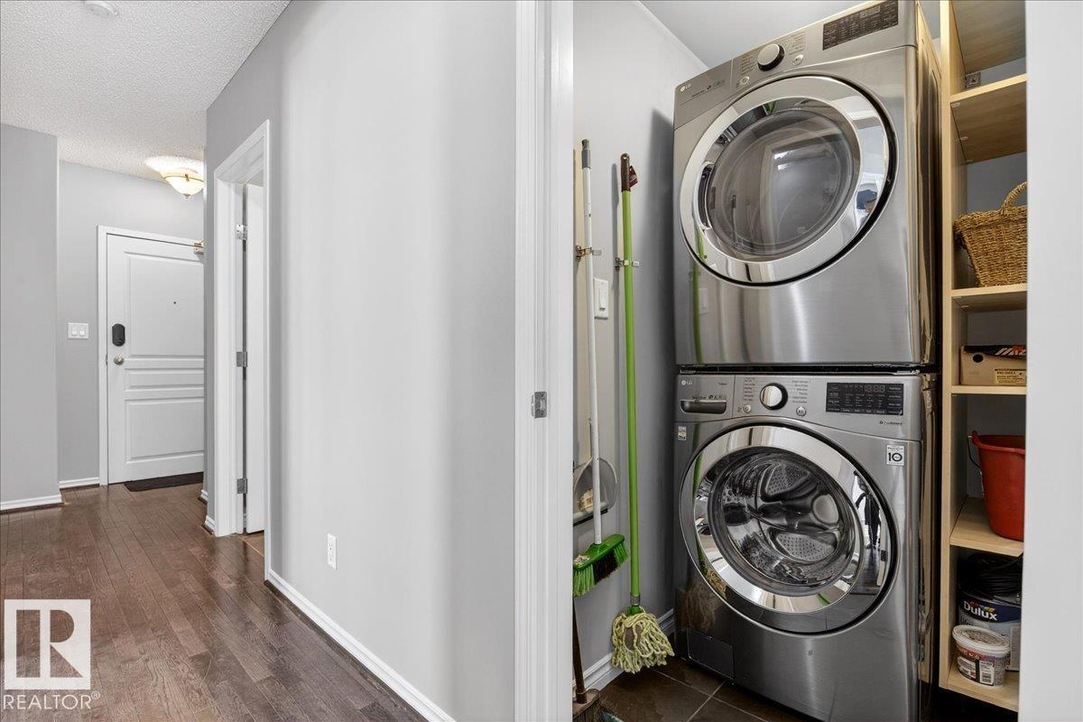 Welcome Downtown living in this well-appointed 2-bedroom, 1-bathroom condo in a solid concrete building. Enjoy an unbeatable location with a private balcony overlooking the Legislature Building and downtown views. The open-concept layout features granite countertops throughout, an undermount silgranite sink, stainless steel appliances, and a corner pantry. The unit is completely carpet-free with hardwood flooring, offering a clean, modern feel. The second bedroom provides great flexibility as a home office, guest room, or additional living space. Convenient in-suite front-load laundry and additional in-suite storage add to the functionality. Includes titled underground parking stall (#6) and access to underground visitor parking for guests. Building amenities include a gym, amenity room, rooftop patio, and garbage chute. (id:63190)
