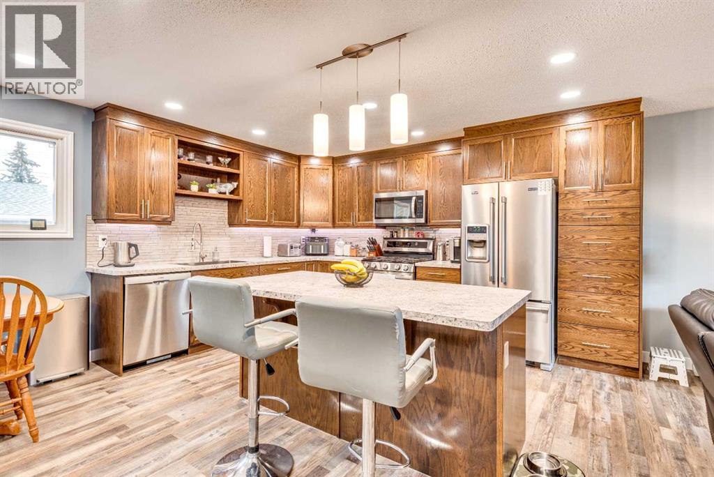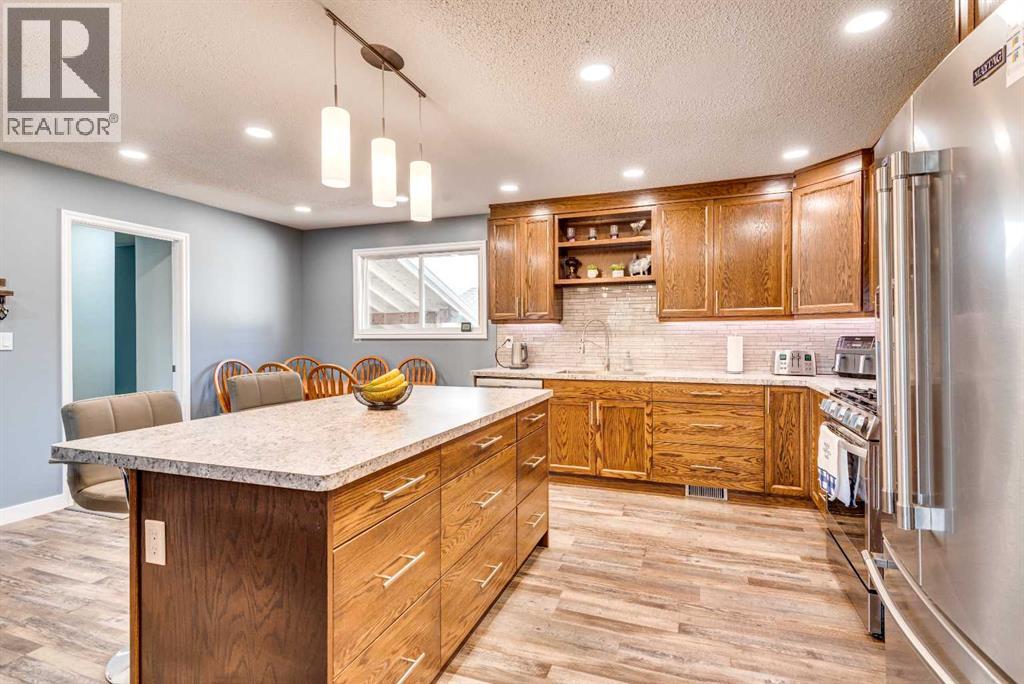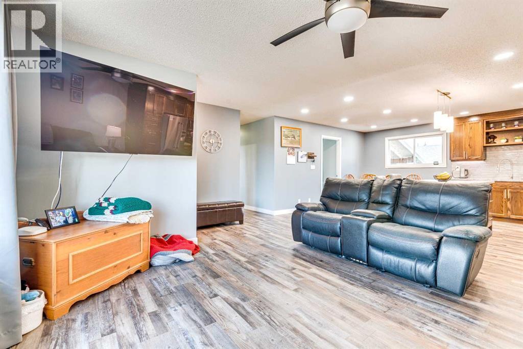 Welcome to this beautifully updated family bungalow in the welcoming community of Three Hills! Offering 5 bedrooms—3 on the main floor and 2 in the basement with large egress windows—this home provides plenty of space for a growing family. The main floor features a bright, open concept design with a stunning kitchen complete with custom cabinetry, stainless steel appliances, a central island, and generous countertop workspace—perfect for everyday living and entertaining. A spacious living area and convenient 2-piece ensuite off the primary bedroom, along with a full main bathroom, complete the main level. Downstairs, you’ll find a large family room ideal for movie nights or play space, along with two additional bedrooms, a bathroom, and plenty of storage. Numerous updates throughout the home include newer windows, flooring, furnace, roof, and added blown-in insulation in the attic for improved efficiency and comfort. Outside, enjoy a covered patio off the back entrance—perfect for relaxing or hosting—along with a partially fenced yard. The extra-large garage offers incredible space with potential for up to three vehicles and includes built-in cabinets for added storage. Located close to schools, parks, playgrounds, walking trails, shopping, and essential amenities including a hospital, arena, and swimming pool, this home combines modern updates with small-town charm and convenience. (id:63190)
