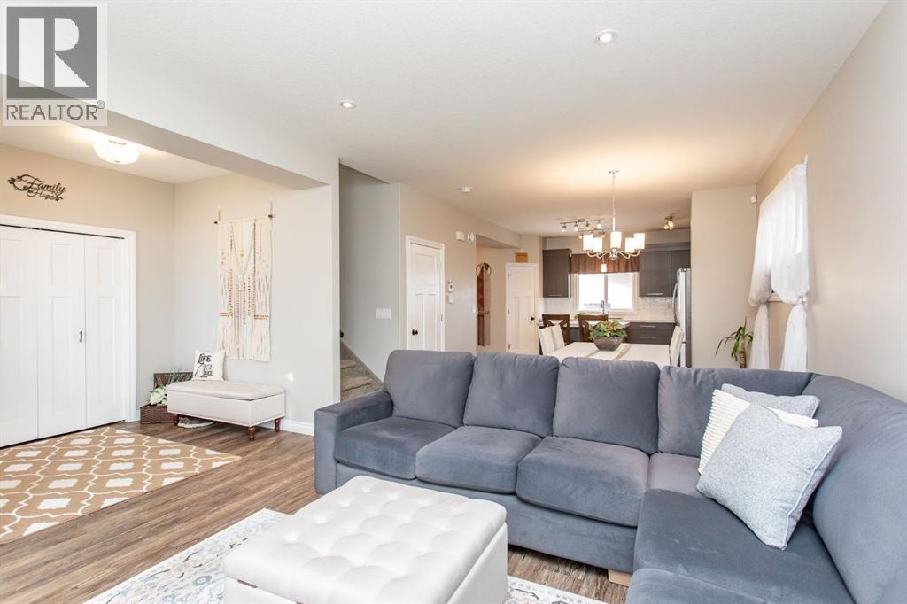 Immaculate original owner 2 storey home situated in beautiful Timber Ridge, just steps from schools, parks, playgrounds, scenic walking paths around a pond, and the shopping amenities of Timber Ridge and Clearview Market. This 1581 sq ft home shines with pride of ownership and offers a large 24x26 detached garage. The main floor offers a bright, open concept living, dining, and kitchen area that flows beautifully from the moment you step inside, with 9' ceilings, vinyl plank flooring throughout, and a clean, modern feel. The kitchen is a standout feature, boasting dark raised cabinetry, a central island with eating bar, upgraded stainless steel appliances, a granite sink, and a walk-in pantry. Just off the kitchen is a garden door leading directly out to the back deck, and a convenient 2 pce bathroom finishes off the main level. Upstairs, you'll find three nicely sized bedrooms including a spacious primary suite complete with a walk-in closet and private 3 pce ensuite with shower. The two kids bedrooms share their own 4 pce main bath, and laundry is conveniently located on the same level as all the bedrooms. The basement offers roughed in in-floor heat and is open to your future design ideas for a family room, additional bedrooms, and rough ins are in place for a full 4 pce bathroom. Outside, the fully fenced yard is your own private retreat featuring a deck that's perfectly set up for morning coffees, or simply unwinding at the end of the day. The detached 24x26 garage is insulated, drywalled, and taped with a finished ceiling. This spotless home is a pleasure to show! (id:63190)