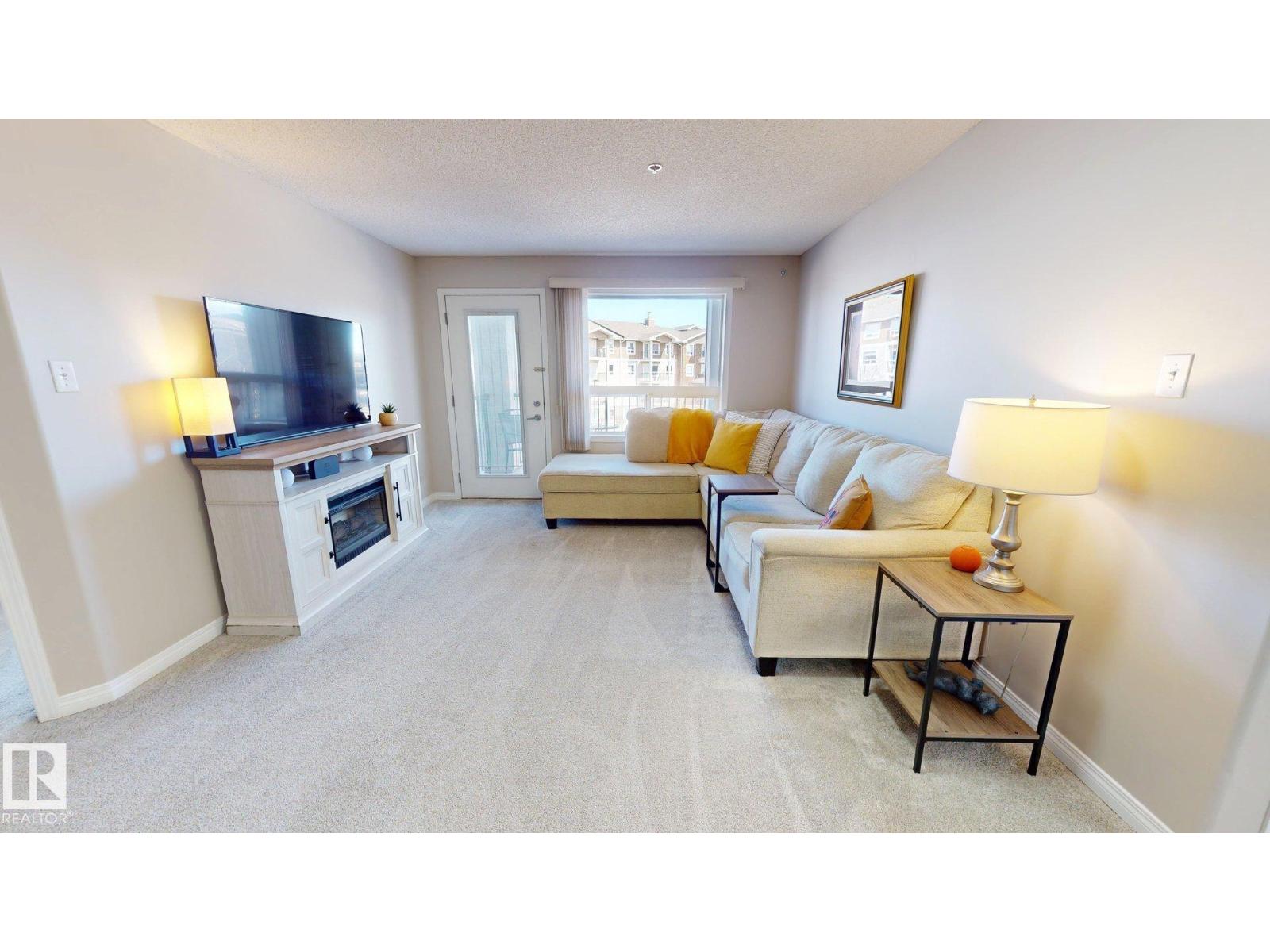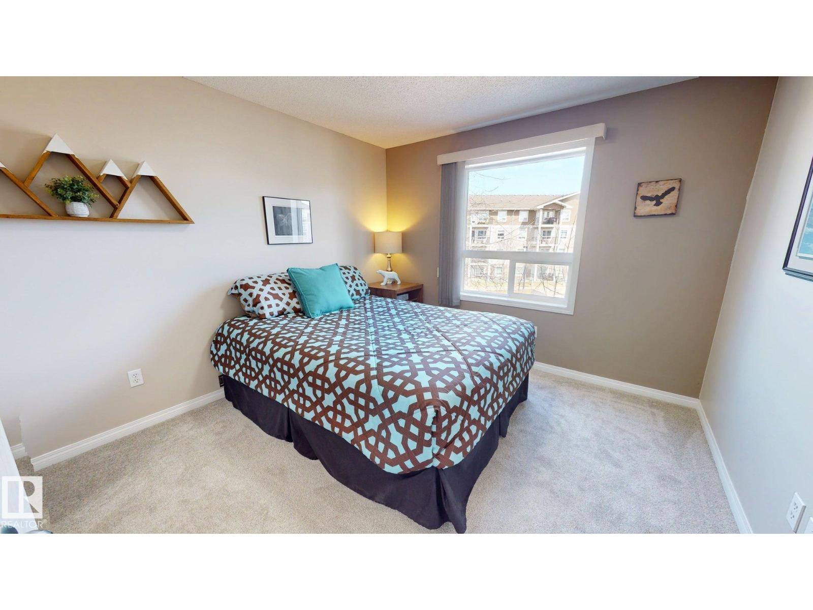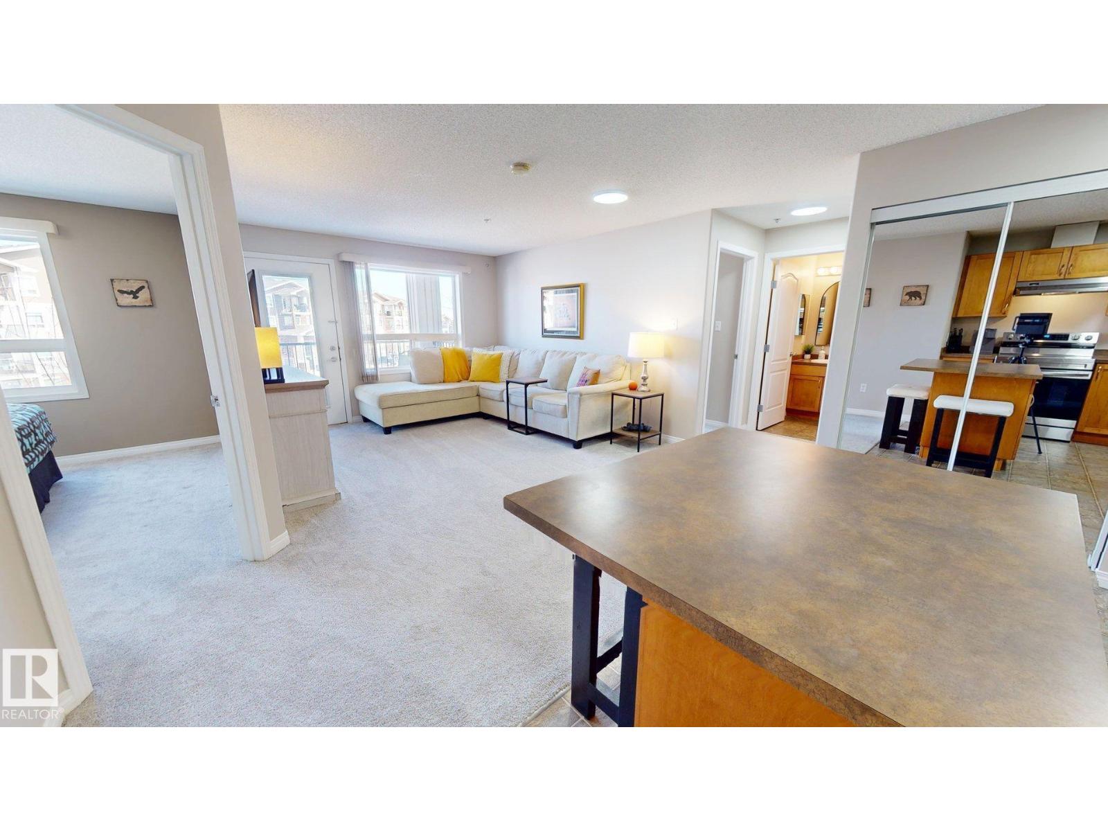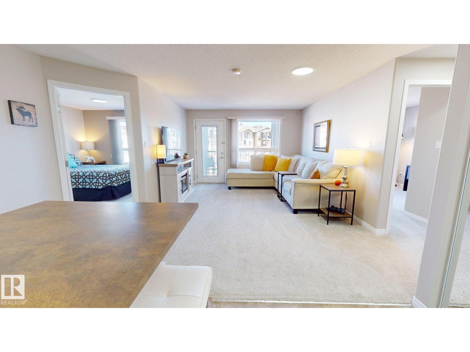 Welcome to 1302, 9363 Simpson Drive, a bright northeast facing condo that stays cool in the summer. This well maintained 2 bedroom-2 bathroom unit, you will notice the spacious open concept layout with like new carpet. The kitchen features stainless steel appliances including a dishwasher, a new fridge with water/icemaker, and a new stove, ample counter space and a functional island. The primary bedroom includes a walk-through closet leading to a 4pc ensuite. The second bedroom paired with an additional 4pc bathroom offers great flexible space for family, or a home office. Large in-suite laundry room includes a stacked washer/dryer and extra storage. Step out to a spacious balcony. Enjoy the convenience of being close to but not directly beside the elevator for easy access. Unit includes a titled above-ground, electrified parking stall. Building amenities include a fitness room, an entertainment room, and guest suite. Ideally located near schools, shopping, parks, a rec centre, and a bus stop near by. (id:63190)
