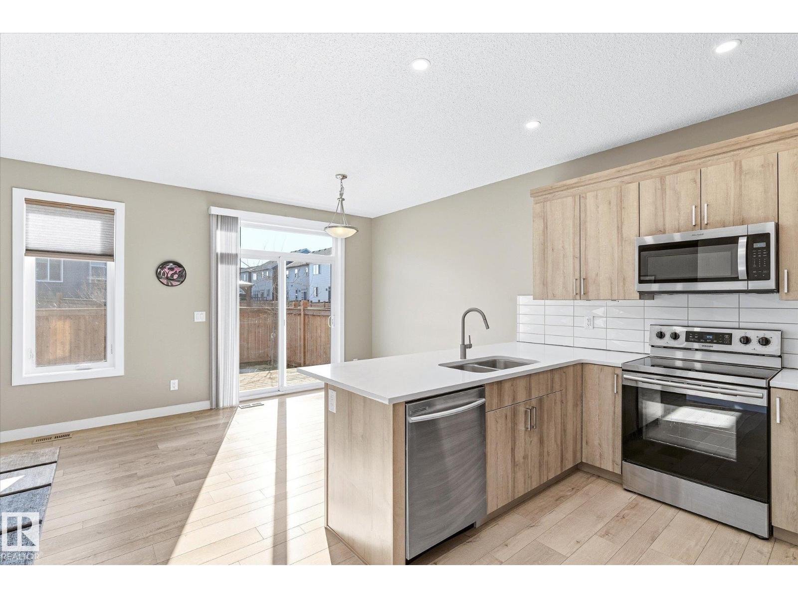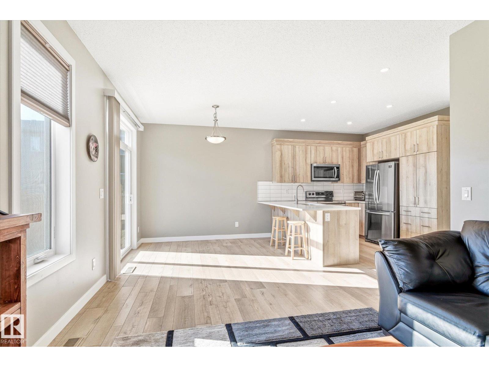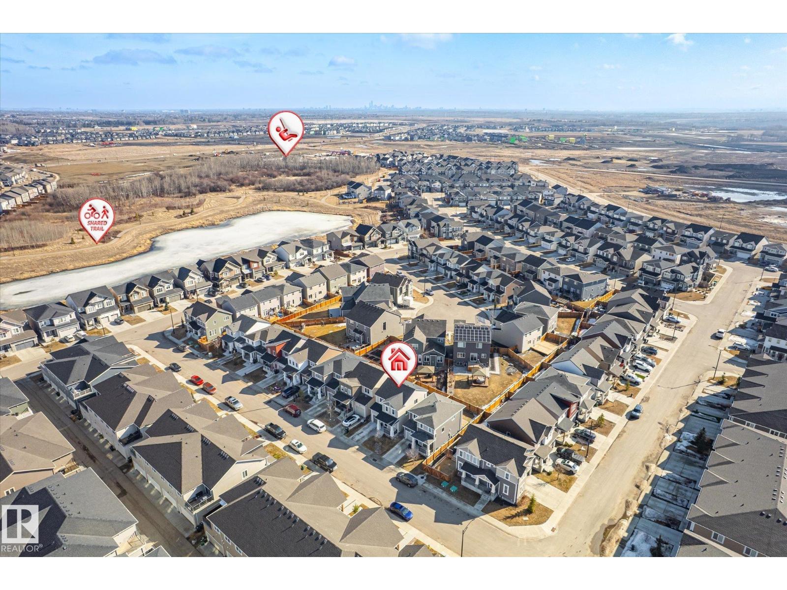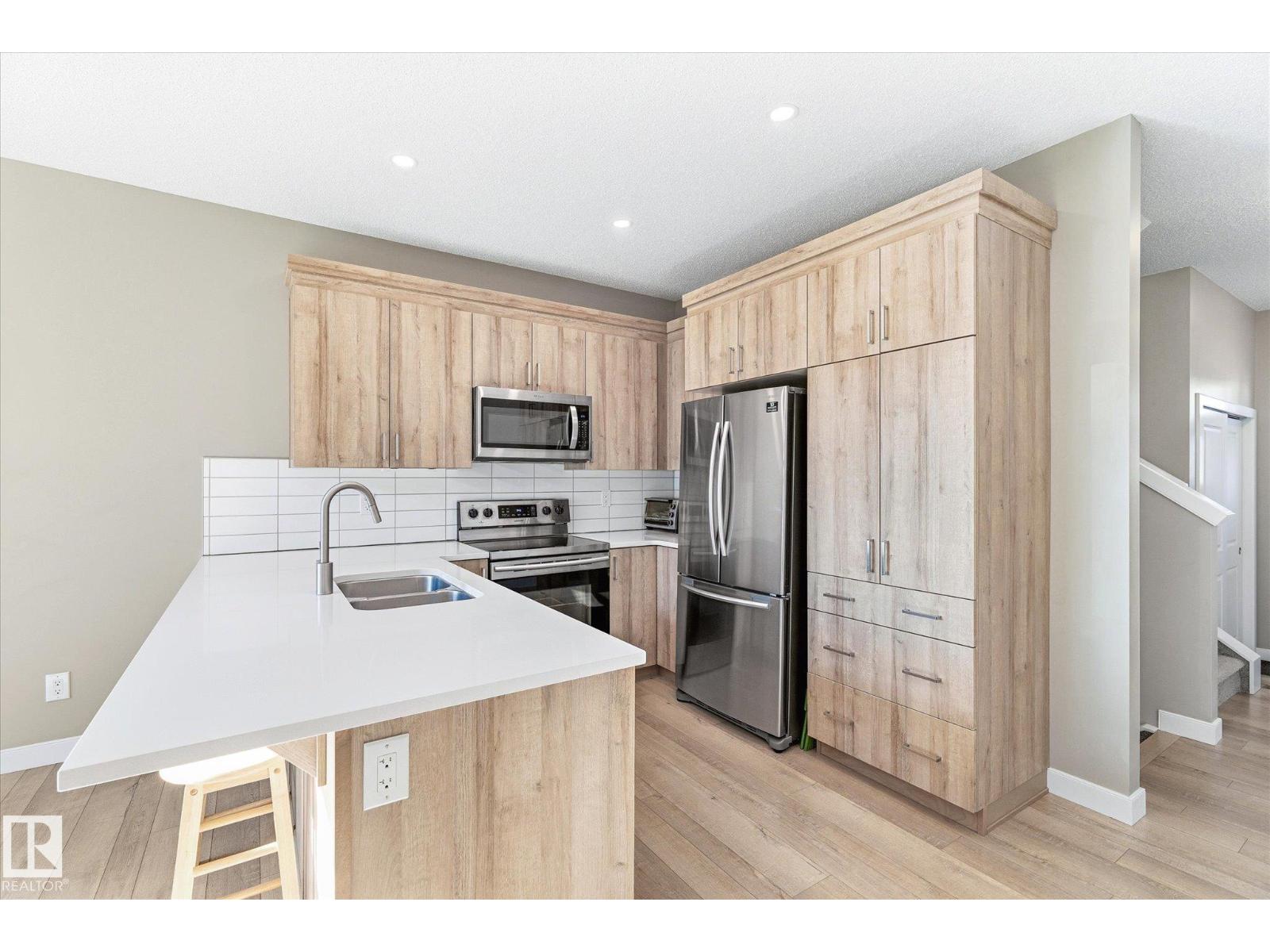 Excellent value and price for a newer detached home with garage and finished basement! Move right in to this turn key low maintenance landscaped and fenced home. 1420 sq ft with 4 bathrooms! The main floor features soaring 9-foot ceilings, luxury vinyl plank flooring, and a gourmet kitchen complete with quartz countertops and stainless steel appliances. The open layout is perfect for entertaining or just for the family to relax in. Upstairs, there is a large main bath with quartz counters plus three generous bedrooms. The expansive main bedroom suite featuring a walk-in closet and ensuite. The upstairs laundry is an added perk. In the basement, you will find a finished space with a rec room and 4th bathroom. Storage space is also an added bonus. Situated on a quiet street, this home is close to a playground, spray park, skating rink, and walking trails. Just a ahort walk to bus stop and easy access to Henday freeway. Exceptional value for a family here! (id:63190)