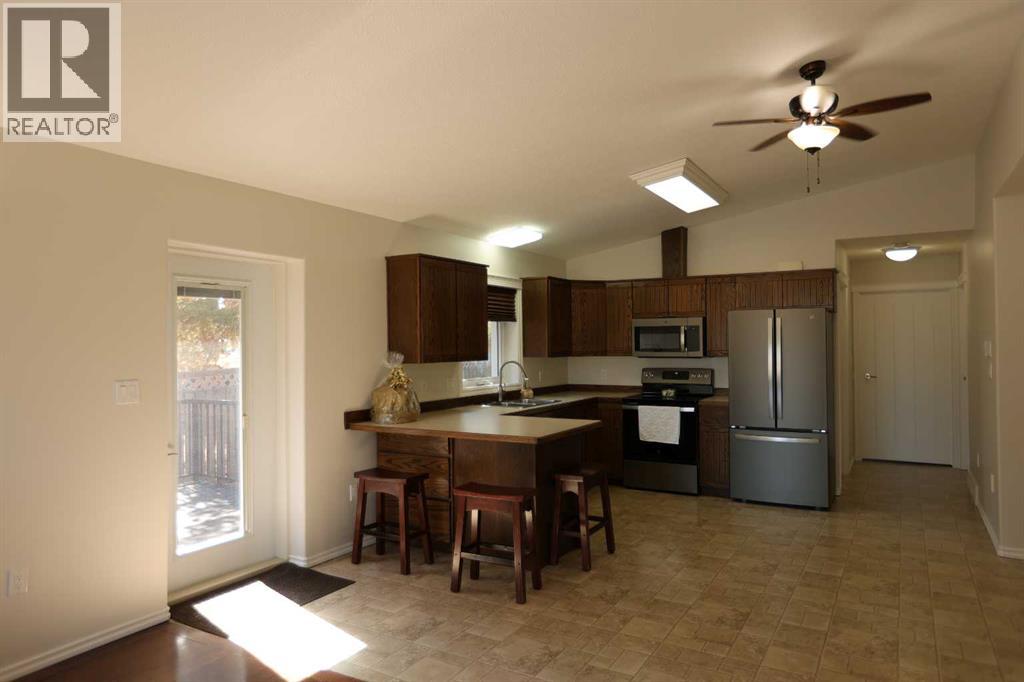 This solely owned 2 bedroom 2 bathroom barrier-free bungalow was built with accessibility and quality care in mind! Located in the heart of Consort, the convenience of location offers quick access to the local community centre, shopping, Gem Centre, and so much more. The value of craftsmanship can be found throughout the quality updates throughout, including- ICF construction, soundproofing, and energy efficiency. The thoughtful design was created with mobility and open-concept living in mind, with spacious 36 inch entries, stable walk ways, and an abundance of storage. Upon entry, you are greeted with vaulted ceilings, bright natural lighting, and the continuity of pleasing aesthetics, such as freshly painted walls. The living area showcases a large window, durable hardwood floors, and plenty of space for furniture. The kitchen offers a functional flow with an eat-in bar, full appliances, and pantry. The dining area can hold a sizeable table and offers direct access to the 10'x24' deck, with full metal railings. The primary suite is a private retreat, offering a walk-in closet and a well-appointed ensuite with an easy-access shower and built-in bench. A second bedroom and full bath provide flexibility for guests, family, or a home office. The home finishes with a full storage room, walk-in laundry that fit side by side laundry, and concrete crawl space. Outside, the fully fenced yard has been manicured with mature landscape, a 16' raised garden bed, and decorative front garden bed. Other perks include an extended dyed concrete driveway, large shed, and exterior outlets. Pride of ownership is evident throughout the property, and suitable for anyone looking for a move-in ready home! (id:63190)