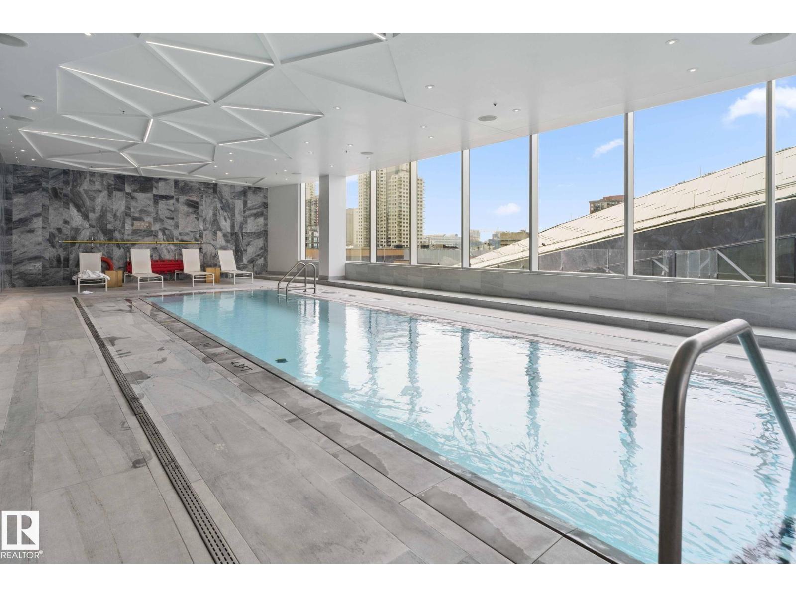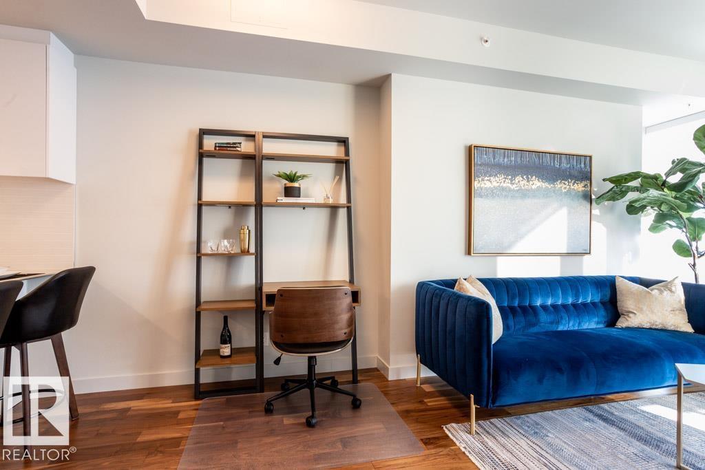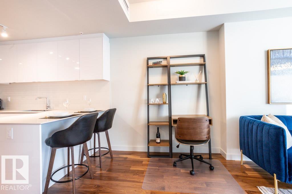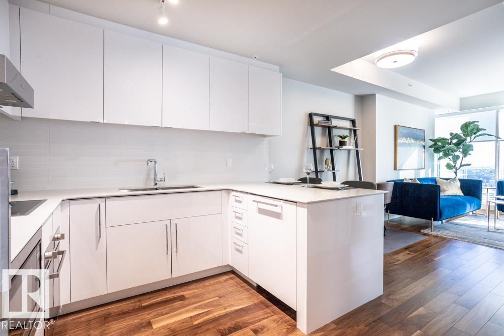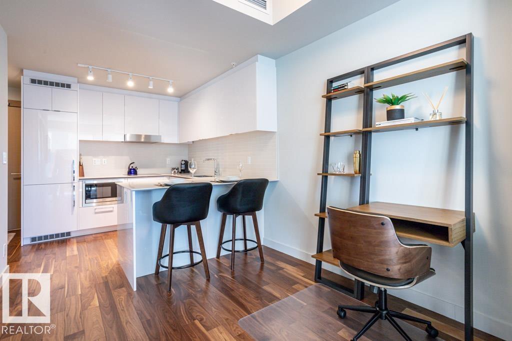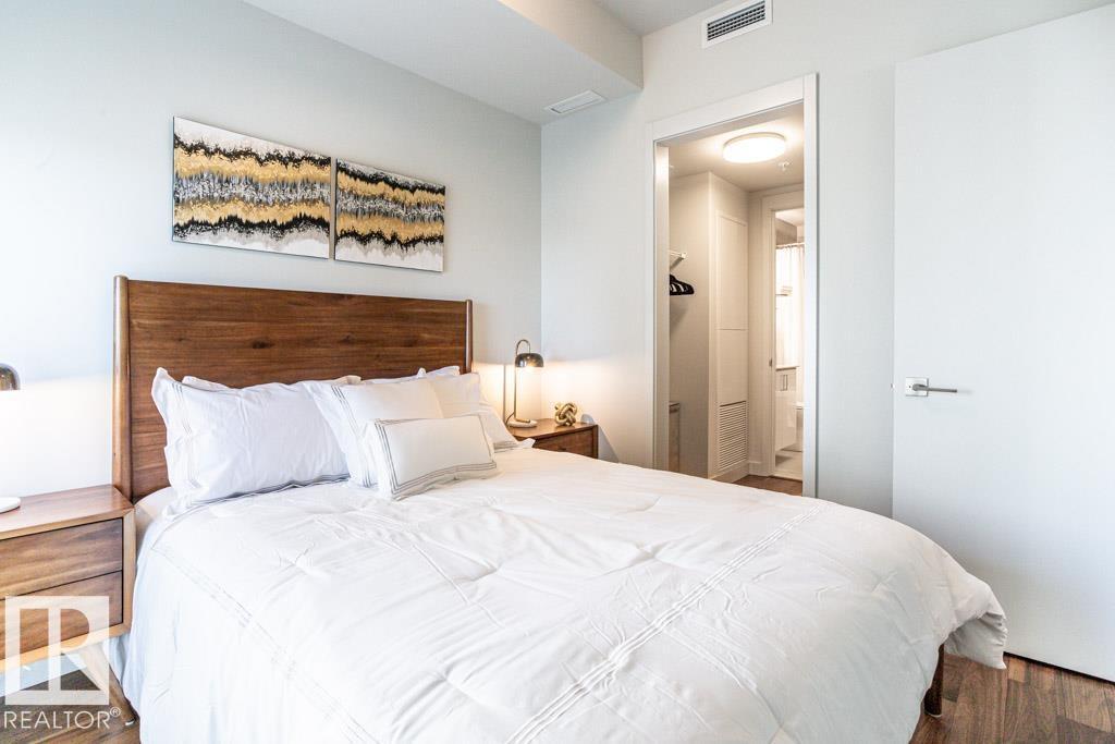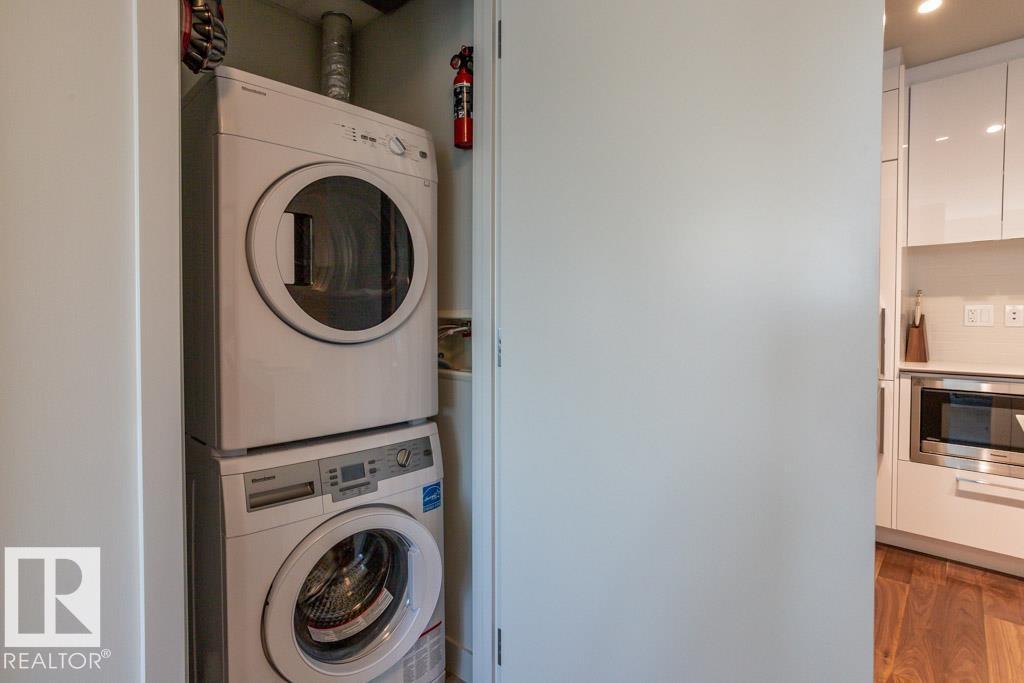 Experience elevated living at The Legends Private Residences atop the JW Marriott Hotel in Edmonton's vibrant ICE District. This 1 bedroom, 1 bathroom unit offers a thoughtfully designed space on the 25th floor with amazing views. Step into an open-concept layout featuring high ceilings, engineered hardwood floors, floor-to-ceiling windows, and premium finishes throughout. The kitchen is equipped with stainless steel appliances, quartz countertops, and chic cabinetry. The bedroom connects to a spa-like 4-piece bathroom. Enjoy in-suite laundry and a private balcony. Building amenities include, indoor pool, rooftop patio, owner's lounge, BBQ area, and 24/7 concierge. Access Rogers Place, City Centre, and LRT via the Pedway. Includes one titled underground parking stall. Can be sold fully furnished. (id:63190)