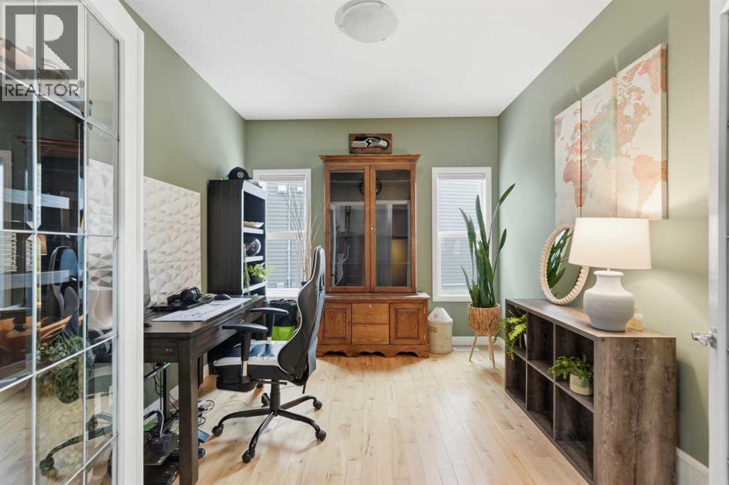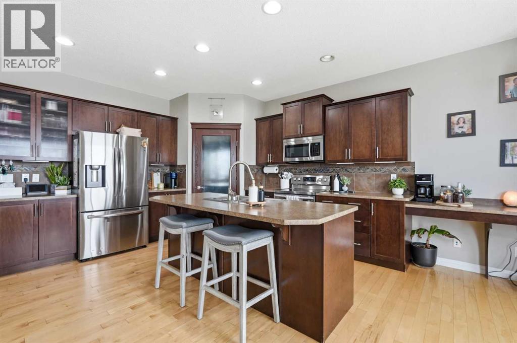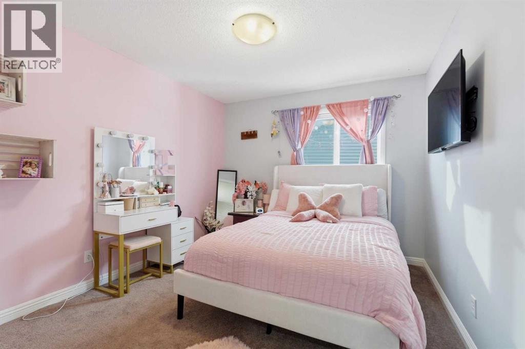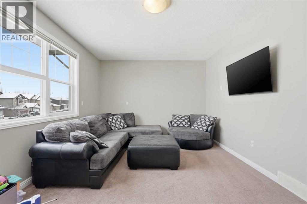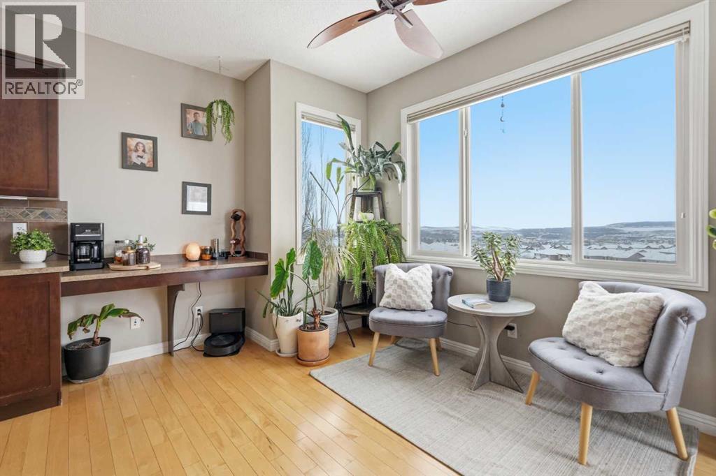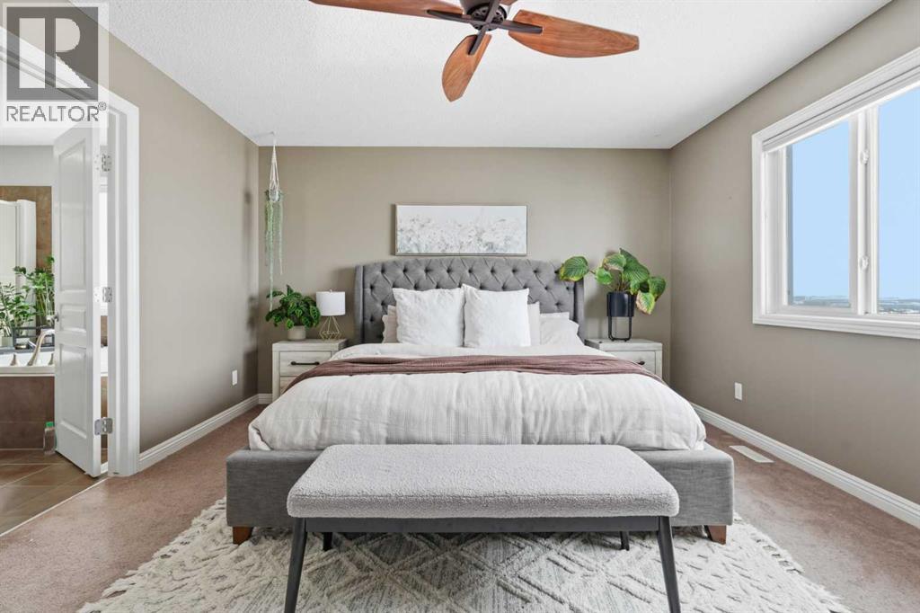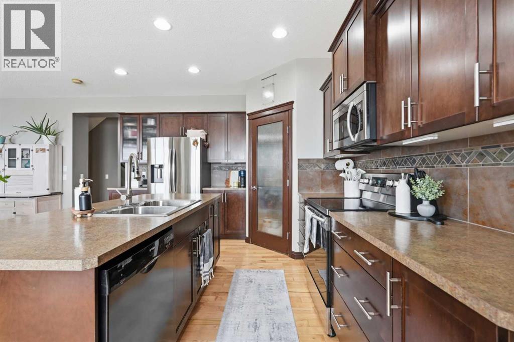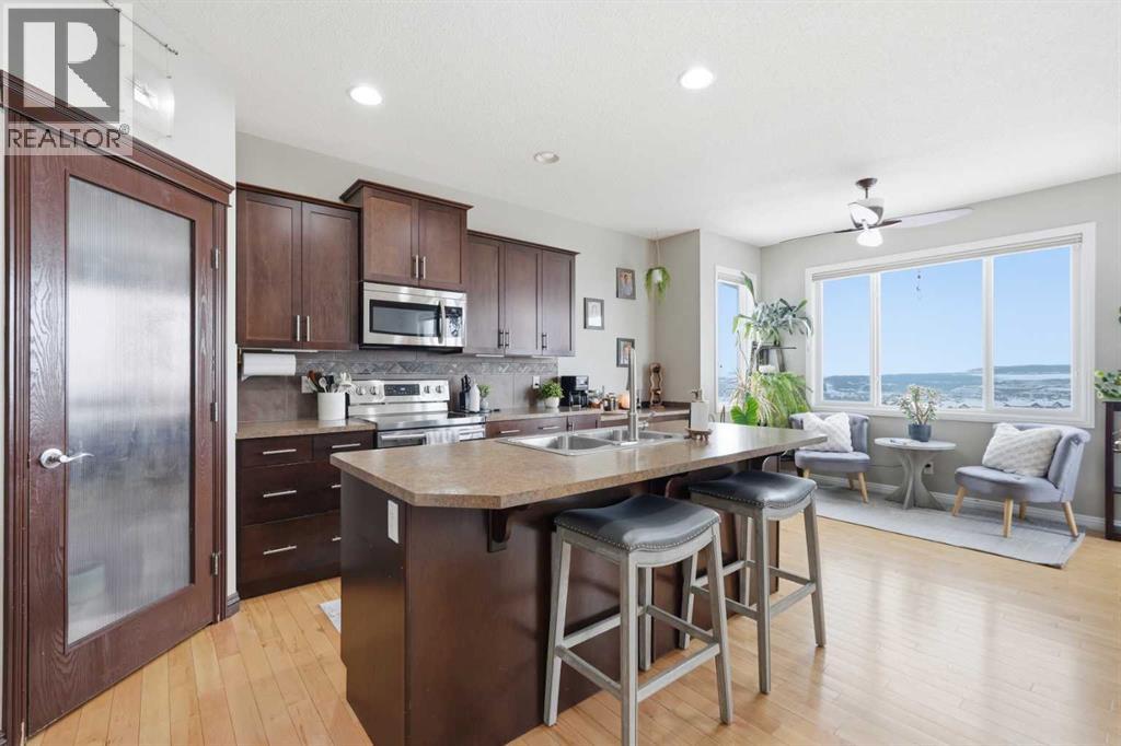 Properties like this don’t come along often. Situated on a quiet street in Sunset Ridge, this exceptional home rests on a sprawling PIE-SHAPED lot BACKING ONTO PATHWAYS AND GREEN SPACE, with UNOBSTRUCTED VIEWS of the Rocky Mountains. Inside, you are welcomed by a bright foyer with vaulted ceilings that leads into the open-concept kitchen, living, and dining area. This Jayman-built home features hardwood and tile flooring, maple cabinetry, upgraded appliances, a corner pantry, and a kitchen island, perfect for family gatherings. With a SOUTH FACING exposure, enjoy stunning views from all three levels all day long. Relax on the patio with a cool beverage or a BBQ while taking in the gorgeous mountain backdrop. The main floor also includes a home office with french doors, a half bathroom, and a mudroom. Upstairs, the freshly painted bonus room is perfect for family movie nights or a kids play area. The large primary suite offers breathtaking mountain views, a large walk-in closet, and a spa-inspired ensuite with a dual vanity, shower, and soaker tub. Two additional bedrooms and a full bathroom complete the upper level. The fully finished walk-out basement adds versatility with a fourth bedroom, 3pc bathroom, spacious rec/games area, and a fully finished laundry room with tons of storage. Direct access to the backyard makes it ideal for guests, teens, or multi-generational living. A double attached garage adds to daily convenience. Recent upgrades include: two A/C units, newer basement carpet and underlay, a newer stainless steel fridge, and hot tub wiring already in place. Solar panels provide long-term energy savings that significantly reduce electricity costs. Enjoy access to scenic walking paths, parks, schools, and local amenities, all while being just a short drive to the mountains and an easy commute to Calgary. Known for its elevated views, family-friendly atmosphere, and connection to nature, this is a community you’ll love coming home to. Imagine summer evenin gs here… the sun setting behind the mountains, kids playing in the yard, friends gathered on the patio, and nothing but open sky and nature behind you. This is the kind of backyard people wait years for. (id:63190)