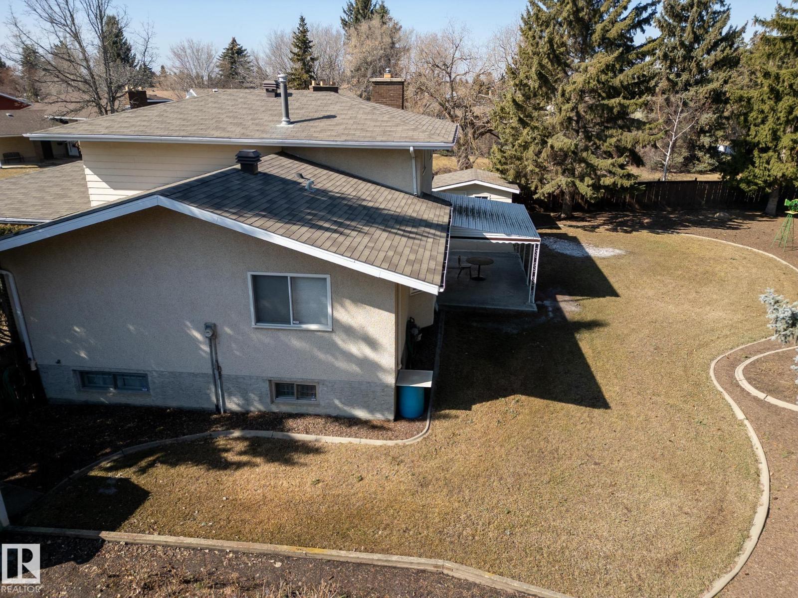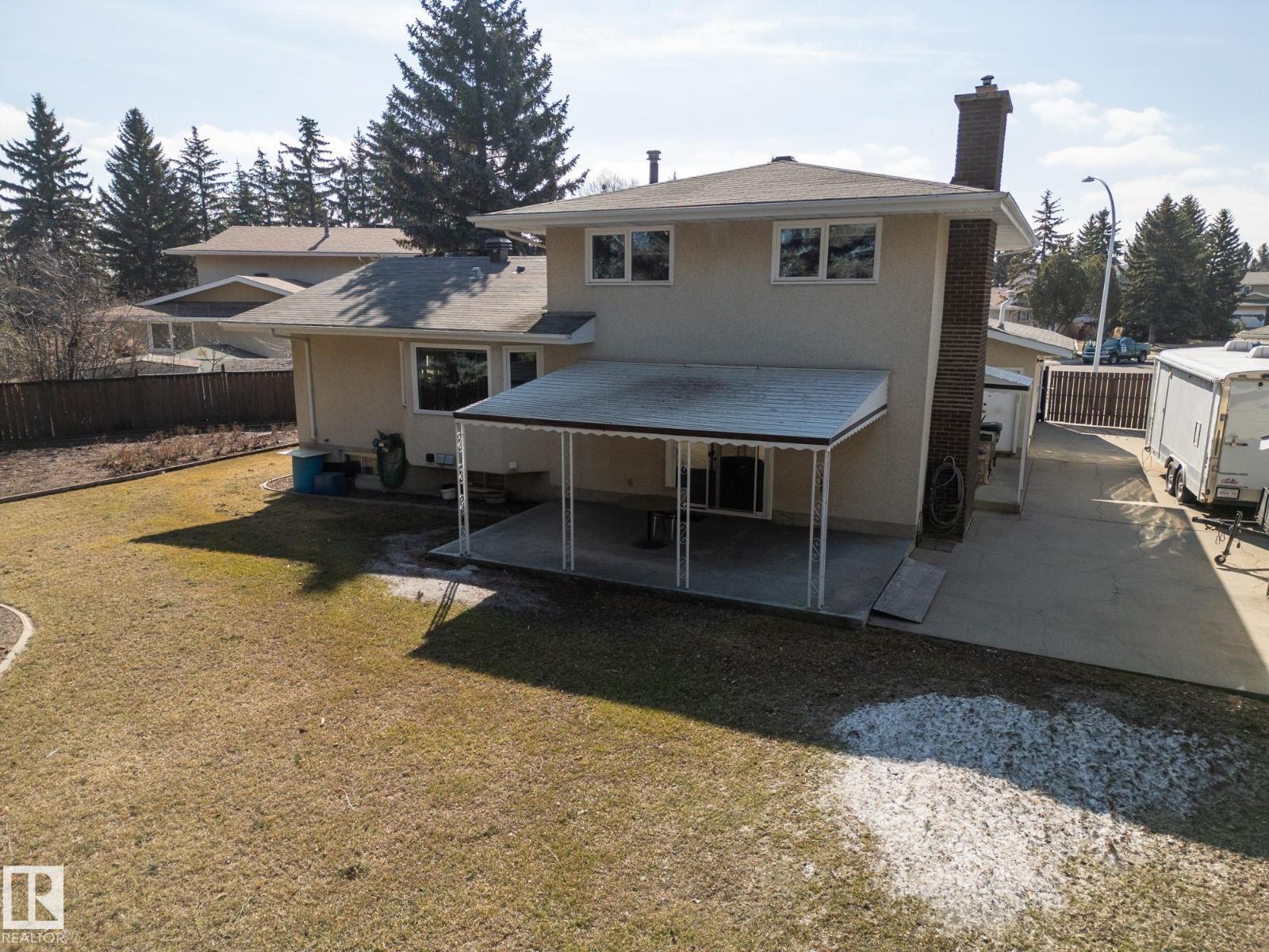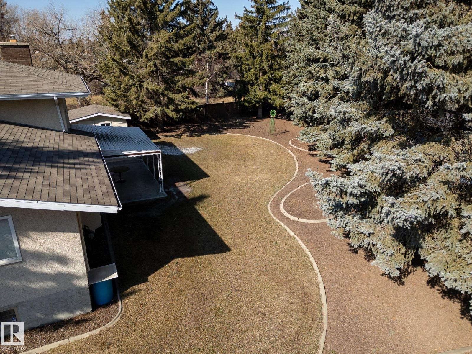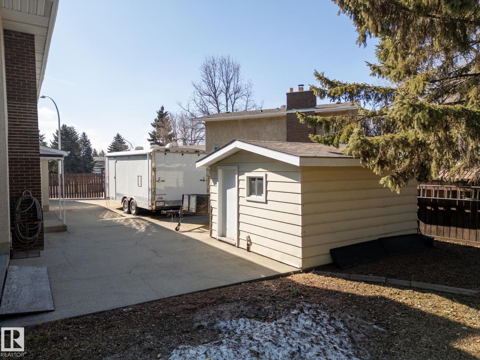 Situated on a rare, oversized pie lot, this 4-level split offers exceptional space, privacy, and mature trees that create a true backyard oasis. Boasting 2020 sqft plus a developed lower level with rec room, den and ample storage this home is perfect for growing families. The upper level features 3 spacious bedrooms, including a primary with 3-piece ensuite, while a 4th bedroom on the main floor adds flexibility. Enjoy a cozy gas fireplace, some newer appliances, upgraded attic insulation, and many updates including shingles, hot water tank, and most windows. The oversized heated double garage includes a floor drain and hot/cold taps, and there’s even RV parking plus two storage sheds—one with 220V wiring. The massive, private yard is truly the showstopper, offering endless potential for entertaining, gardening, or simply relaxing in your own secluded retreat. Close proximity to WEM, the Henday, transit, schools, parks and all kinds of amenities! Truly an ideal family home for a large or expanding family! (id:63190)