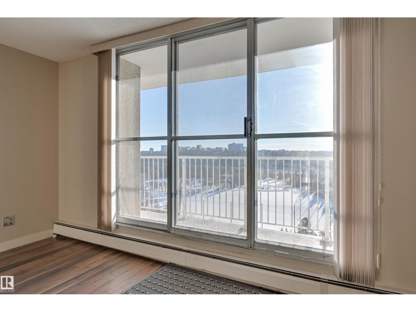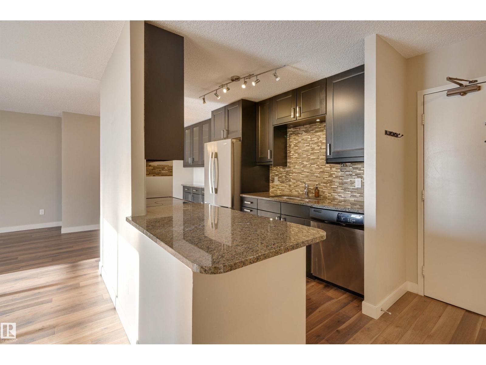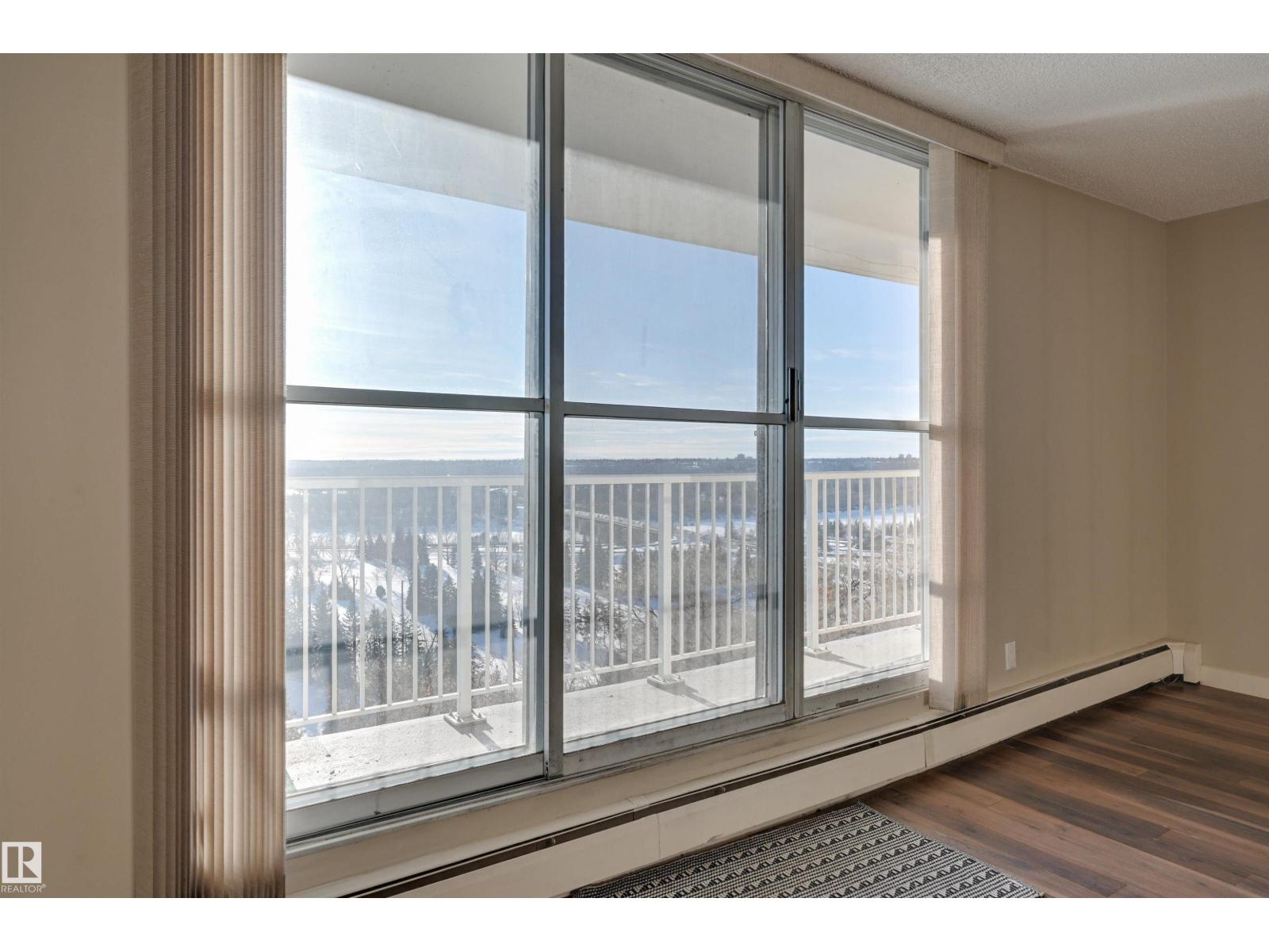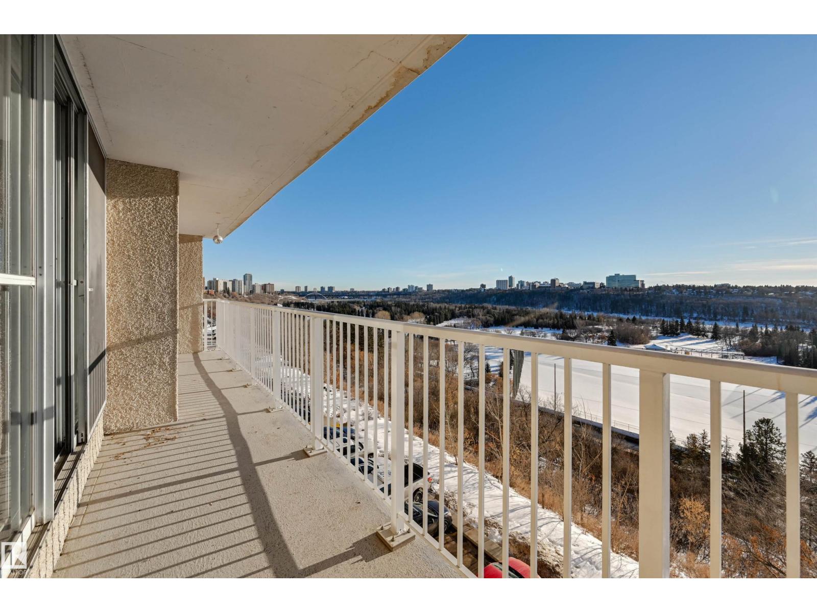 SPECTACULAR RIVER VALLEY VIEW from every window in this BRIGHT, COMPLETELY RENOVATED 1126 sq.ft. 2 bedroom 1.5 bathroom condo in TOP OF THE VALLEY conveniently located with transportation at your doorstep, close to unique shops, restaurants, coffee shops, Art Galleries, the Brewery District, the river valley walking/biking trails & quick access to the U of A. Spacious living room overlooking the river & access to the sunny south facing balcony. The gourmet kitchen is open to the living area with espresso color cabinetry, granite countertops, S/S appliances. The dining room has built-in cabinets. The primary suite is complete with a walk-in closet & a 2 piece bathroom. Spacious 2nd bedroom & a 4 piece bathroom with tile tub surround, new vanity & toilet. Laminate flooring throughout except for tile in the bathrooms. Large storage room. The condo fees include heat, water, power, laundry & underground parking. The building features a completely remodelled exercise room & lobby. Shows very well! (id:63190)
