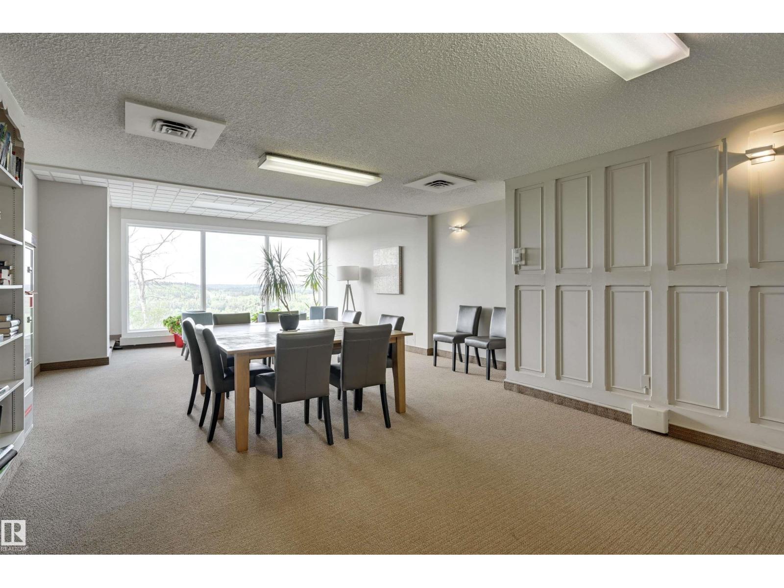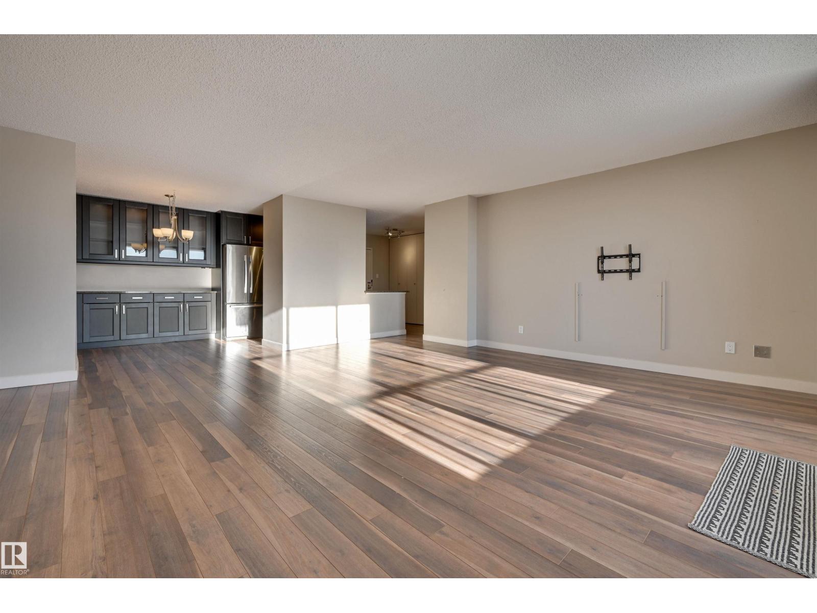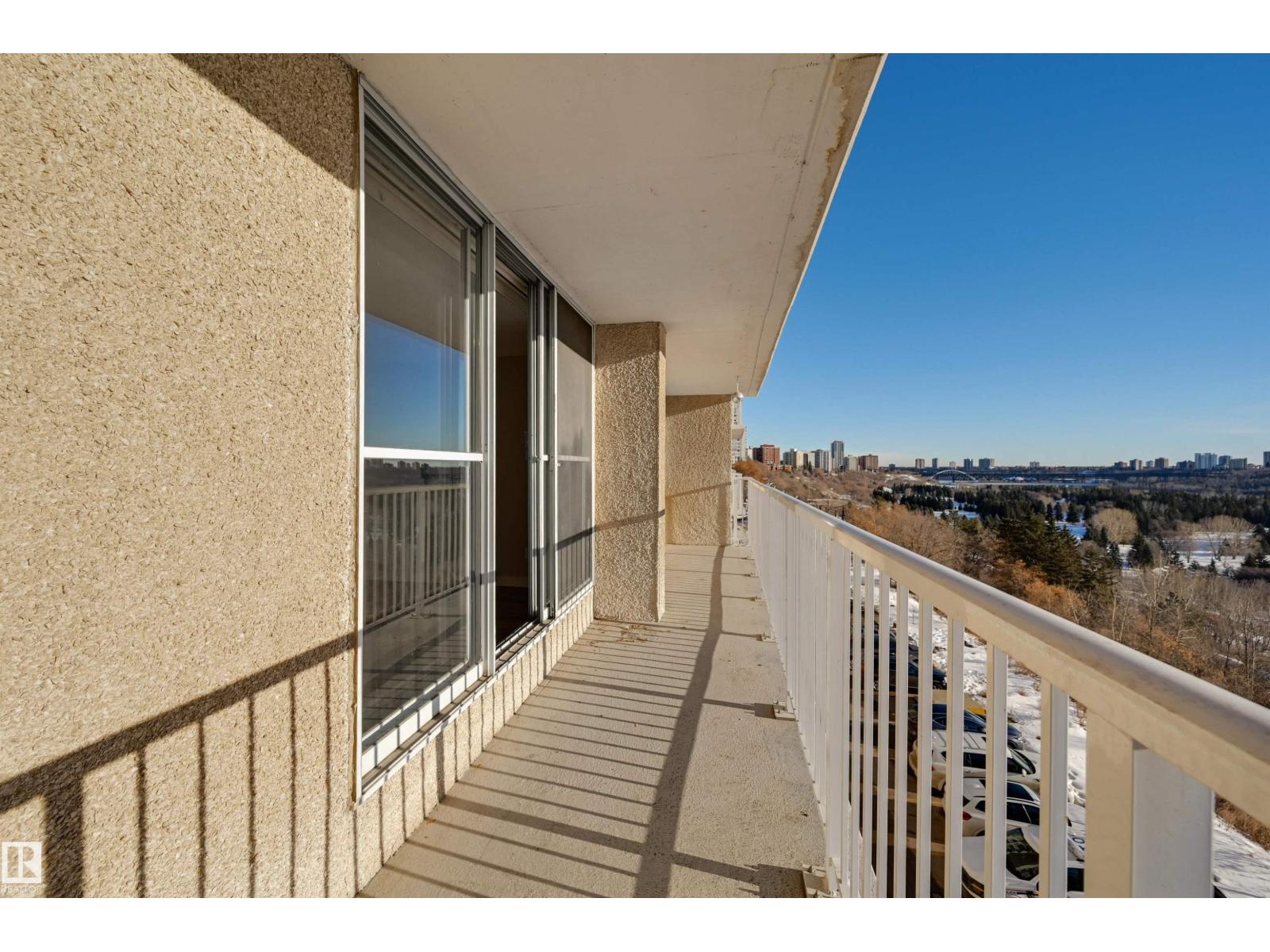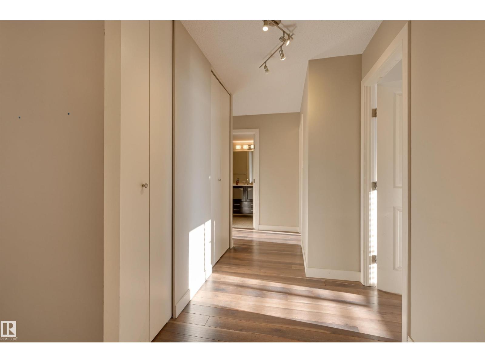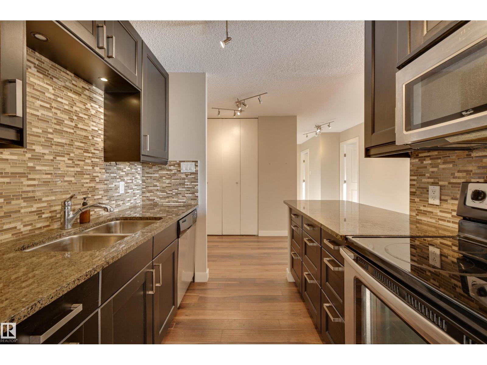 SPECTACULAR RIVER VALLEY VIEW from every window in this BRIGHT, COMPLETELY RENOVATED 1126 sq.ft. 2 bedroom 1.5 bathroom condo in TOP OF THE VALLEY conveniently located with transportation at your doorstep, close to unique shops, restaurants, coffee shops, Art Galleries, the Brewery District, the river valley walking/biking trails & quick access to the U of A. Spacious living room overlooking the river & access to the sunny south facing balcony. The gourmet kitchen is open to the living area with espresso color cabinetry, granite countertops, S/S appliances. The dining room has built-in cabinets. The primary suite is complete with a walk-in closet & a 2 piece bathroom. Spacious 2nd bedroom & a 4 piece bathroom with tile tub surround, new vanity & toilet. Laminate flooring throughout except for tile in the bathrooms. Large storage room. The condo fees include heat, water, power, laundry & underground parking. The building features a completely remodelled exercise room & lobby. Shows very well! (id:63190)