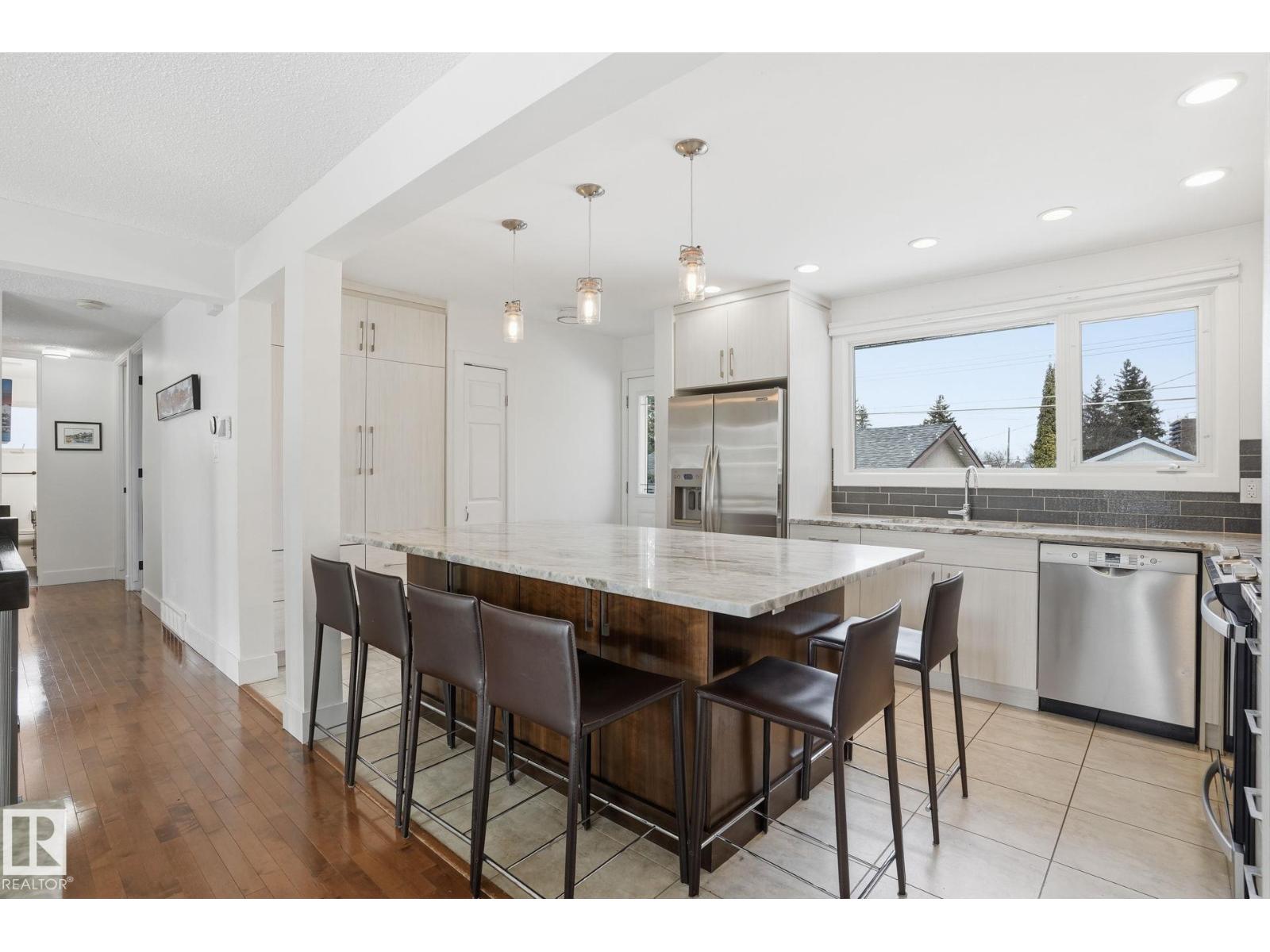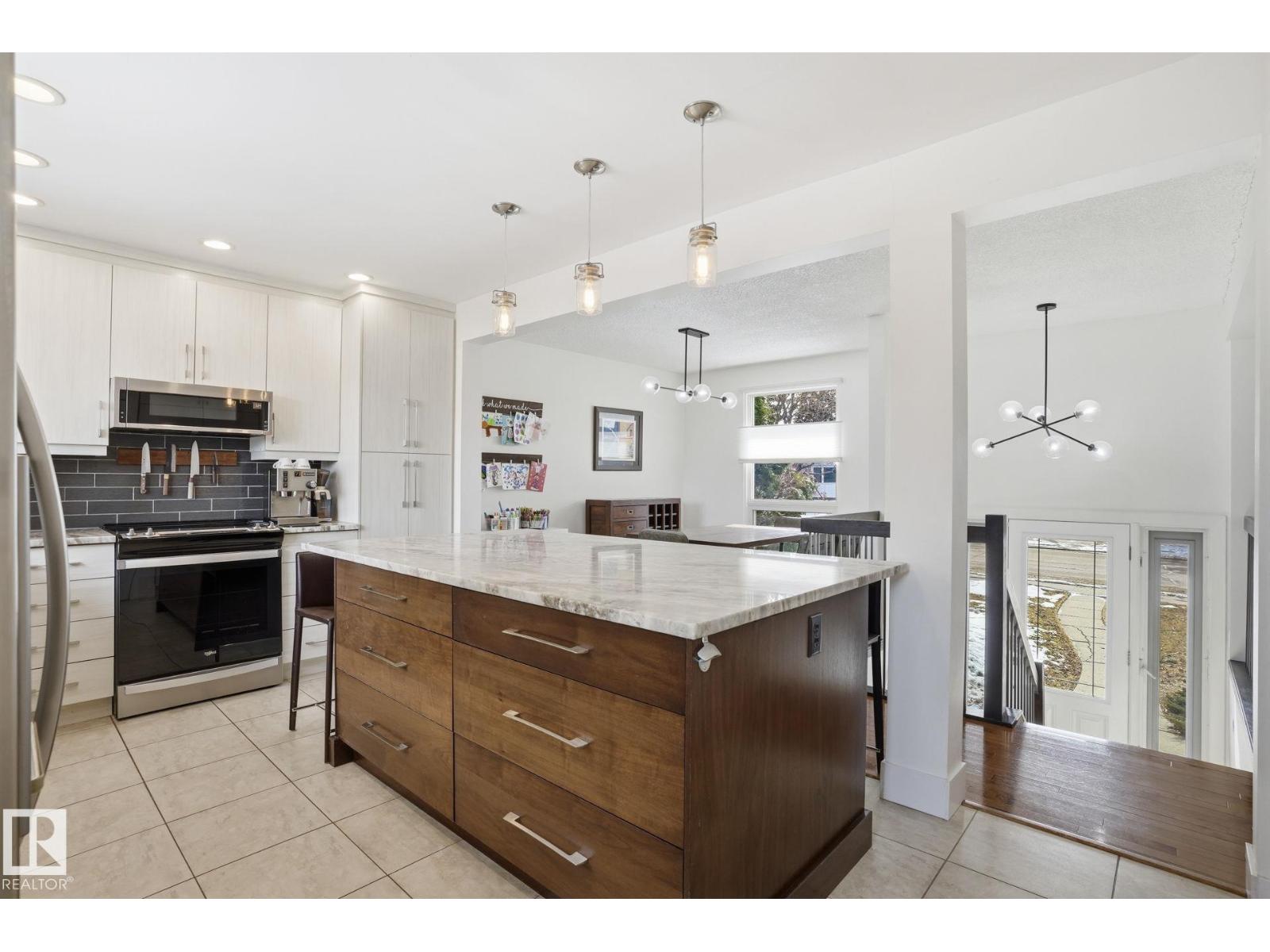 Experience the best of Aspen Gardens, a community known for its quiet streets, top-rated schools, and easy access to the Whitemud Creek Ravine trails. This bright, five-bedroom bi-level sits on a rare 72-foot-wide lot, offering a large, treed, and private backyard made possible through a leased city right-of-way. Inside, the main floor features an open-concept living area and a kitchen highlighted by a massive granite island, perfect for family gatherings and entertaining. 8-foot solid core doors and hardwood floors add a distinct touch to the main level, while both bathrooms have been recently renovated. With five total bedrooms, there is plenty of space for a growing family. Features include new mechanical systems (A/C, water heater, and furnace), updated roof and windows, and an oversized double garage. Located within walking distance to Westbrook Elementary and Vernon Barford Junior High, this home is a perfect opportunity to join one of Edmonton’s most family-friendly neighborhoods. (id:63190)