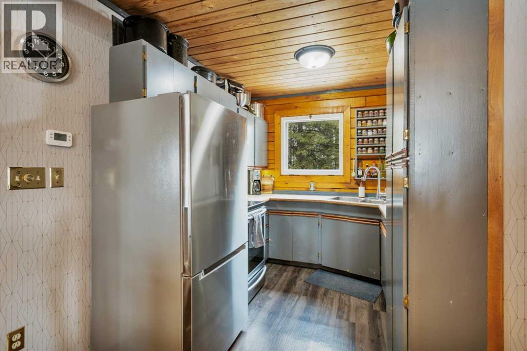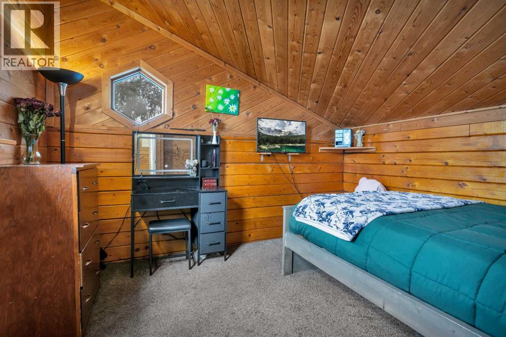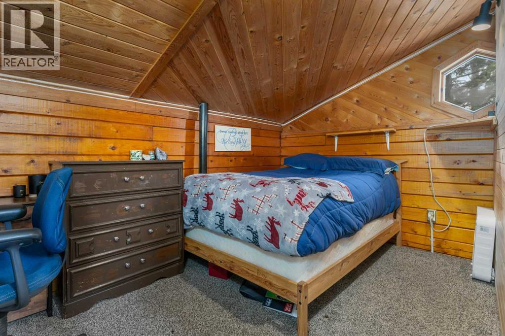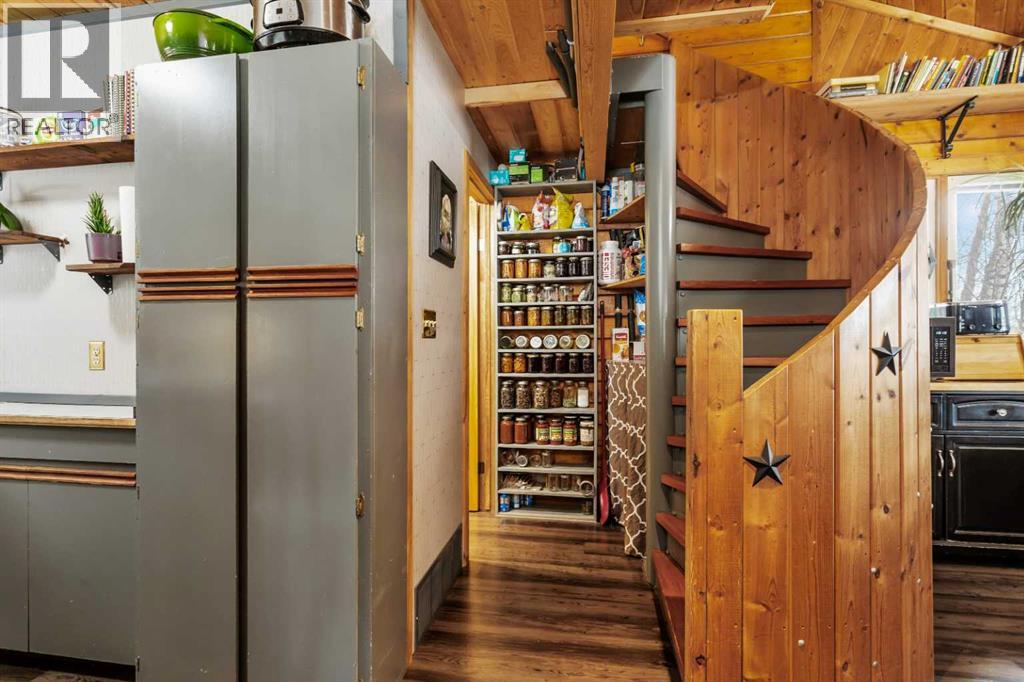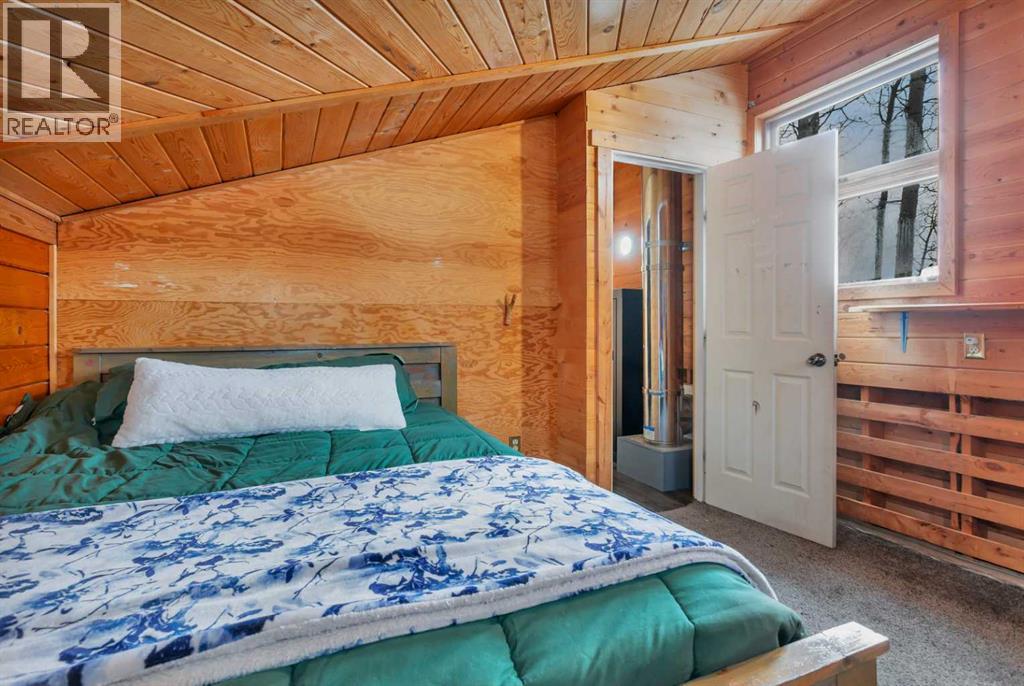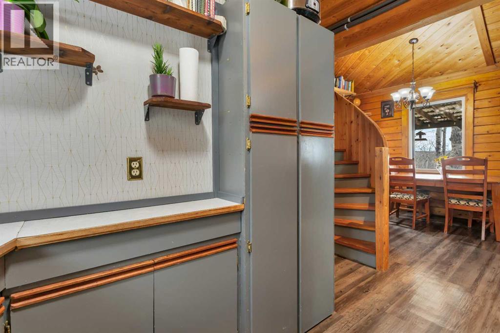 Tucked into nature just over 16 km west of Rocky Mountain House, this charming 880 sq ft D-style log home offers peaceful living with stunning views of forest, the North Saskatchewan River, and the mountains. Full of warmth and character, this thoughtfully designed tiny home blends rustic appeal with cozy functionality.The main floor features a welcoming living and dining area centered around a free-standing wood stove, a functional U-shaped kitchen, one bedroom, a 4-piece bathroom, and convenient stackable washer/dryer. Cottage-core details shine throughout, including built-in spice racks and dedicated canning storage.Upstairs, the original loft has been enclosed to create two small private bedrooms, accessed by a spiral staircase. The utility room is located in the crawl space and accessed from outside.A south-facing porch extends your living space outdoors—perfect for entertaining or simply relaxing while taking in the peaceful country setting.Perfect for nature lovers and foraging enthusiasts, the property is rich with wild berries and herbs. An ATV trail leads to the lower portion of the acreage, where you’ll find a large garden area. The upper yard is set up for enjoying the outdoors, complete with a firepit, storage shed, greenhouse, and chicken coop.Whether you're dreaming of a small-scale homestead or a quiet weekend retreat, this unique log home offers a true connection to nature and simple country living. (id:63190)