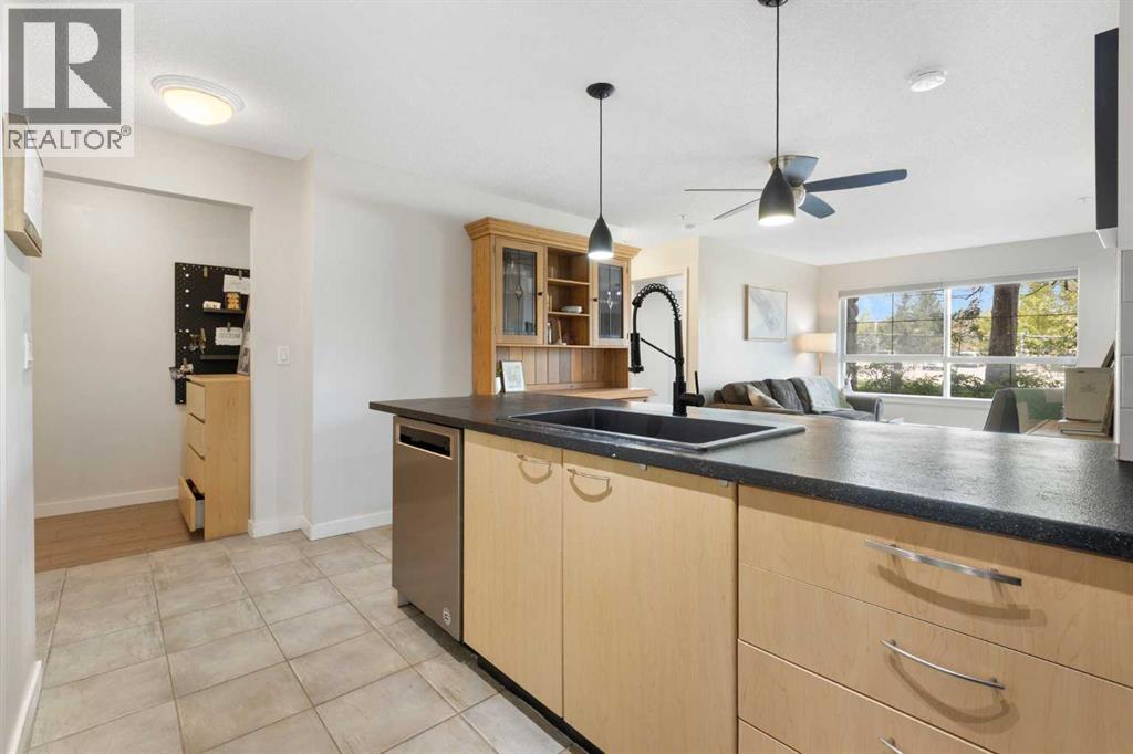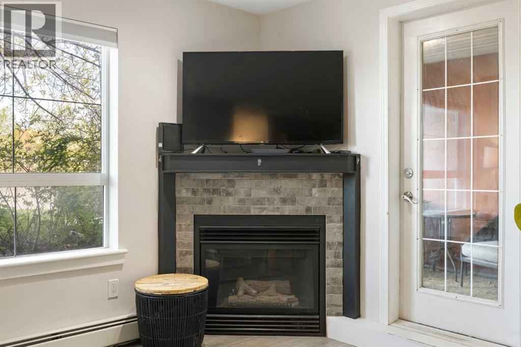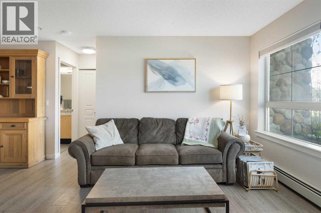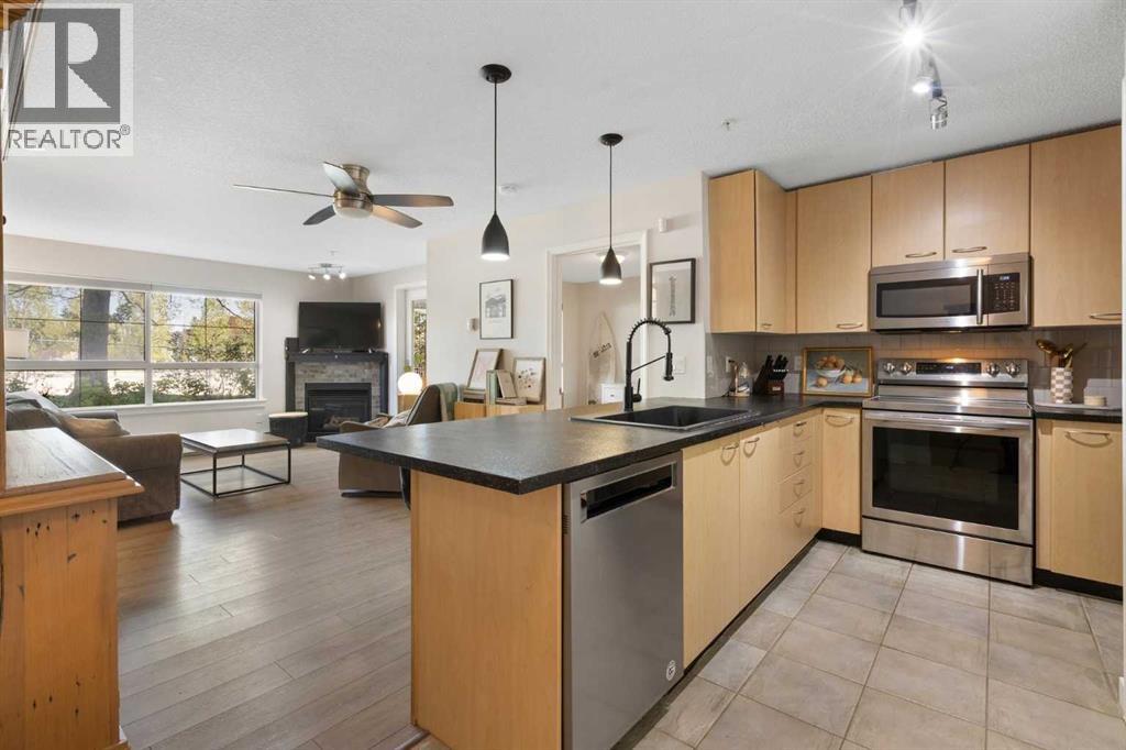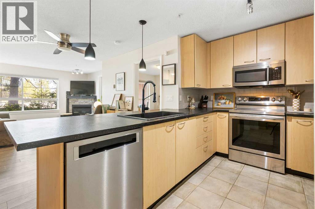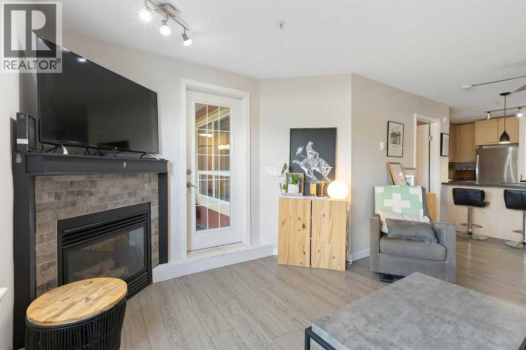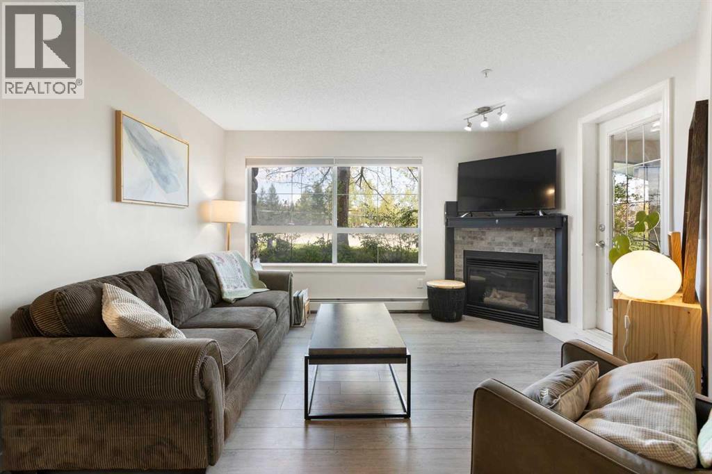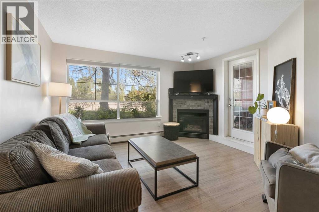 WELCOME HOME – amenities galore! This spacious and beautifully updated main floor unit features 2 bedrooms and 2 bathrooms, offering an ideal layout with bedrooms split by a spacious living and dining area. The unit opens up with a large front entryway, open-concept living, and stylish finishes throughout including newer vinyl plank flooring and a fresh modern colour palette. The well-appointed kitchen features upgraded stainless steel appliances, pantry, and plenty of cabinetry. The bright living room is highlighted by large windows and a cozy corner gas fireplace and opens onto a generous covered patio that backs onto green space—ideal for relaxing or for owners looking for easy outdoor access. The large primary bedroom includes a 4-piece ensuite, a walkthrough closet & a window overlooking the patio. A second bedroom sits across from a 3 piece bath, perfect for guests or roommates. There's also flexible den space—ideal for a home office or extra storage. Additional features include 2 titled underground parking stalls, in-suite laundry, and access to premium building amenities such as a fitness centre, party room, bike storage, visitor parking, and a beautiful private courtyard. Ideally located just steps from Mount Royal University, with easy access to Stoney Trail, Crowchild Trail, Glenmore Trail, downtown, and within walking distance to transit, coffee shops, restaurants, and shopping—this is a fantastic opportunity for first-time buyers, students, investors, or those looking to downsize without compromising lifestyle. Get in touch today and snag one of the best units in the building! (id:63190)