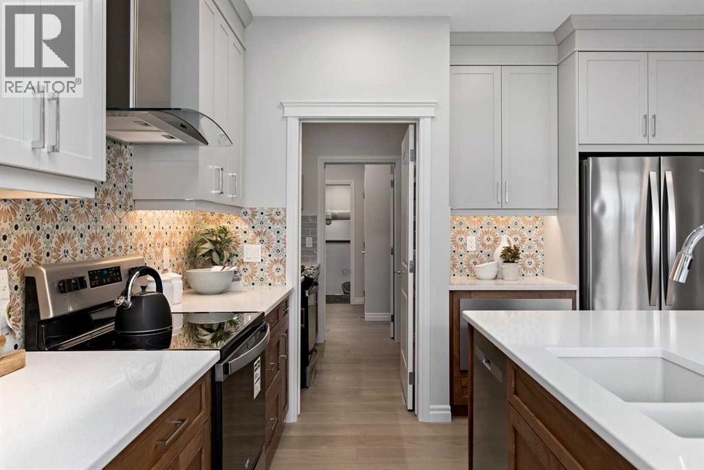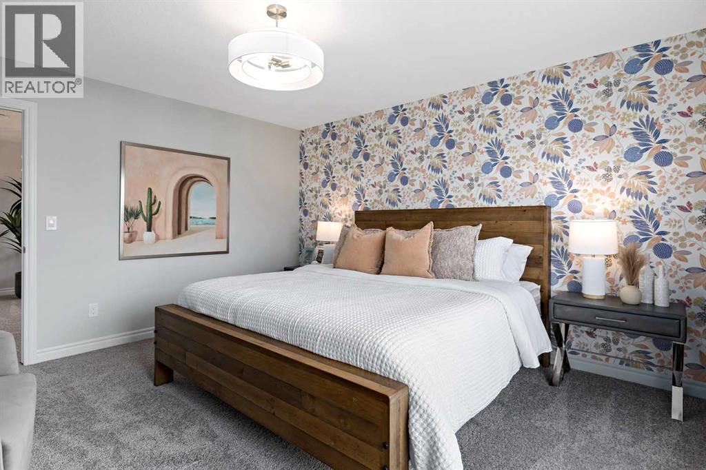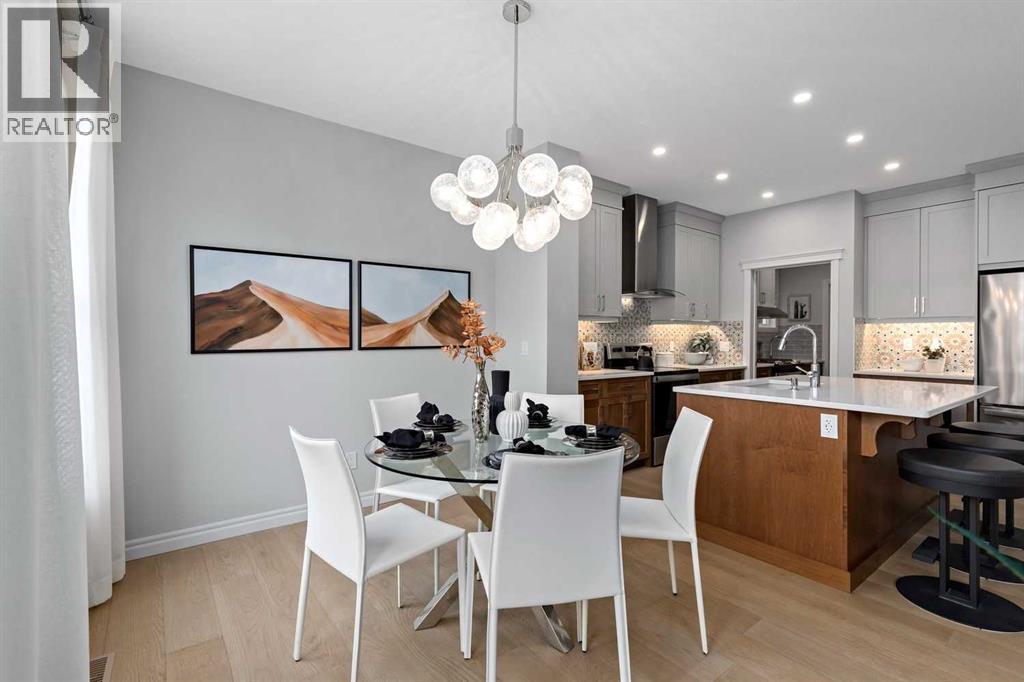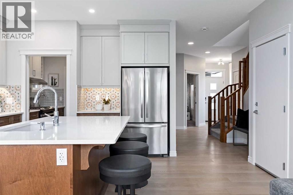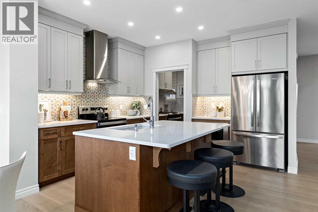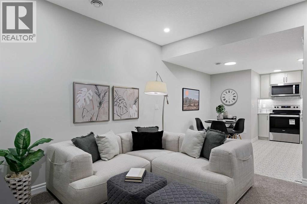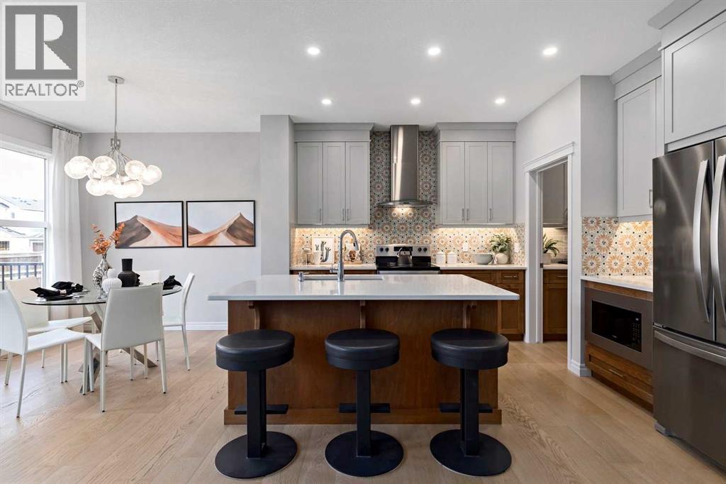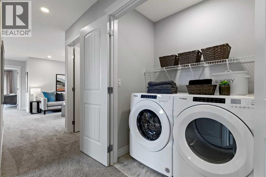 Welcome to 293 Homestead Terrace NE, a beautifully finished showhome offering 2,325 sq. ft. above grade plus a fully developed 2-bedroom legal basement suite, providing exceptional flexibility for large or multi-generational families. Featuring 7 bedrooms and 5 bathrooms, this thoughtfully designed home blends modern finishes, functional living space, and investment potential in the growing community of Homestead.This property also presents a rare leaseback opportunity, allowing the builder to lease the home from the purchaser for approximately two years while continuing to maintain the property in pristine showhome condition. Immediate possession is available, with key release anticipated early to mid-2027.The main floor showcases engineered hardwood flooring and an open-concept layout designed for everyday living and entertaining. The kitchen features 1-¼” quartz countertops, two-tone cabinetry extended to the ceiling, and an upgraded chimney hood fan with built-in microwave. A fully equipped spice kitchen with gas range offers additional functionality, ideal for preparing meals while keeping the main kitchen organized. The living room is highlighted by a modern electric fireplace, creating a warm and inviting focal point. A main floor bedroom with full bathroom offers excellent flexibility for guests or extended family, while the flex room provides space for a home office or additional sitting area.Upstairs, the home offers 5 bedrooms above grade, including dual primary suites, making it ideal for growing families. The main primary retreat features a spacious walk-in closet and a beautifully appointed ensuite with double vanity and soaking tub. Secondary bedrooms are generously sized, and the central loft/bonus room provides valuable additional living space. Tile flooring enhances the upper bathrooms and laundry room, while plush carpet adds comfort throughout the bedrooms and upper floor.The 2-bedroom legal basement suite includes a separate entrance, fu ll kitchen, living area, bathroom, and dedicated laundry, offering excellent potential for rental income or private living space for extended family.Additional highlights include central air conditioning, front yard landscaping, lino flooring in basement kitchen and bath areas, and a 21’ x 20’ double attached garage with man door. The 12’ x 10’ rear deck with steps to grade provides an ideal outdoor space for relaxing or entertaining.Located close to parks, playgrounds, walking paths, and future amenities, this home offers both comfort and convenience. With premium upgrades, a legal suite, and leaseback income potential, 293 Homestead Terrace NE presents a unique opportunity to own a professionally finished showhome designed for modern living. *All furniture, window coverings and appliances are included. Excluded: the art/decor and sonos sound system. (id:63190)