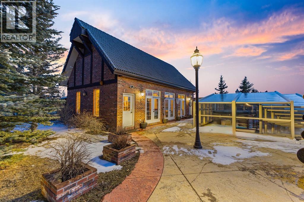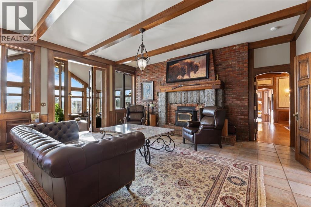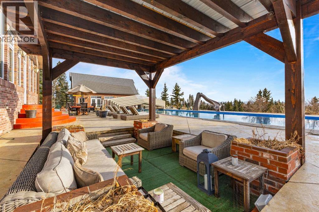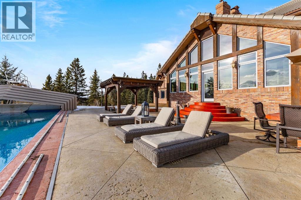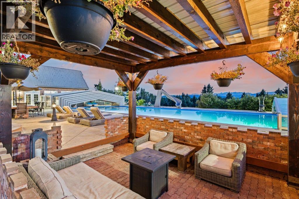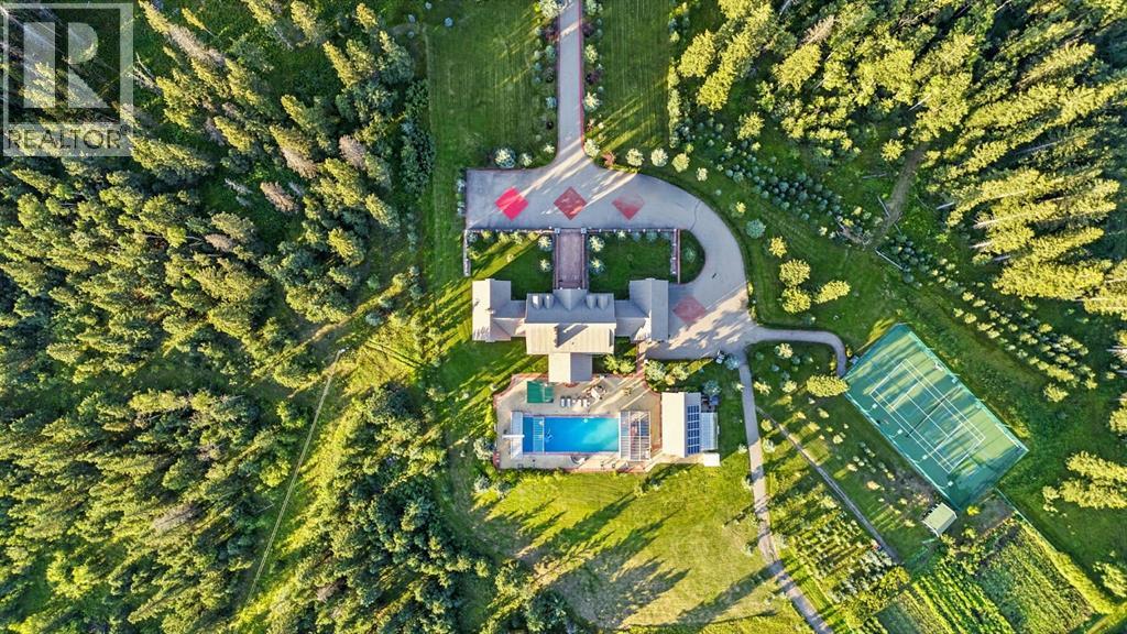 This is a rare and exceptional opportunity to own a 192-acre estate in the highly sought-after Millarville area. Perched at an elevation of 5,000 feet, this extraordinary property offers breathtaking mountain views and an array of premium amenities. At its heart lies a custom-built, European-style two-story residence, thoughtfully designed for both luxury living and recreation. Spanning over 8,000 sq. ft., the stately brick residence features seven bedrooms and 6/2 bathrooms, including five en-suites. The home offers a formal study, an elegant dining room, a main-floor primary suite (with an additional primary suite on the second level), and private nanny quarters. A stunning sunroom with floor-to-ceiling windows provides an idyllic space to take in the breathtaking views of the pool and Rocky Mountains. Meticulously crafted with exceptional detail, the home showcases custom hand-carved woodwork, coffered ceilings, four fireplaces (one wood-burning and three gas), and a combination of hardwood and custom tile flooring. Italian marble finishes add a touch of sophistication to most bathrooms. The chef’s kitchen, features an open-concept layout with beamed ceilings, a unique brick island and dining table, a rare AGA range and high-end built-in appliances blend seamlessly with the custom cabinetry. The main-floor primary suite is a true retreat, boasting a grand gas fireplace, spectacular mountain views, and an opulent ensuite with separate his-and-her bathrooms, walk-in closets, dual showers, and a stunning clawfoot tub as the centrepiece. The estate is designed for year-round enjoyment, featuring a 24x80 heated outdoor saltwater pool enclosed within a custom glass structure. This impressive pool—measuring four meters at its deepest point—includes a 10-foot diving board, a slide, and panoramic 180-degree mountain views. Heated flooring surrounds the pool area, while a beautifully designed pergola provides the perfect space for entertaining. Adjacent to the pool , the pool house offers added convenience, complete with a kitchenette, a loft, washer/dryer, a/c, and a bathroom featuring a steam shower. For sporting enthusiasts, the property boasts world-class shooting facilities, including: Rifle ranges, Skeet shooting range, Olympic double shooting range, Rabbit clay setup, High sporting clay doubles and mini doubles. Dirt bike riders will appreciate the professionally designed 2-3 km motocross track, featuring 60-80 jumps at the northern end of the property. Equestrian enthusiasts will find 20 acres of open fields, ideal for grazing. Nearby, a 2-3 acre pond—equipped with aerators and stocked with 800 trout—adds to the property’s natural beauty. Additionally the Estates features include a Tennis court, a 40x20 carriage house (easily convertible into a barn with dutch doors) with an upstairs man cave, a 80x30 quonset, and a Charming 300 sq. ft. log cabin with loft and wood-burning fireplace. This one-of-a-kind property must be seen to be truly appreciated. (id:63190)