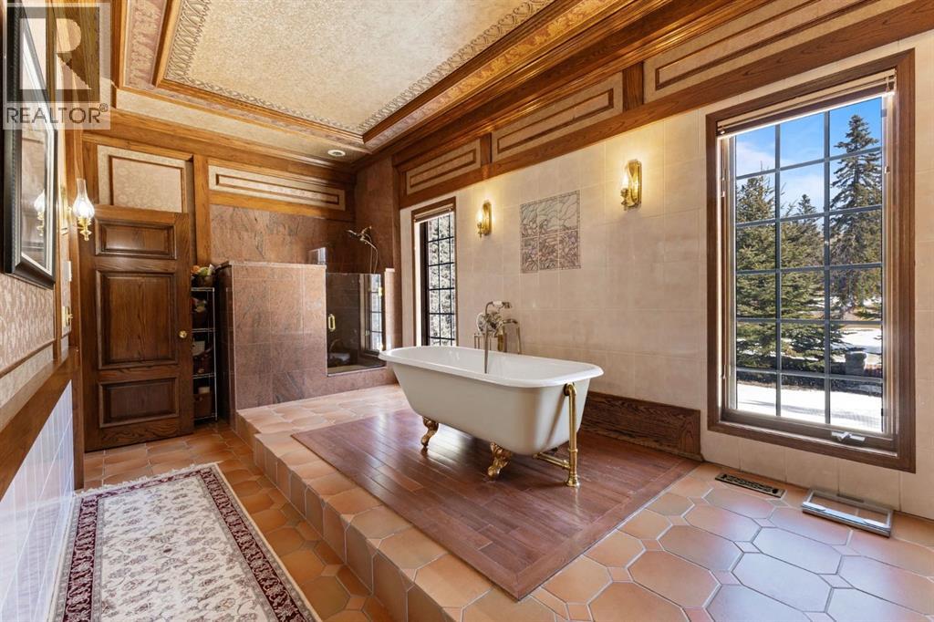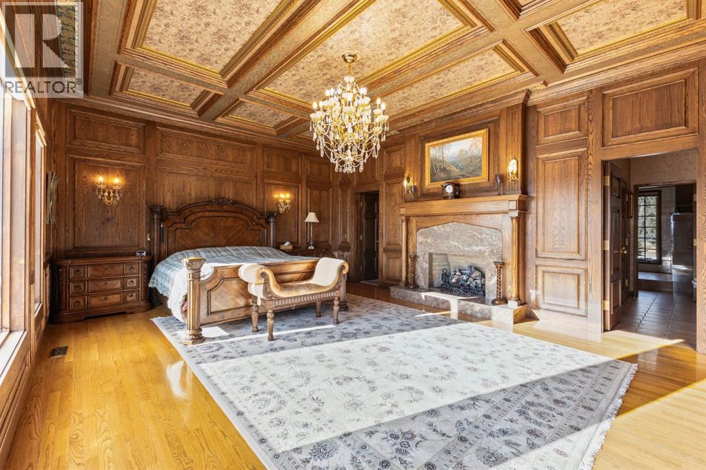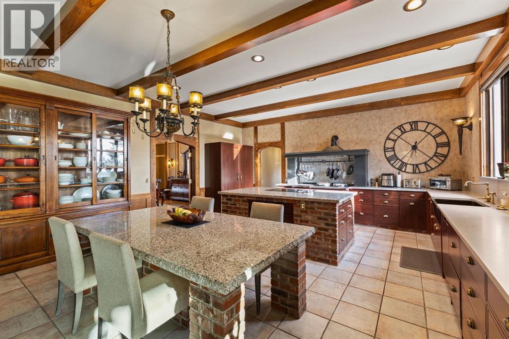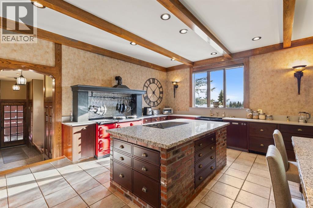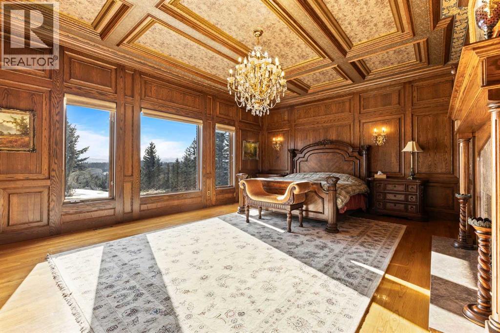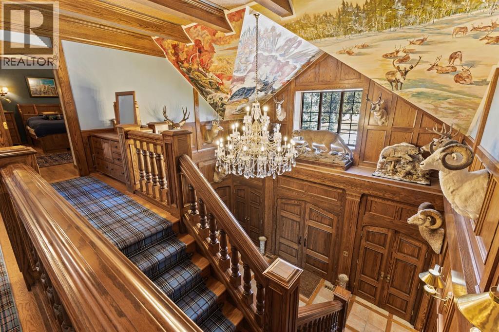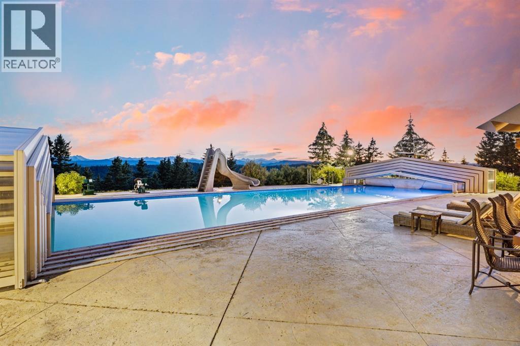 This is a rare and exceptional opportunity to own a 192-acre estate in the highly sought-after Millarville area. Perched at an elevation of 5,000 feet, this extraordinary property offers breathtaking mountain views and an array of premium amenities. At its heart lies a custom-built, European-style two-story residence, thoughtfully designed for both luxury living and recreation. Spanning over 8,000 sq. ft., the stately brick residence features seven bedrooms and 6/2 bathrooms, including five en-suites. The home offers a formal study, an elegant dining room, a main-floor primary suite (with an additional primary suite on the second level), and private nanny quarters. A stunning sunroom with floor-to-ceiling windows provides an idyllic space to take in the breathtaking views of the pool and Rocky Mountains. Meticulously crafted with exceptional detail, the home showcases custom hand-carved woodwork, coffered ceilings, four fireplaces (one wood-burning and three gas), and a combination of hardwood and custom tile flooring. Italian marble finishes add a touch of sophistication to most bathrooms. The chef’s kitchen, features an open-concept layout with beamed ceilings, a unique brick island and dining table, a rare AGA range and high-end built-in appliances blend seamlessly with the custom cabinetry. The main-floor primary suite is a true retreat, boasting a grand gas fireplace, spectacular mountain views, and an opulent ensuite with separate his-and-her bathrooms, walk-in closets, dual showers, and a stunning clawfoot tub as the centrepiece. The estate is designed for year-round enjoyment, featuring a 24x80 heated outdoor saltwater pool enclosed within a custom glass structure. This impressive pool—measuring four meters at its deepest point—includes a 10-foot diving board, a slide, and panoramic 180-degree mountain views. Heated flooring surrounds the pool area, while a beautifully designed pergola provides the perfect space for entertaining. Adjacent to the pool , the pool house offers added convenience, complete with a kitchenette, a loft, washer/dryer, a/c, and a bathroom featuring a steam shower. For sporting enthusiasts, the property boasts world-class shooting facilities, including: Rifle ranges, Skeet shooting range, Olympic double shooting range, Rabbit clay setup, High sporting clay doubles and mini doubles. Dirt bike riders will appreciate the professionally designed 2-3 km motocross track, featuring 60-80 jumps at the northern end of the property. Equestrian enthusiasts will find 20 acres of open fields, ideal for grazing. Nearby, a 2-3 acre pond—equipped with aerators and stocked with 800 trout—adds to the property’s natural beauty. Additionally the Estates features include a Tennis court, a 40x20 carriage house (easily convertible into a barn with dutch doors) with an upstairs man cave, a 80x30 quonset, and a Charming 300 sq. ft. log cabin with loft and wood-burning fireplace. This one-of-a-kind property must be seen to be truly appreciated. (id:63190)