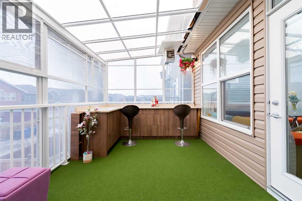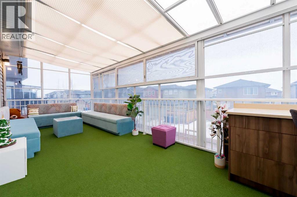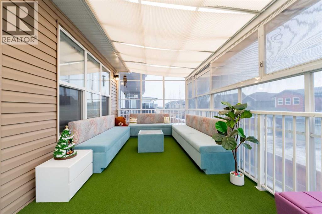 *** Watch the Virtual Video Tour***. Fully developed with a walkout basement, approximately 3,300 sq. ft. of total developed living space, two three-season sunrooms (approx. 450 sq. ft.), a 6.4 kW solar panel system (16 panels), a 200-amp electrical panel, epoxy flooring in the garage, and low-maintenance artificial turf in the backyard—features like these are rarely found at this price point**. Welcome to this beautifully upgraded home in the highly sought-after community of Evanston, situated on a traditional 35-ft-wide lot and offering approximately 3,300 sq. ft. of fully developed living space. The main floor features a private office/den, a spacious, sun-filled living area with large windows, a dining area with custom seating, and elegant high-end laminate flooring, complemented by 9-foot ceilings. The chef’s kitchen is designed to impress, featuring quartz countertops, under-cabinet lighting, ceiling-height cabinetry, and premium stainless-steel appliances, including a Bosch built-in oven and microwave. A walk-through pantry with durable titanium wire shelving adds everyday convenience. A convenient half bath (with potential to convert to a full bath) and a three-season sunroom just off the living room complete the main level. Upstairs, a large bonus room sits centrally, thoughtfully separating the primary bedroom from the two additional bedrooms. This bonus space includes custom seating—perfect for movie nights or family gatherings. The primary bedroom offers a walk-in closet, a luxurious 5-piece ensuite with dual sinks, a custom standing shower, and a soaker tub. Two additional well-sized bedrooms, an upper-floor laundry room, and a second full bathroom featuring dual sinks and a standing shower with a custom tile base complete the upper level. The fully developed walkout basement offers a wet bar, a four-piece bathroom, and a spacious recreation area ideal for a home theatre, gym, or playroom. A SONOS 7.1 home theatre speaker system and an electric fireplac e add comfort and entertainment value. The walkout layout also provides excellent potential to convert the basement into a legal suite (subject to City approval). Located in the vibrant, family-friendly community of Evanston, this home offers easy access to Stoney Trail, top-rated public and Catholic schools (including a new middle school opening soon), parks, walking paths, and nearby shopping centres. Recent updates include: roof and siding (2024), new carpet (2025), and fresh interior paint (2025). A water purifier, water softener, and home theatre system are included in the sale. This home stands out not only for its luxury finishes but also for its energy-efficient upgrades. The 6.4 kW solar panel system (16 panels) significantly reduces electricity costs, offering long-term savings and protection against rising energy prices—an increasingly valuable feature for today’s discerning buyers. Don’t miss this exceptional opportunity—book your private showing today! (id:63190)