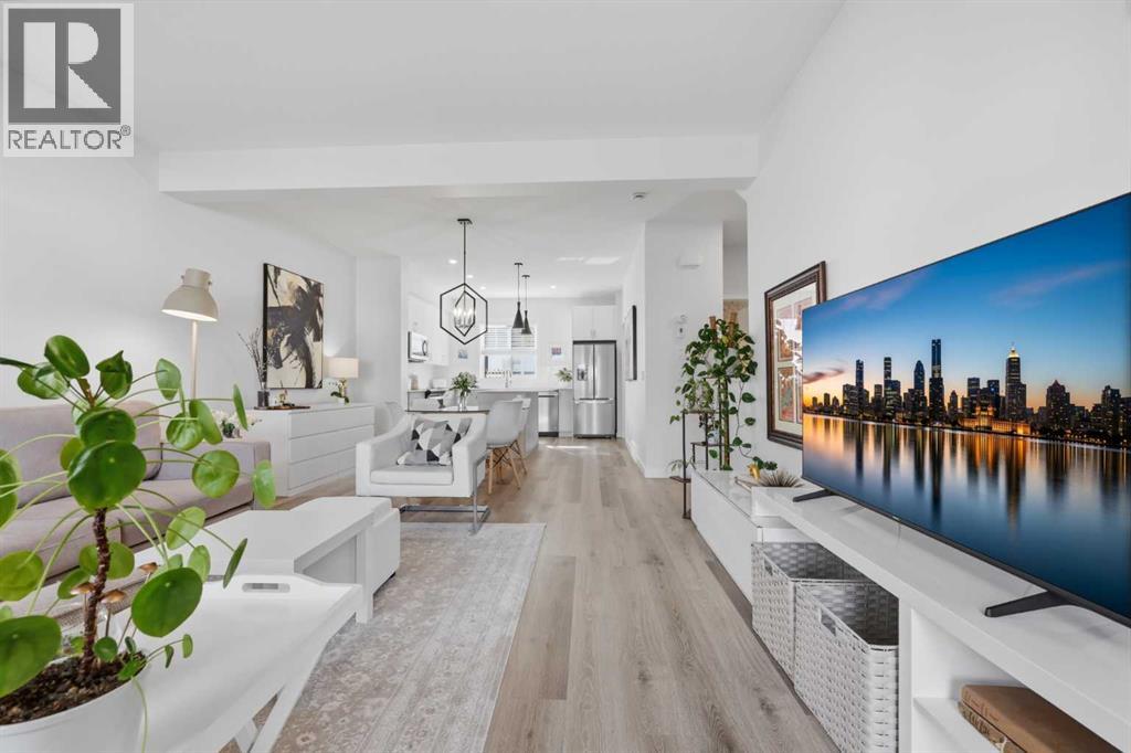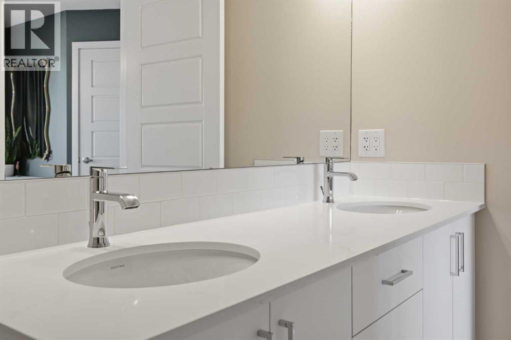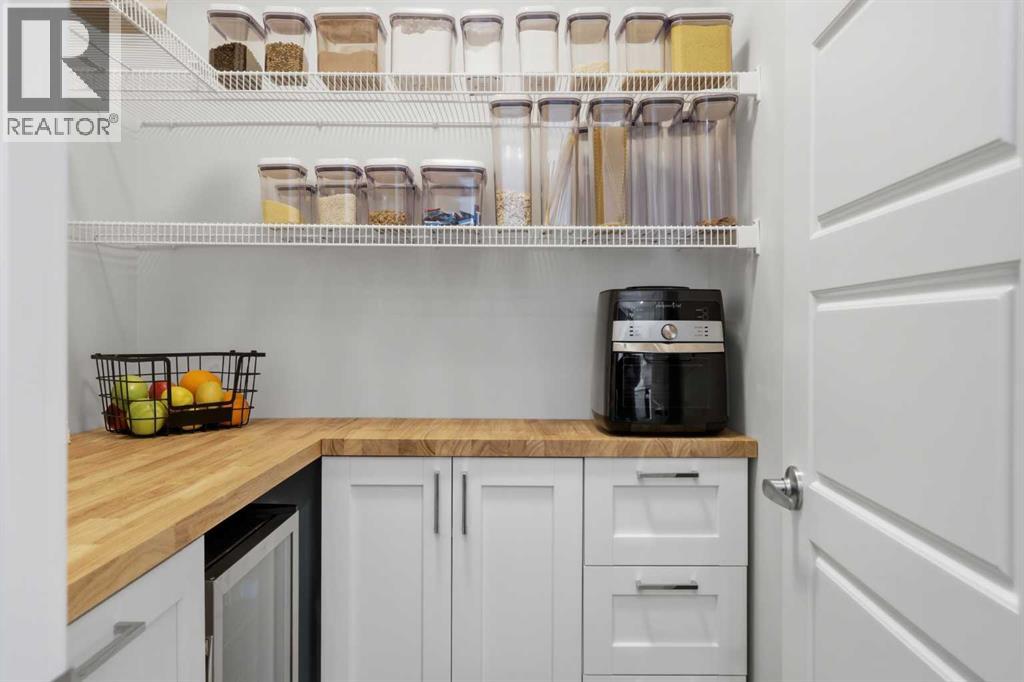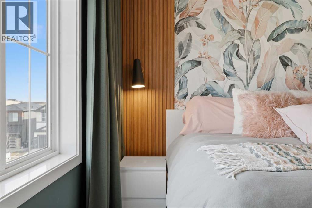 Welcome to Ambleton Mews! This home is designed to feel more like a detached house than a typical townhouse. With over 1,600 square feet, it offers wide, bright living spaces, modern style, smart design, and a long list of features across three finished levels. The entry-level sets the tone immediately, featuring a double-attached heated garage with under-stair storage, and a versatile bonus room that's perfectly suited as a home office, guest suite, or den. Upstairs on the main floor, you'll immediately notice the quality of finishes. The open-concept kitchen, dining, and living area is anchored by dual-tone cabinetry, topped with polished White Macchiato quartz countertops. A full suite of stainless steel Whirlpool appliances includes a French-door refrigerator with water dispenser, an electric range with air fryer, a built-in dishwasher, and an over-the-range microwave. The striking white chevron tile backsplash runs full height, and elevated 42" upper cabinets maximize every inch of storage. Black pendant lighting over the island and a matching chandelier in the dining area add a designer edge. Just off the kitchen, the walk-in pantry has been upgraded well beyond the standard, featuring cabinetry, butcher block countertop, bar fridge, and wire shelving. It's a true butler's pantry that will impress even the most discerning chef. A private balcony off the main floor is roughed in with a natural gas line, ideal for year-round entertaining. The main-floor powder room has been finished with charming board-and-batten wainscoting and delicate floral wallpaper, elevating what is often an afterthought into a genuinely stylish space. The upper floor is a highlight of this home. The primary bedroom feels like a peaceful retreat, with a wood-slat and wallpaper accent wall and elegant wall sconces for a boutique-hotel feel. The walk-in closet has a custom built-in system with double and single hanging sections, open shelves, and a dresser with drawers. The four-piece ensui te bathroom features a dual vanity with quartz countertops, polished chrome Moen fixtures, Calacatta porcelain tiles, and a glass-enclosed shower for a spa-like experience. There are two additional bedrooms on this floor, sharing a four-piece main bathroom with the same quality tile and fixtures. The laundry area is also upstairs, with a stacked Whirlpool front-load washer and dryer for convenience. Throughout the home, LVP flooring flows across the main level and flex areas in a warm tone, while plush carpet adds comfort in all bedrooms. Window coverings and blinds are included on every window, move-in ready from day one. Outside, the community offers a great quality of life. Scenic pathways wind around the nearby storm pond. There is a future school site nearby, and well-maintained paths connect parks, playgrounds, and green spaces woven throughout the area. Ambleton is a community thoughtfully designed for an active, connected way of life. (id:63190)