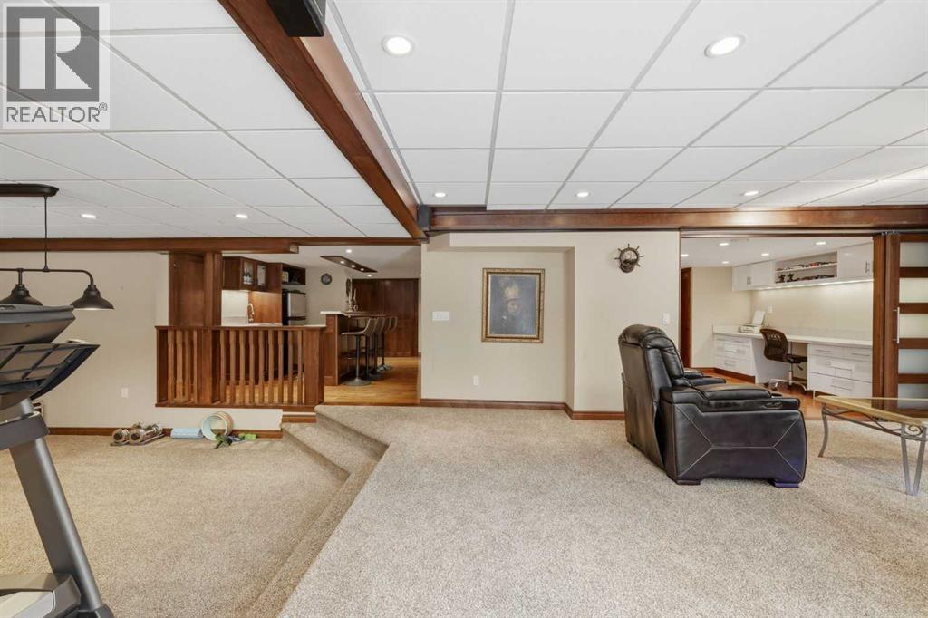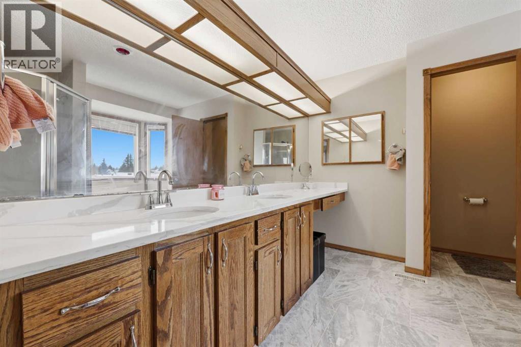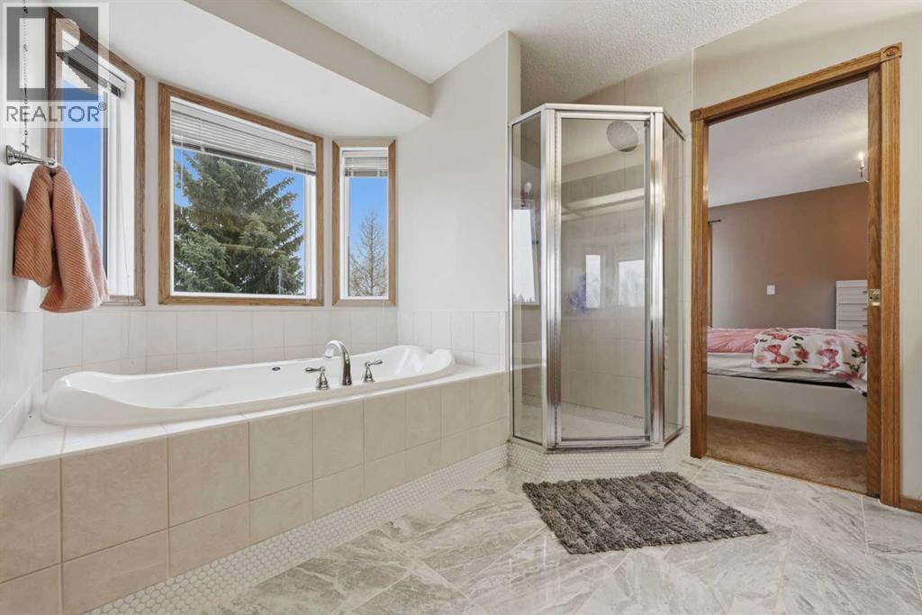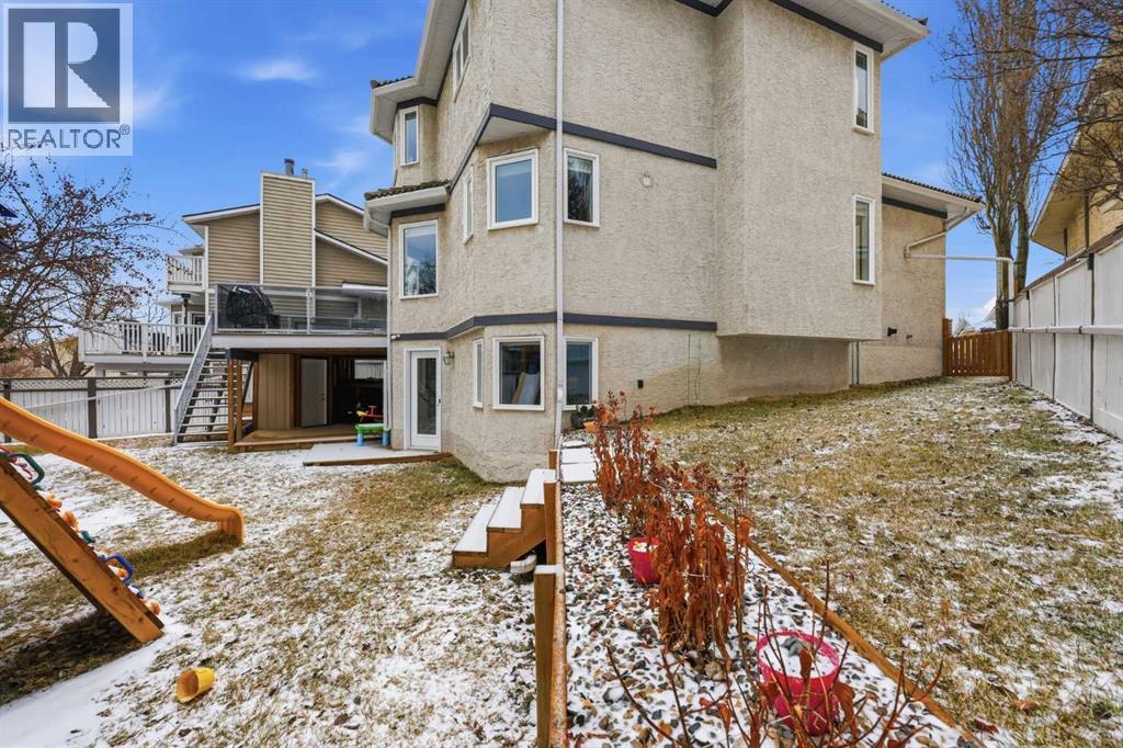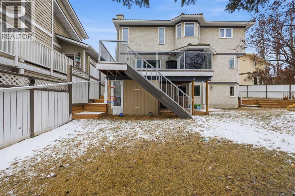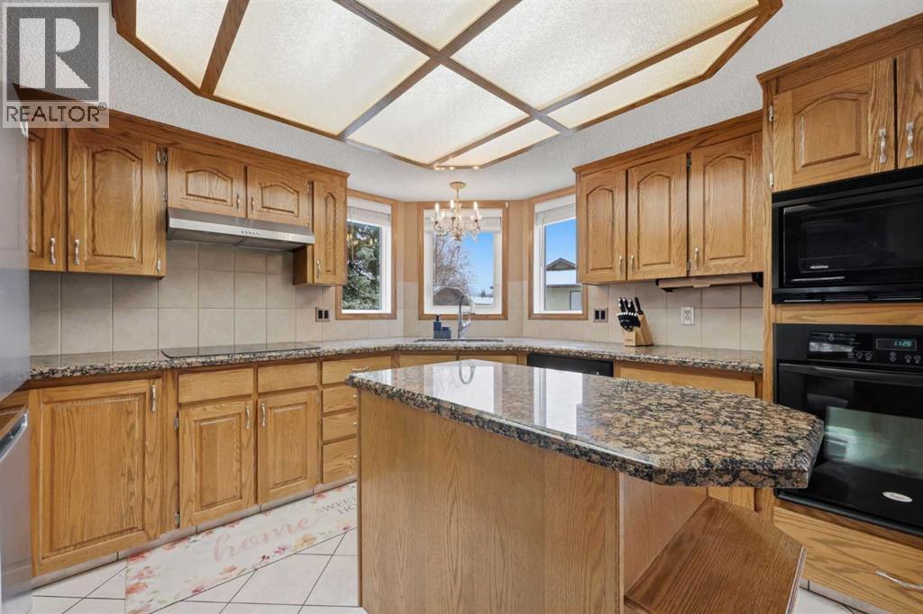 Hello gorgeous! This estate style home combines warmth, oak finishes and that Ralph Lauren throwback feel. The character remains intact with recent updates and fully developed walkout basement offering a more than comfortable 3700 sqft of living space, You’ll find this sprawling home on a quiet cul-de-sac in sought-after Woodbriar Estates. With over $130,000 in recent improvements, including a fully permitted basement renovation and brand-new windows, this property delivers a wonderful combination of space, craftsmanship and charm. The main level is designed for flexibility, featuring a private home office, formal dining area, and a spacious kitchen that opens into multiple living areas—perfect for families who want both connection and separation in their day-to-day living. Natural light pours in through the upgraded windows, enhancing the home’s brightness and functional layout. Upstairs offers four bedrooms, a generous primary suite complete with two walk-in closets and a 5-piece ensuite. The walkout basement has been professionally renovated with engineered hardwood and insulated Dricore subfloor. An expansive rec room, wet bar, half bath and a custom hobby room. There is an incredible amount of shortage space in the basement. Whether for entertaining, hosting the in-laws or working from home, you’ll find value and accessibility in the bottom level. Outside, the pie-shaped lot offers a sunny southeast exposure, mature landscaping and privacy. Also included is the play structure. The elevated deck—with glass railing and gas hookup—extends your living space outdoors, while the recently completed retaining wall adds both structure and visual appeal.Additional updates: removal of poly-b plumbing, new garage door, exterior trim refresh and the comfort of dual A/C units. Fish creek and walking paths are minutes away. Come check out this masterpiece. (id:63190)