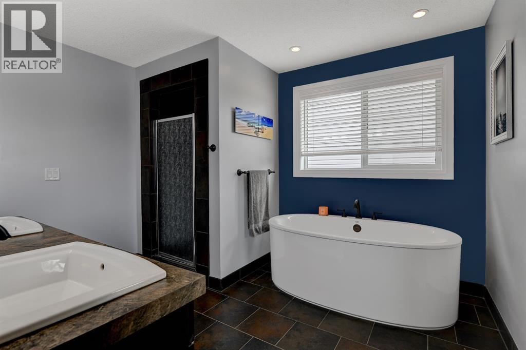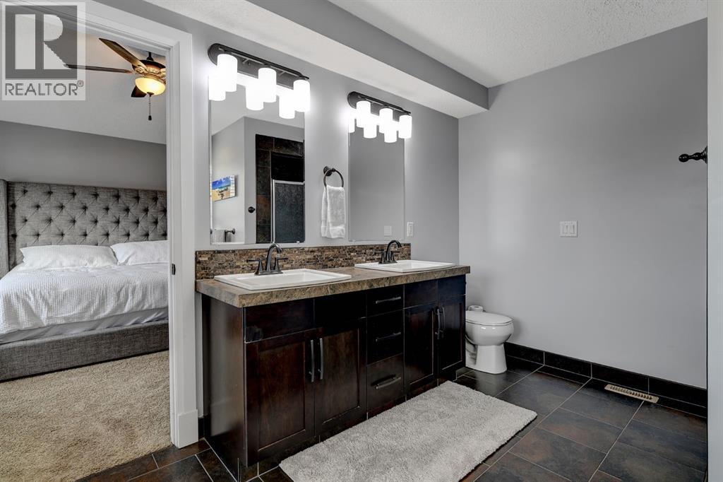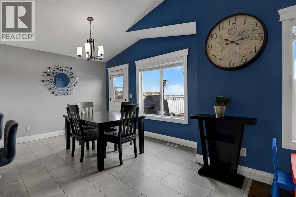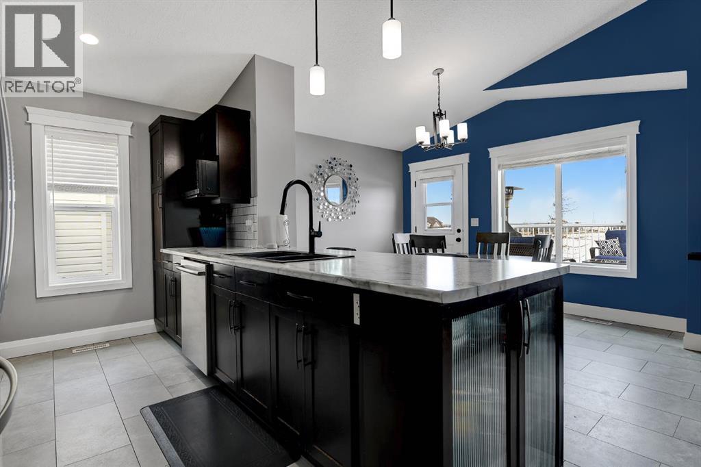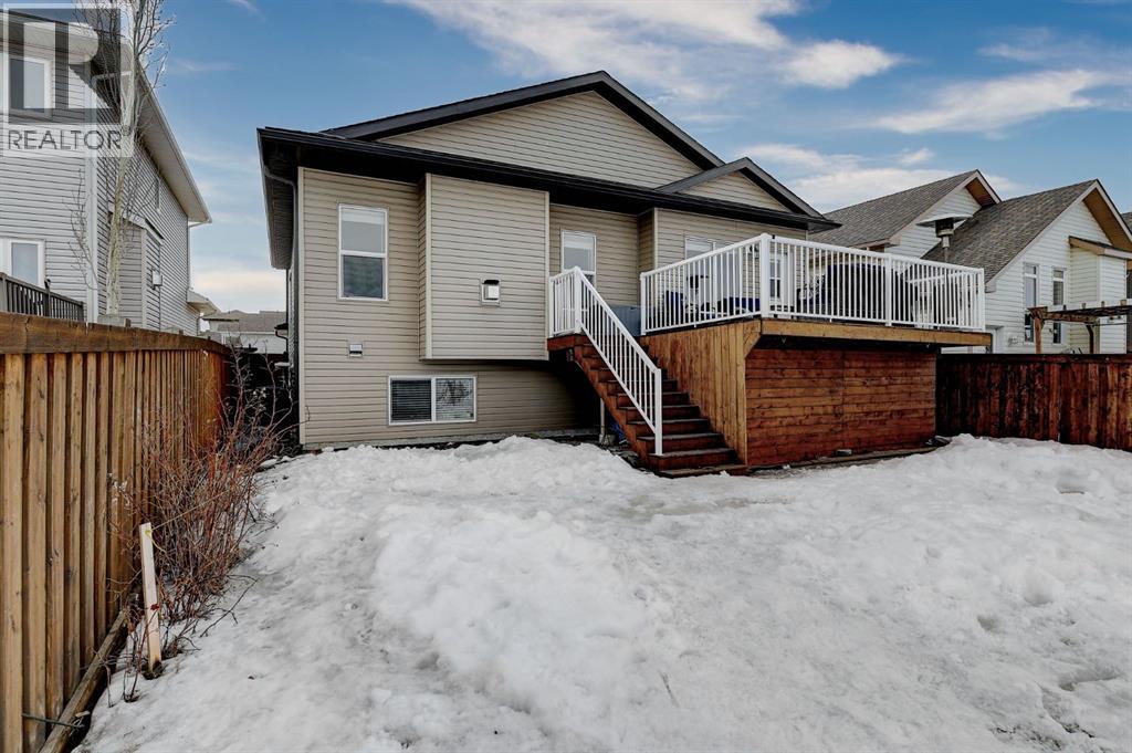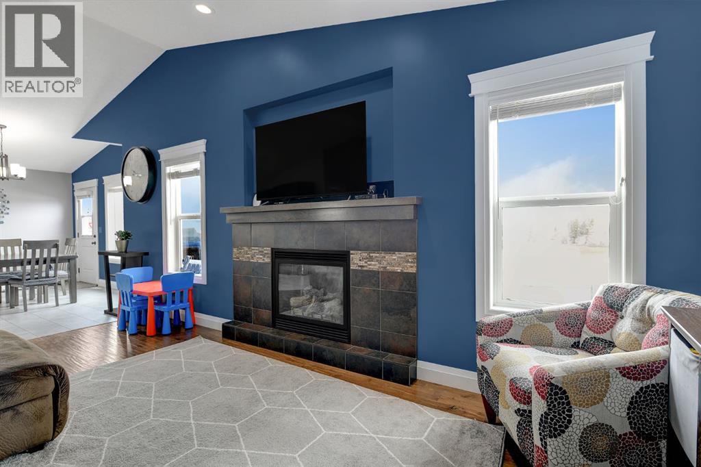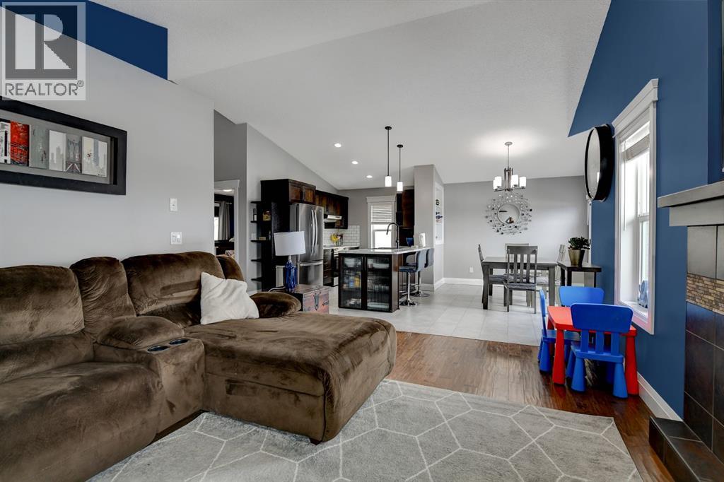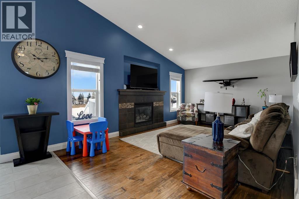 Absolutely immaculate, fully developed modified bi-level backing onto green space and just steps from a park in the family friendly community of Westpointe. This move in ready home has it all. A spacious tiled front entry welcomes you into the open concept main floor, featuring durable vinyl tile flooring throughout. The inviting galley style kitchen showcases rich espresso cabinetry, stainless steel appliances, and excellent functionality. The bright dining area opens onto a composite deck and a fully fenced, landscaped backyard with no rear neighbours perfect for relaxing or entertaining in complete privacy. The living room is warm and inviting, highlighted by a cozy gas fireplace, large windows that flood the space with natural light, and the added comfort of central air conditioning for the summer months. Two generously sized bedrooms and a full bathroom with a stunning tiled surround complete the main level. Above the garage, the oversized primary suite offers a true private retreat, featuring a luxurious ensuite with heated floors, a soaker tub, separate tiled shower, dual sinks, and direct access to a spacious walk-in closet. The fully developed basement boasts a massive rec room with a fun climbing wall, a fourth bedroom, and a third full bathroom providing a versatile layout ideal for families of all sizes. This home shows exceptionally well and is sure to impress. (id:63190)