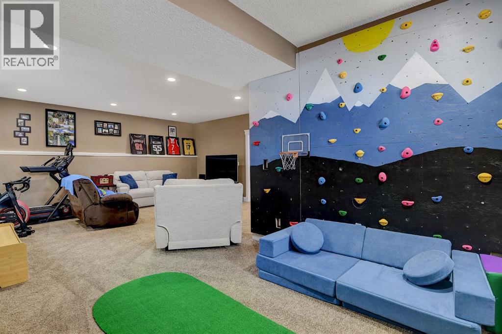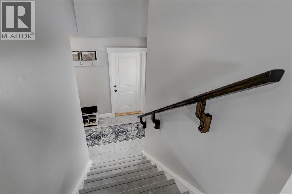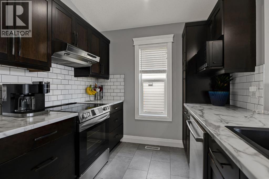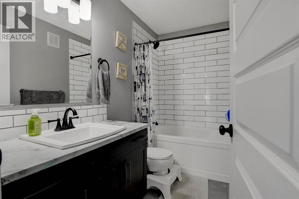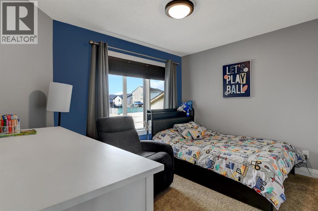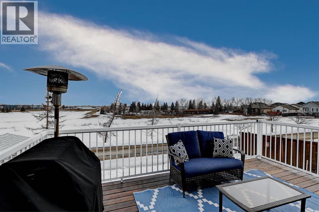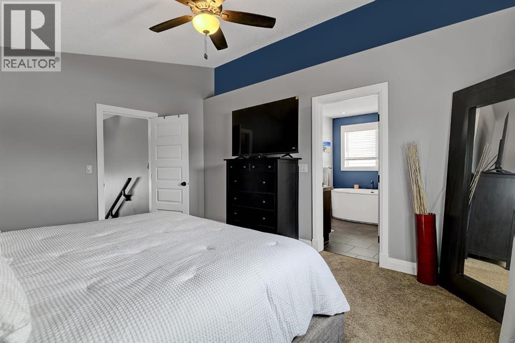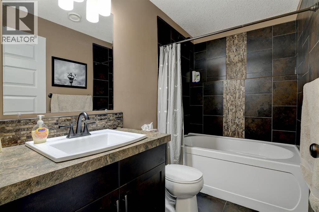 Absolutely immaculate, fully developed modified bi-level backing onto green space and just steps from a park in the family friendly community of Westpointe. This move in ready home has it all. A spacious tiled front entry welcomes you into the open concept main floor, featuring durable vinyl tile flooring throughout. The inviting galley style kitchen showcases rich espresso cabinetry, stainless steel appliances, and excellent functionality. The bright dining area opens onto a composite deck and a fully fenced, landscaped backyard with no rear neighbours perfect for relaxing or entertaining in complete privacy. The living room is warm and inviting, highlighted by a cozy gas fireplace, large windows that flood the space with natural light, and the added comfort of central air conditioning for the summer months. Two generously sized bedrooms and a full bathroom with a stunning tiled surround complete the main level. Above the garage, the oversized primary suite offers a true private retreat, featuring a luxurious ensuite with heated floors, a soaker tub, separate tiled shower, dual sinks, and direct access to a spacious walk-in closet. The fully developed basement boasts a massive rec room with a fun climbing wall, a fourth bedroom, and a third full bathroom providing a versatile layout ideal for families of all sizes. This home shows exceptionally well and is sure to impress. (id:63190)