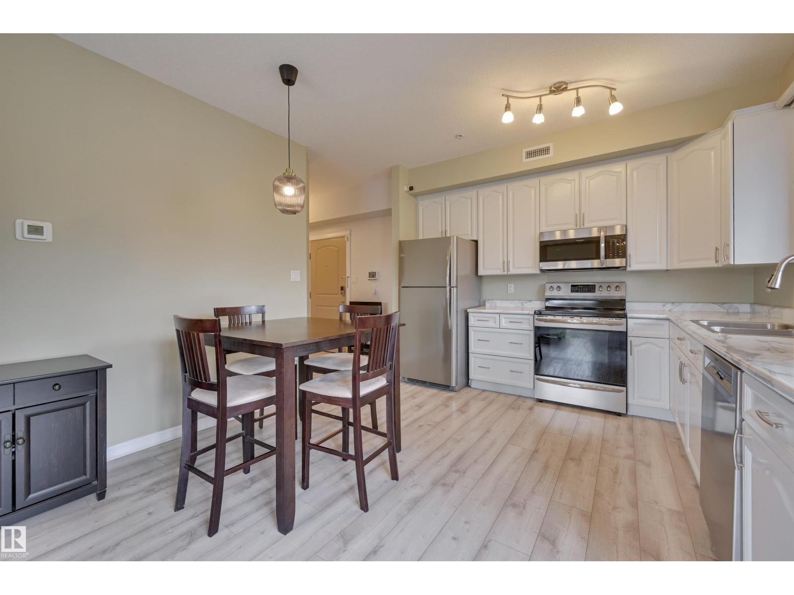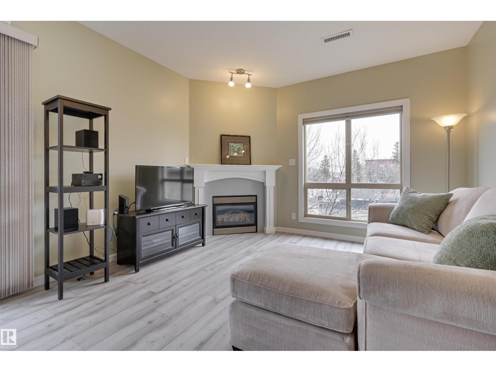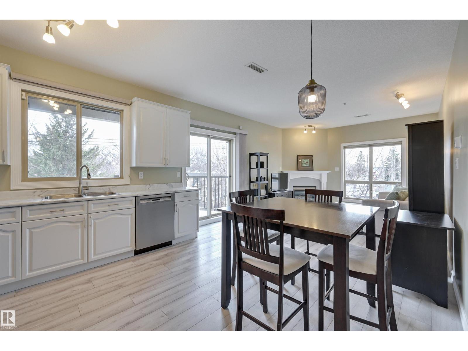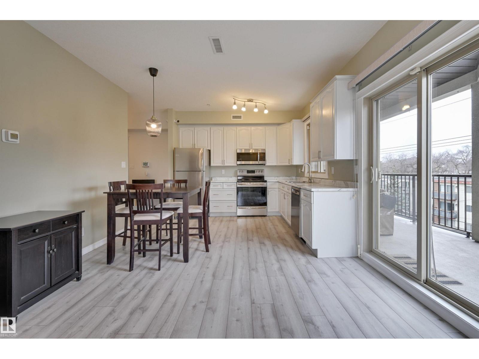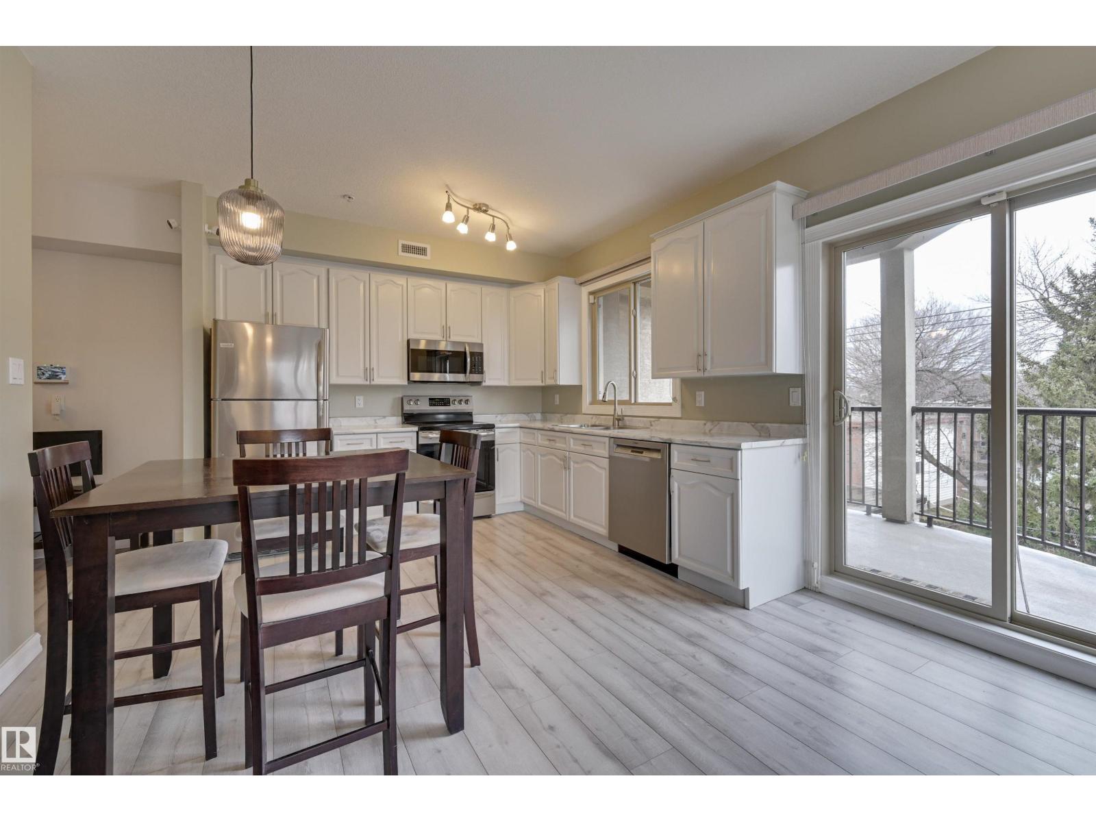 Enjoy treeline views from this meticulously renovated 932 sq. ft. condo in the desirable Tuscany Place. Perfectly situated just blocks from Whyte Avenue, you are steps away from vibrant restaurants, local coffee shops, public transit, and the scenic River Valley trails, with effortless access to the U of A and Downtown. The home features a modern open-concept layout with 9-foot ceilings and expansive northeast-facing windows that flood the living area with natural light. The large balcony has a natural gas hookup for BBQ. No detail has been overlooked in the extensive upgrades: fresh paint and carpet (2026), laminate flooring (2022), new furnace and A/C (2022), and all newer stainless steel appliances. The kitchen and bathrooms shine with resurfaced cabinetry, upgraded countertops and sinks. The spacious primary suite includes a walk-in closet with built-ins and a private ensuite. Includes a titled underground parking stall.The building is well maintained by a professional management company. (id:63190)