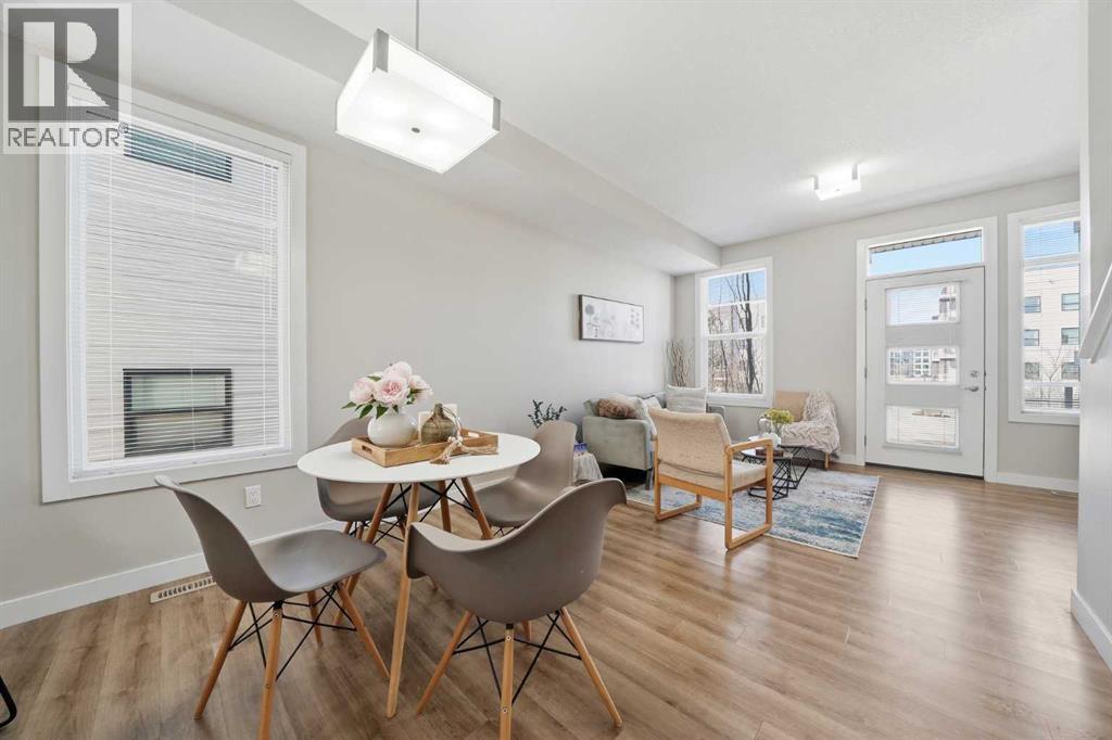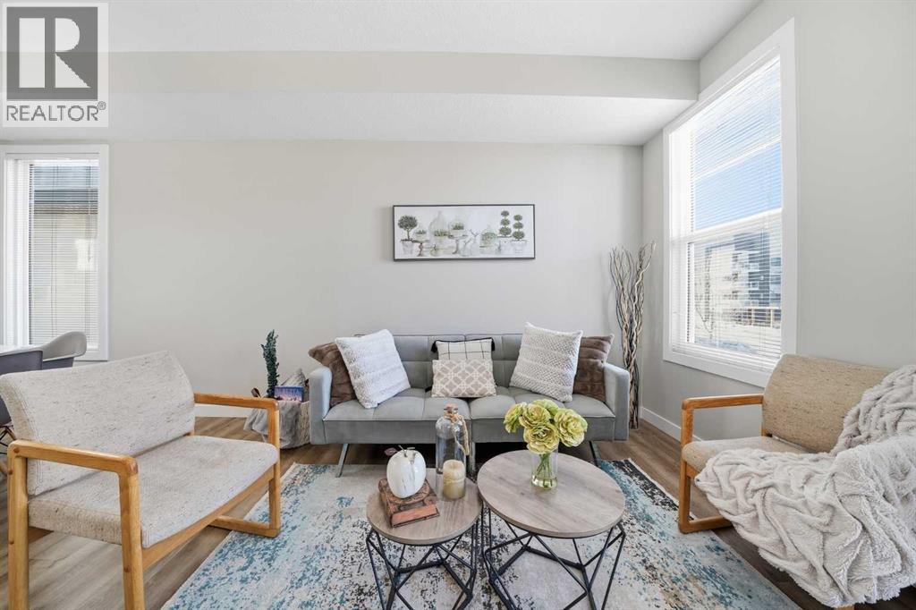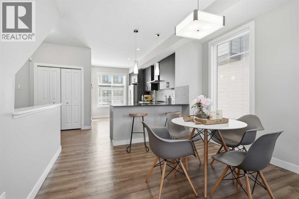 OPEN HOUSE on SAT & SUN, Apr 18 & 19 from 11AM TO 1PM ~ END UNIT townhome with 3 BEDROOMS | 2.5 BATHS | DOUBLE ATTACHED TANDEM GARAGE | CENTRAL A/C | TONS OF HIGH END BUILDER UPGRADES | beautifully built by Trico Homes in Calgary’s urban district SETON! Combining functionality with modern luxury, be impressed the moment you set foot the open concept main floor with natural light illuminating through the many oversized windows at every turn, you can only find in an end unit. This flows perfectly into the exquisite kitchen boasting full height cabinets, stainless steel appliances with built-in microwave, quartz countertop and flush eating bar. It seamlessly blends into the cozy dining area and spacious a living room that leads to a balcony ready for BBQs. Main floor also features 9 ft ceiling height, knockdown texture, vinyl flooring that is durable and easy to clean. A half bathroom completes this level. The upper floor offers 3 generously sized bedrooms with the master suite featuring a large walk-in closet and full ensuite. Convenient laundry is also located on the upper floor. Parking will never be a problem, thanks to the double attached tandem garage that is perfect for keeping your car warm with lots of space for storage and a utility room. This unit also has plenty of street parking and close distance to visitors parking. Maintenance-free living in a well managed complex with low condo fee. This property is strategically located within walking distance to YMCA , The South Health Campus hospital, public library, JCS High School, Cineplex Cinema, banks, grocery stores, restaurants, bars, and a huge green space! Book your showing today and don’t miss out on the opportunity to own this beautifully upgraded end unit townhome! ** 3D VIRTUAL TOUR AVAILABLE** (id:63190)