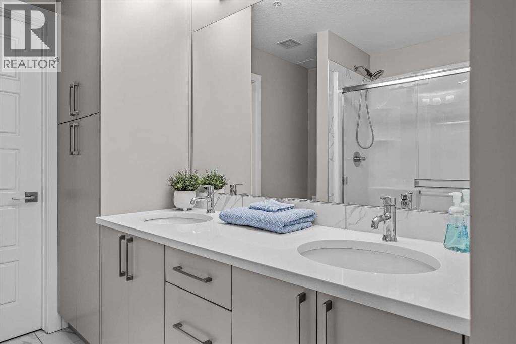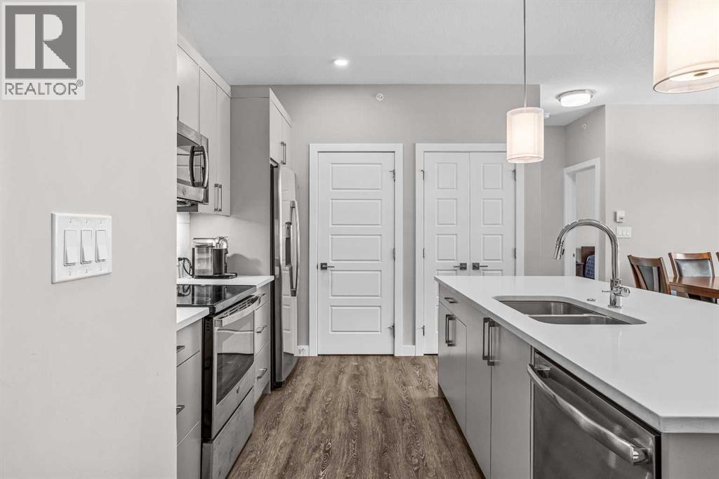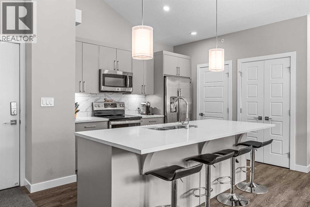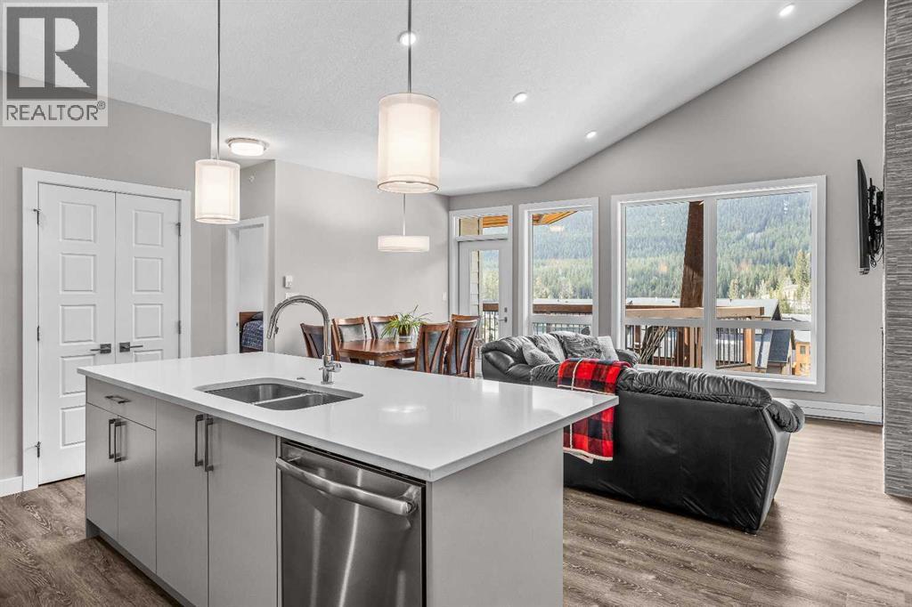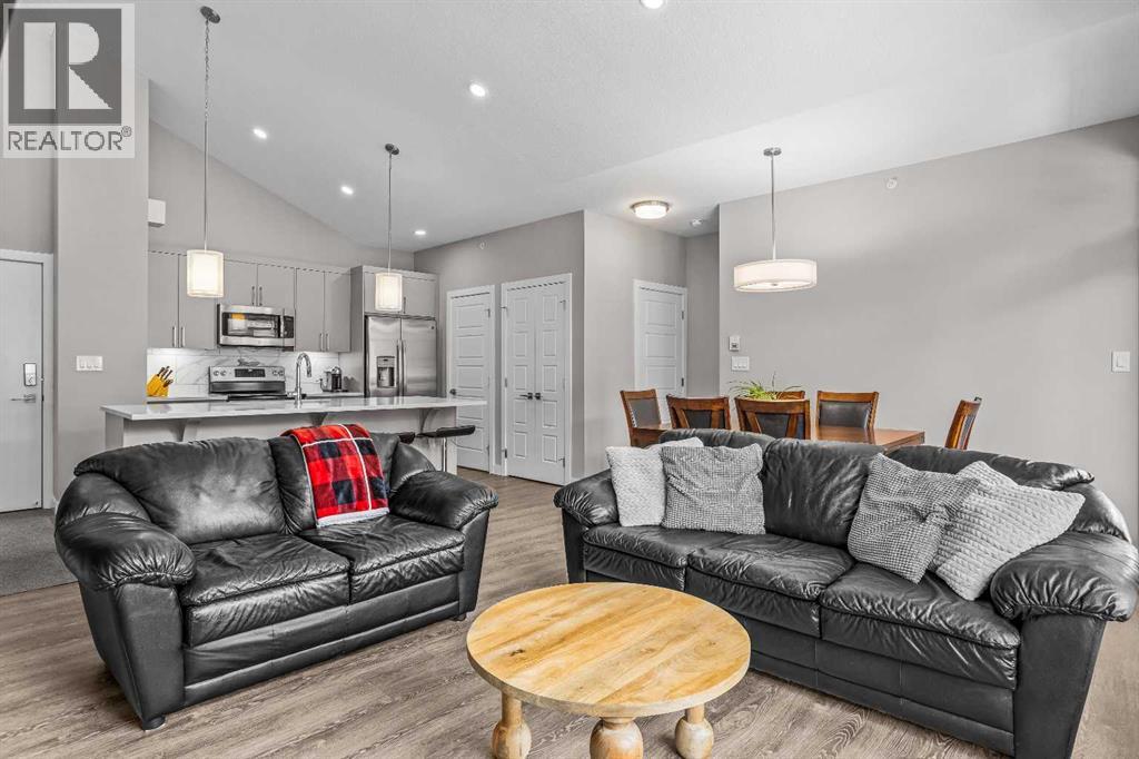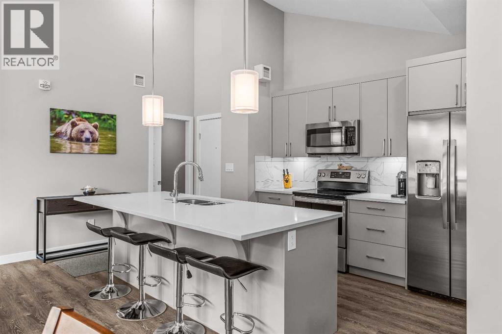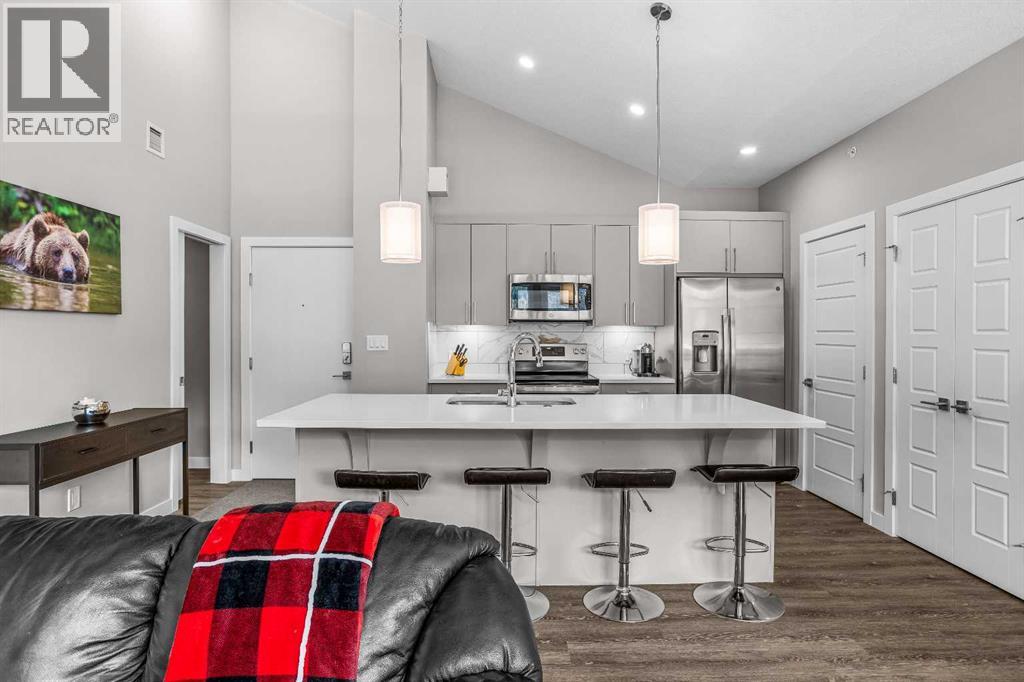 Welcome to Lookout Ridge in Stewart Creek—where mountain living meets everyday comfort. This beautifully appointed 2 bed, 2 bath top-floor condo offers vaulted ceilings, stunning south-facing views, and an open-concept layout designed to impress. The spacious kitchen features stainless steel appliances, quartz countertops, and a generous pantry, flowing seamlessly into the living area where a striking stone fireplace takes centre stage. Bedrooms are thoughtfully positioned on opposite sides of the unit for added privacy. The primary retreat includes a spacious walk-in closet and 4-piece ensuite, while the second full bath is equally well appointed. Enjoy the convenience of in-unit laundry, one underground parking stall, a storage unit, and breathtaking views of Ha Ling from your private mountain escape. (id:63190)