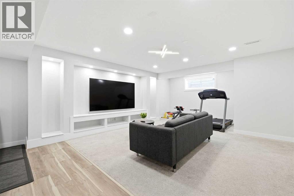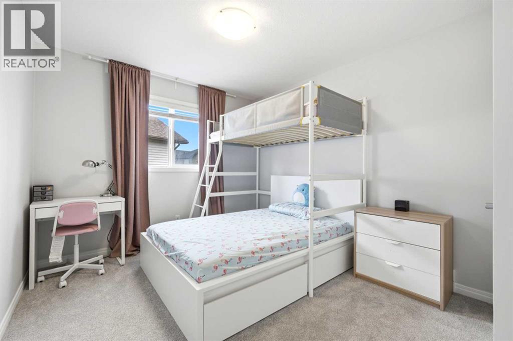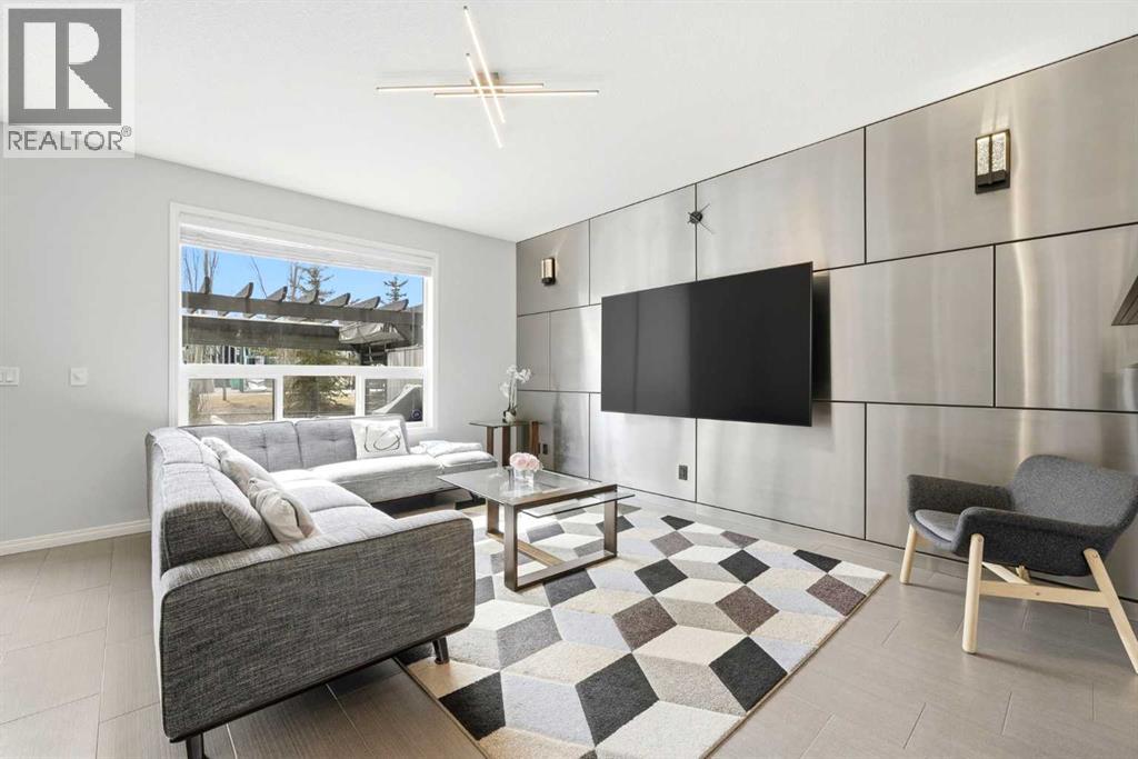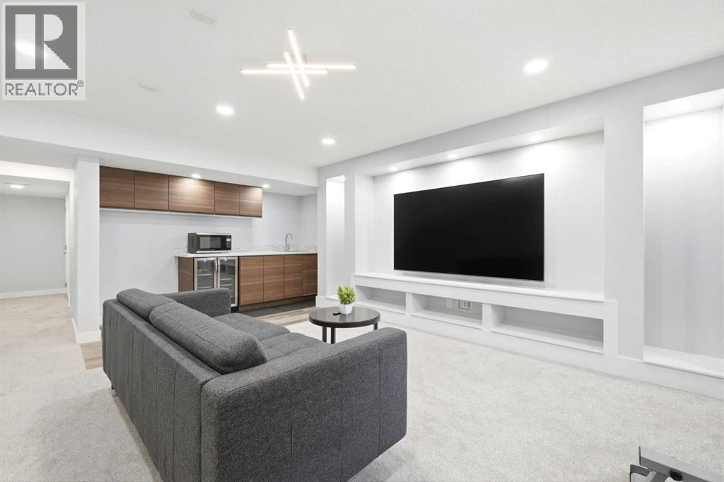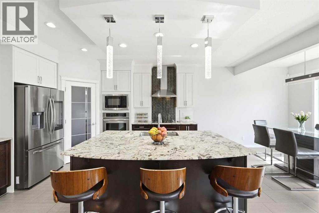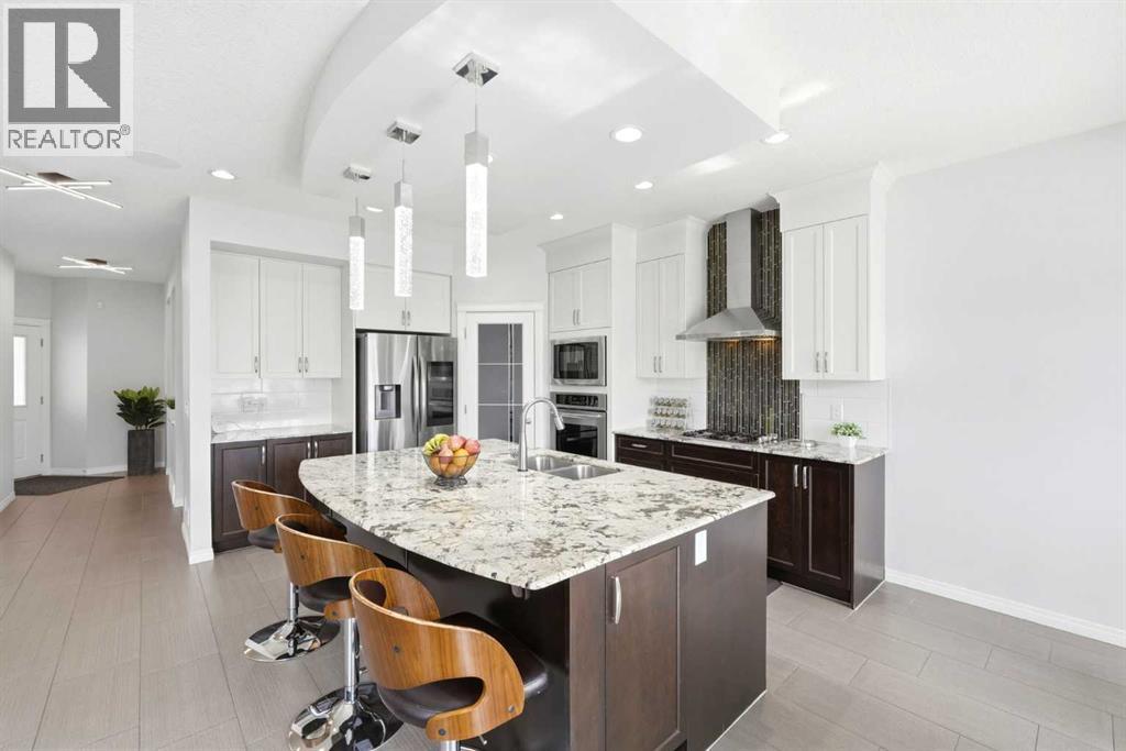 Premiere Video Tour available. An exceptional residence offering over 3,000 sq. ft. of refined, design-forward luxury, perfectly set on a quiet cul-de-sac backing directly onto green space and a community field. This fully finished 2-storey home delivers a rare combination of privacy, prestige, and elevated family living. A double attached garage plus 2-car driveway introduces the home with presence and practicality, while the covered entry sets the tone for the upscale finishes throughout. Inside, soaring 9-ft ceilings and an open-concept layout create a light-filled, architectural main level,enhanced by upgraded designer lighting throughout. The chef-inspired kitchen is a true centerpiece, featuring a substantial granite island, bespoke dual-tone cabinetry, an upgraded cooktop, and extensive built-in storage designed for both function and entertaining. The great room is anchored by a dramatic two-way fireplace and elevated by a custom metal feature backdrop, seamlessly connecting to a private executive-style office framed by French doors. Outdoor living is equally elevated, with a composite deck, custom pergola, and a fully landscaped south-facing pie lot—offering uninterrupted views and an ideal setting for sophisticated entertaining. Exterior security lighting adds both ambiance and peace of mind. Upstairs, a thoughtfully designed bonus room with wet bar and beverage fridge provides a private lounge experience. The primary suite is a true retreat, featuring a spa-caliber ensuite with a corner soaker tub, dual rain-style shower heads, frameless 10mm glass enclosure, built-in bench, and custom makeup vanity. Two additional bedrooms, updated carpeting, upper-level laundry, and a designer vanity bath complete the upper floor. The professionally finished 9-ft basement extends the living experience with a spacious recreation lounge with a wet bar, guest bedroom, full bathroom, and flexible space for a home gym, theatre, or studio. Significant recent upgrades add long- term value and comfort, including central air conditioning and a new roof installed last year with additional ventilation fans. The garage has also been thoughtfully enhanced with fresh paint, upgraded flooring, and custom wall storage systems and hangers, offering both functionality and a polished finish. Highly sought-after family-oriented location close to premium schools, parks, and amenities. A residence defined by scale, craftsmanship, and elevated everyday living. Don’t miss this exceptional opportunity, book your private showing today. Homes like this don’t last! (id:63190)