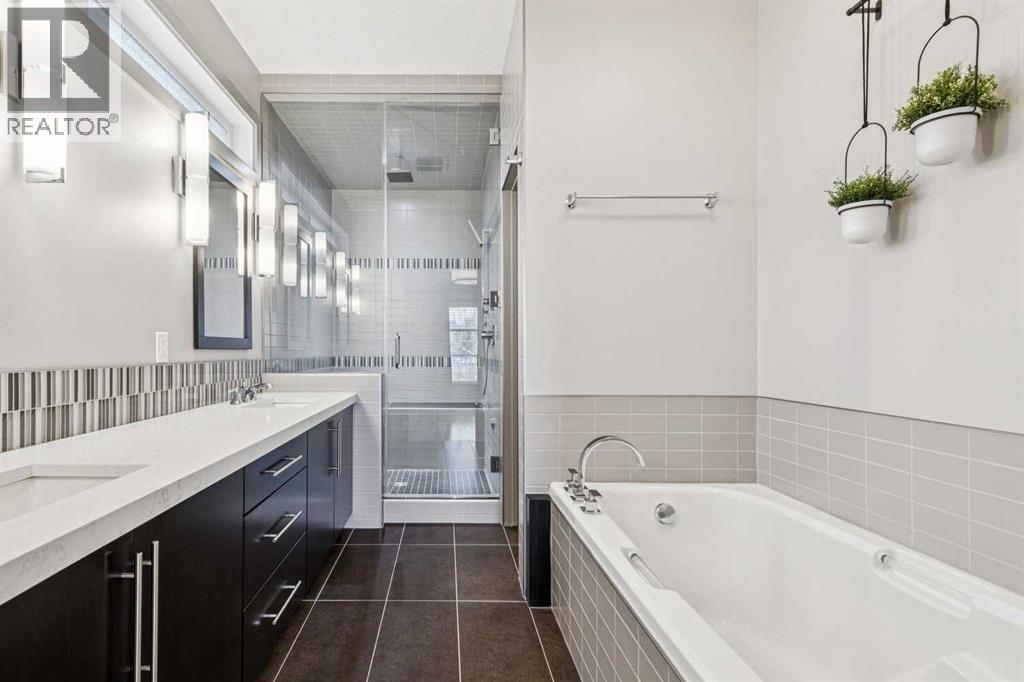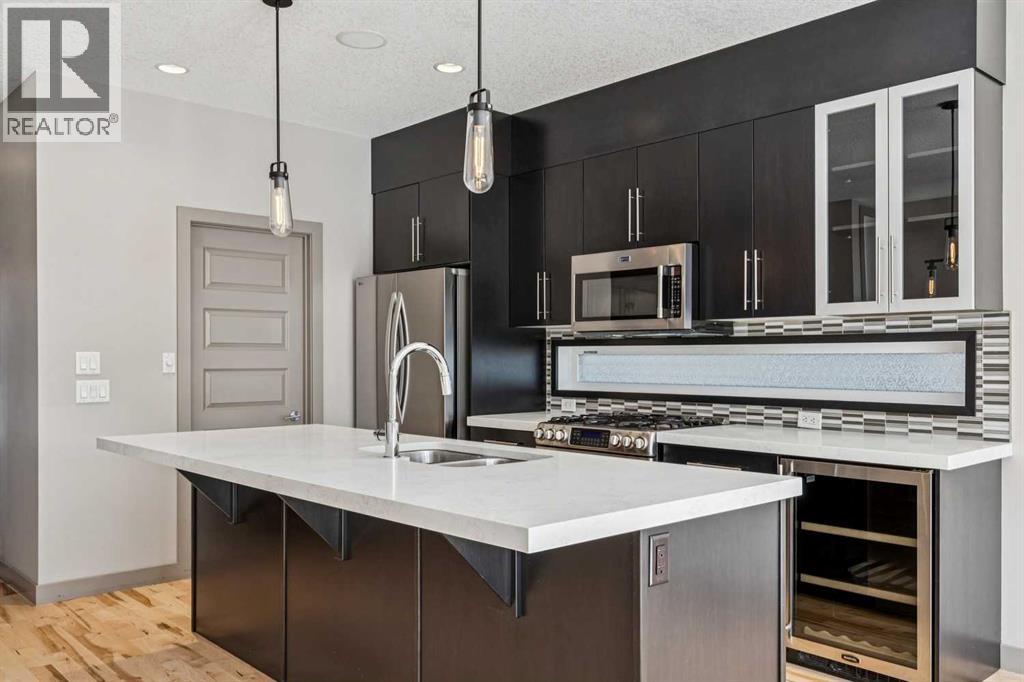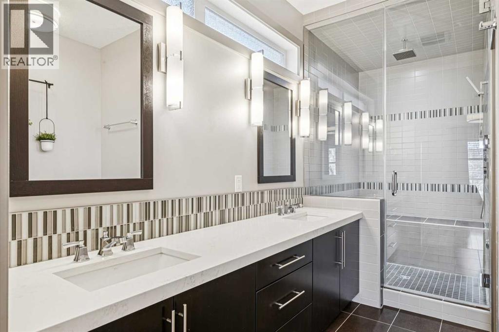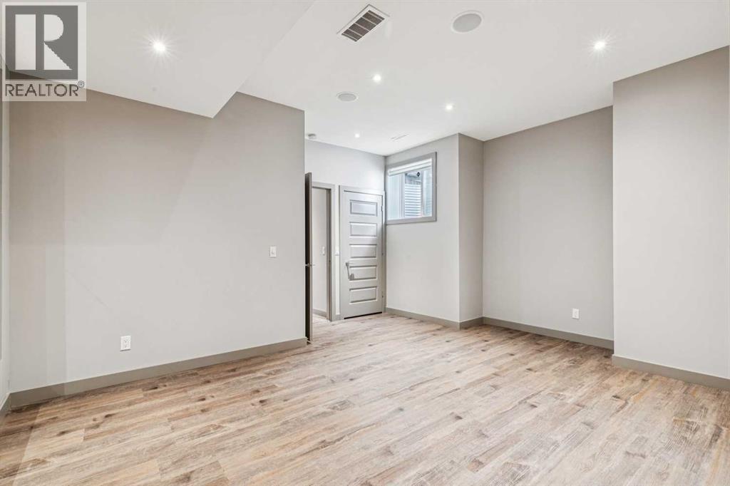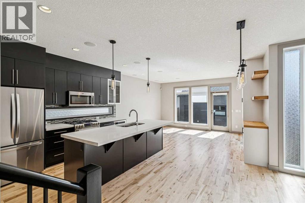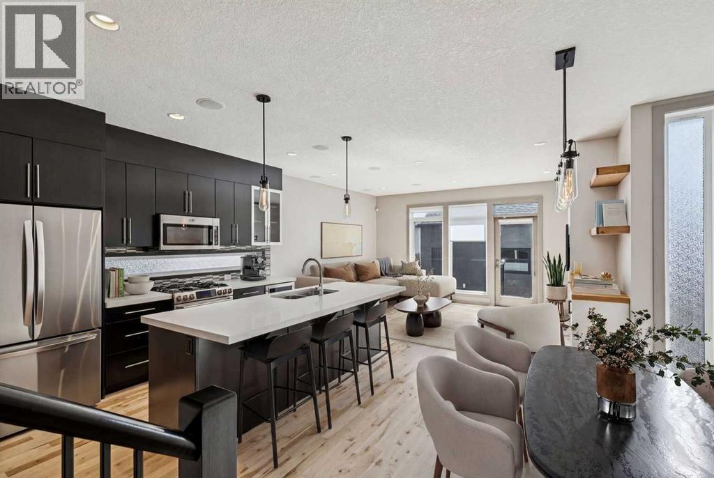 Located on a quiet, tree-lined street in desirable Altadore, this fully developed detached home blends refined design with everyday functionality while placing parks, pathways and Marda Loop amenities within easy reach. Step inside to a bright main level where 9’ ceilings and recently refinished hardwood flooring establish an open, airy feel and new light fixtures introduce a polished layer of style. Work from home with ease in the front den, where a sliding door allows privacy without sacrificing natural light. Entertain effortlessly in the chef-inspired kitchen, where a gas stove, new fridge, built-in wine fridge, updated quartz countertops and a gorgeous custom butler pantry come together around a generous island. Share meals in the adjacent dining area, which keeps conversation connected while maintaining clear sightlines across the main floor. Unwind in the family room where a gas fireplace anchors the space and oversized windows draw sunlight inward and invite seamless access to the backyard. Head upstairs via the custom open riser staircase, where hardwood flooring continues and a central bonus room introduces a flexible zone suited to relaxing, studying, or play. Recharge in the primary retreat, where generous proportions establish a true sense of escape and a lavish ensuite elevates daily routines with new quartz countertops, in-floor heated tile, an oversized steam shower, dual sinks and a deep soaker tub. A customized California Closet system is thoughtfully arranged to keep everything organized and accessible. Two additional bedrooms, a 4-piece bathroomnand upper laundry finish this level with everyday convenience in mind. The finished basement adds extra living space with exposed brick detail, a wine wall, bar area and an electric fireplace. The expansive recreation area is suited to movie nights or games, while a fourth bedroom and 3-piece bathroom bring added flexibility for guests or a home gym. Outside, the south-facing backyard features a deck, pat io and gas BBQ hookup, designed for low-maintenance outdoor living. Additional highlights include central A/C, security system, gemstone exterior lighting, in-ceiling speakers, tankless hot water and a double garage. Enjoy walking to Sandy Beach Park, the Elbow River pathways and the vibrant shops, dining, and recreation options of Marda Loop. (id:63190)