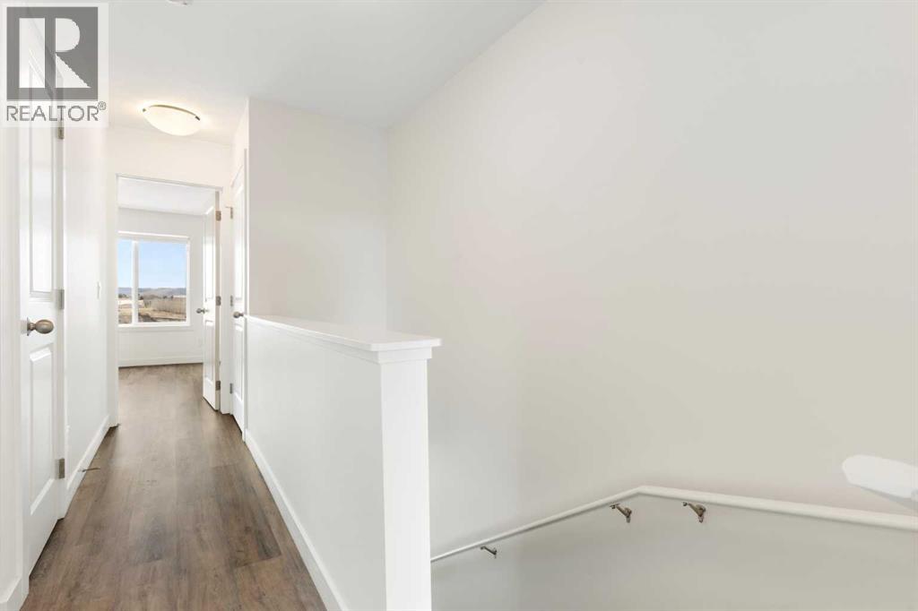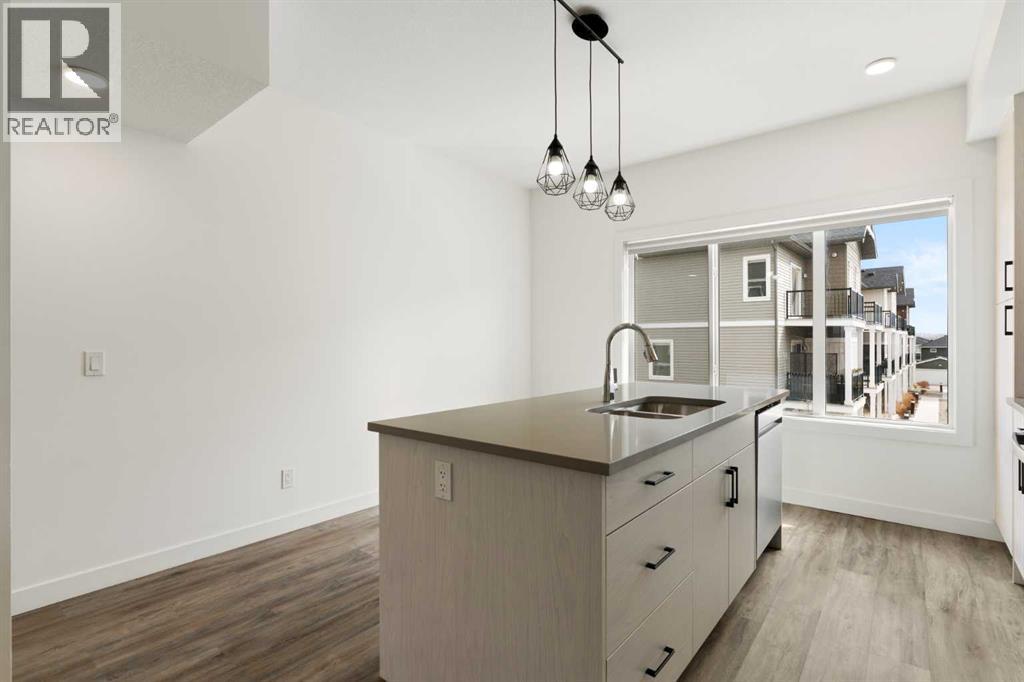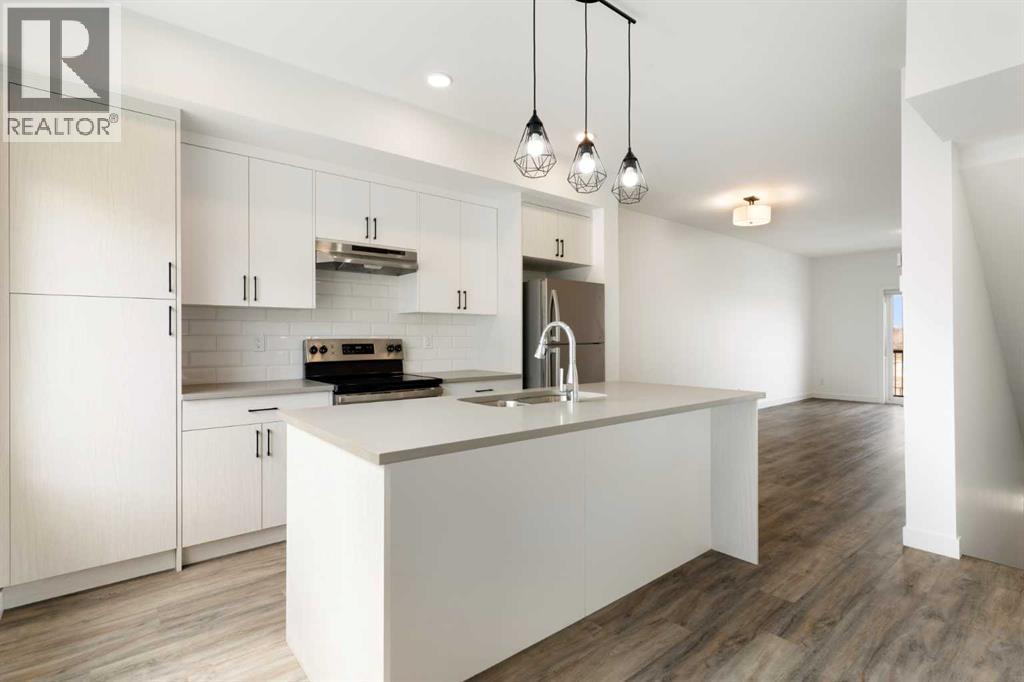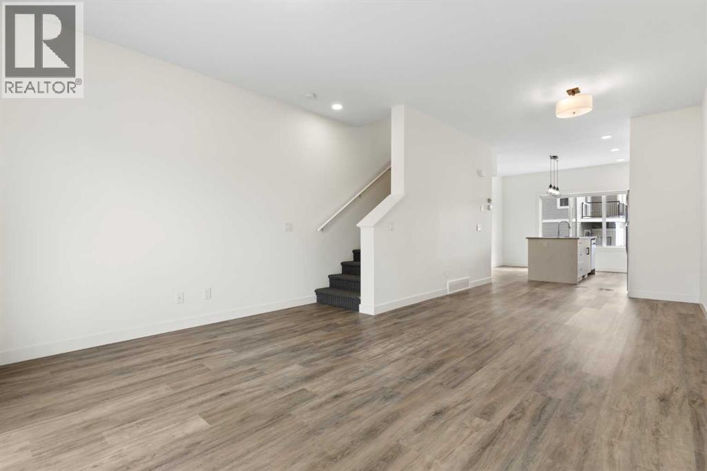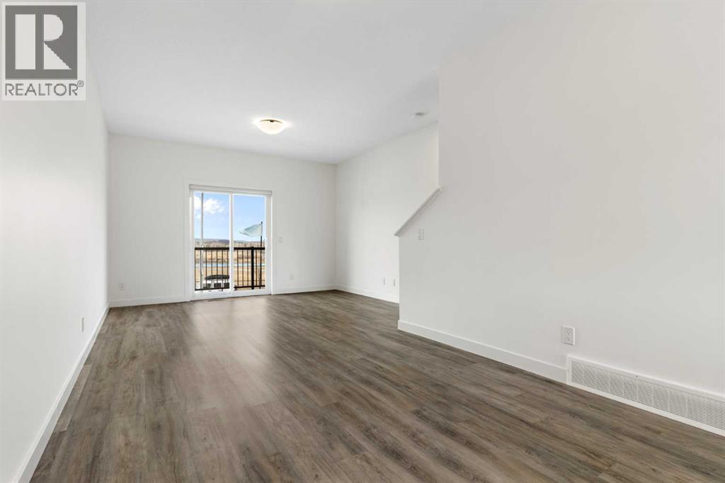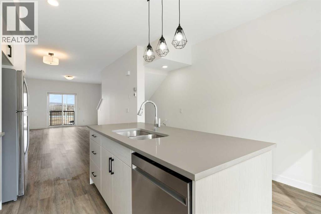 Experience the best of modern living in this lightly lived in Cochrane townhome. , enjoy a west facing backdrop! Located directly across from the future Rivercrest School! and offering stunning Mountain Views! The last interior unit with a deck facing the Mountains! Inside, discover a bright, open-concept haven designed for both entertaining and everyday comfort. The kitchen is the heart of the home, featuring a sprawling white quartz island perfect for casual meals or lively gatherings. You'll love the sleek two-tone cabinetry with soft-close drawers, a full GE stainless steel appliance package, ample cabinet space, and a pantry, all illuminated by stylish pendant lighting. Large windows on both sides of the unit flood the space with natural light, highlighting the durable vinyl plank floors and soaring, knock-down textured ceilings. Pull-down window coverings offer privacy and shade when desired, while the adjacent living room provides a natural gathering spot. This meticulously designed townhome offers two spacious bedrooms, 2.5 baths, and a versatile flex space on the main level—perfect for a home office, guest room, or creative studio. The primary suite on the third level boasts dual closets for ample storage and large windows and its own 4pc ensuite. This level also features a convenient laundry area and a full 4-piece bath for the other bedroom. Convenience is paramount with the oversized, fully insulated single-car garage, with dual access (doors on both sides of the unit) Location is key! Nestled in a fantastic complex, you're just steps from shopping, scenic pathways, and the tranquil Bow River. Bow Valley High School is close by, with a Cochrane's newest school (K-8 Breaking ground this Spring) conveniently located next door , and local transit is mere steps away. Enjoy quick access to Calgary for work or entertainment and the majestic mountains for weekend adventures. (id:63190)