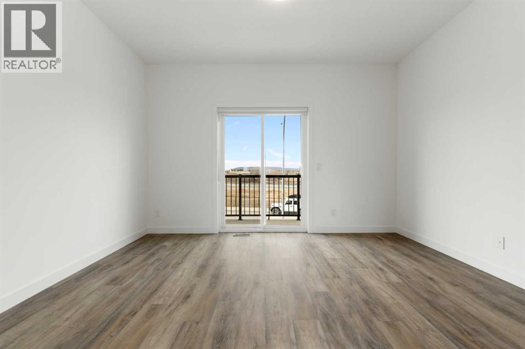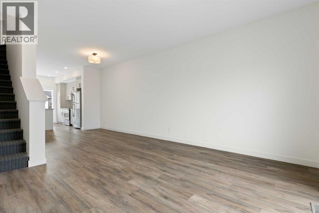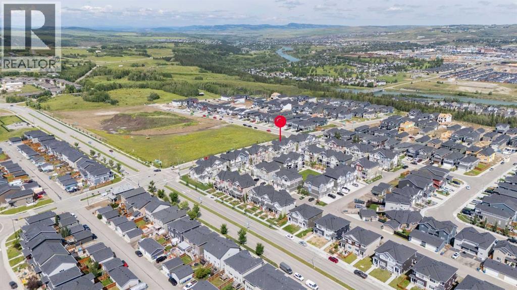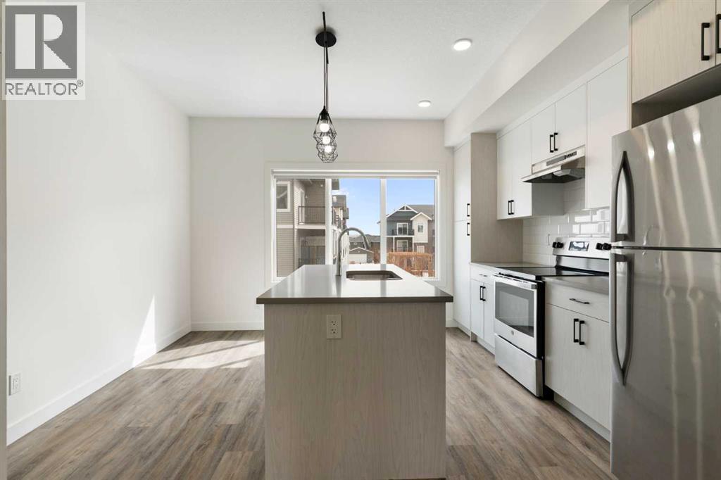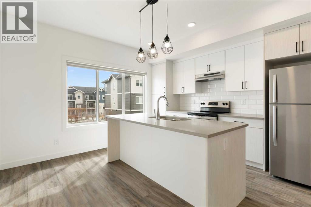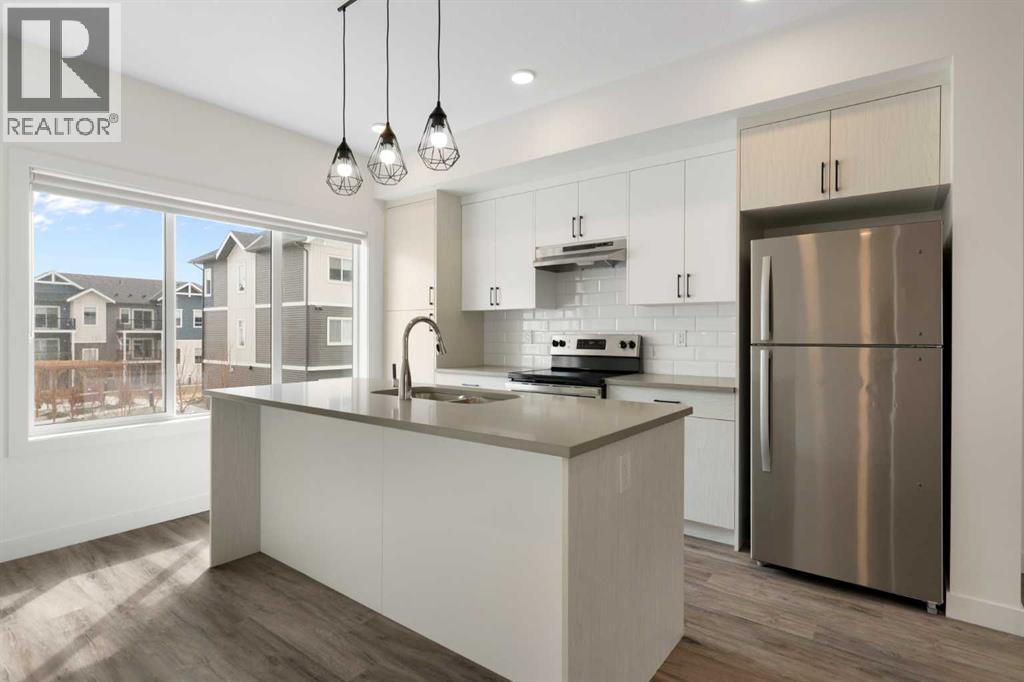 Experience the best of modern living in this lightly lived in Cochrane townhome. , enjoy a west facing backdrop! Located directly across from the future Rivercrest School! and offering stunning Mountain Views! The last interior unit with a deck facing the Mountains! Inside, discover a bright, open-concept haven designed for both entertaining and everyday comfort. The kitchen is the heart of the home, featuring a sprawling white quartz island perfect for casual meals or lively gatherings. You'll love the sleek two-tone cabinetry with soft-close drawers, a full GE stainless steel appliance package, ample cabinet space, and a pantry, all illuminated by stylish pendant lighting. Large windows on both sides of the unit flood the space with natural light, highlighting the durable vinyl plank floors and soaring, knock-down textured ceilings. Pull-down window coverings offer privacy and shade when desired, while the adjacent living room provides a natural gathering spot. This meticulously designed townhome offers two spacious bedrooms, 2.5 baths, and a versatile flex space on the main level—perfect for a home office, guest room, or creative studio. The primary suite on the third level boasts dual closets for ample storage and large windows and its own 4pc ensuite. This level also features a convenient laundry area and a full 4-piece bath for the other bedroom. Convenience is paramount with the oversized, fully insulated single-car garage, with dual access (doors on both sides of the unit) Location is key! Nestled in a fantastic complex, you're just steps from shopping, scenic pathways, and the tranquil Bow River. Bow Valley High School is close by, with a Cochrane's newest school (K-8 Breaking ground this Spring) conveniently located next door , and local transit is mere steps away. Enjoy quick access to Calgary for work or entertainment and the majestic mountains for weekend adventures. (id:63190)