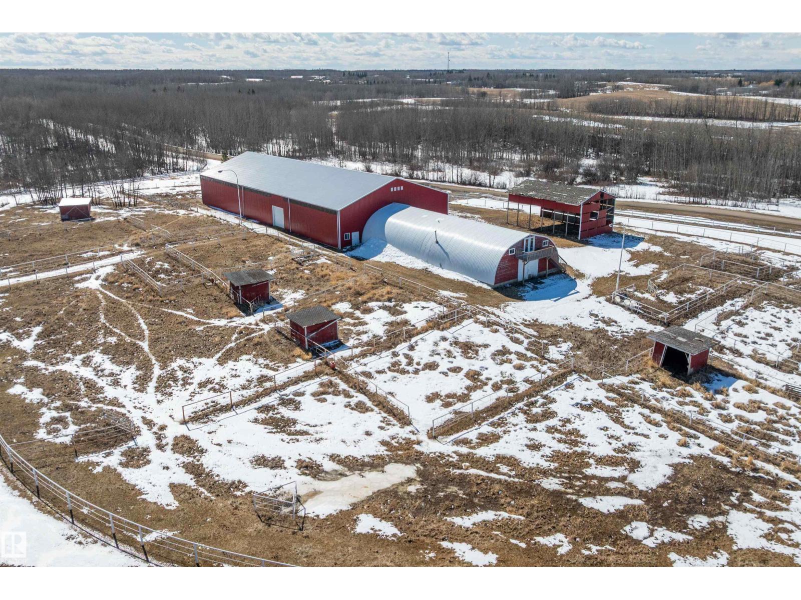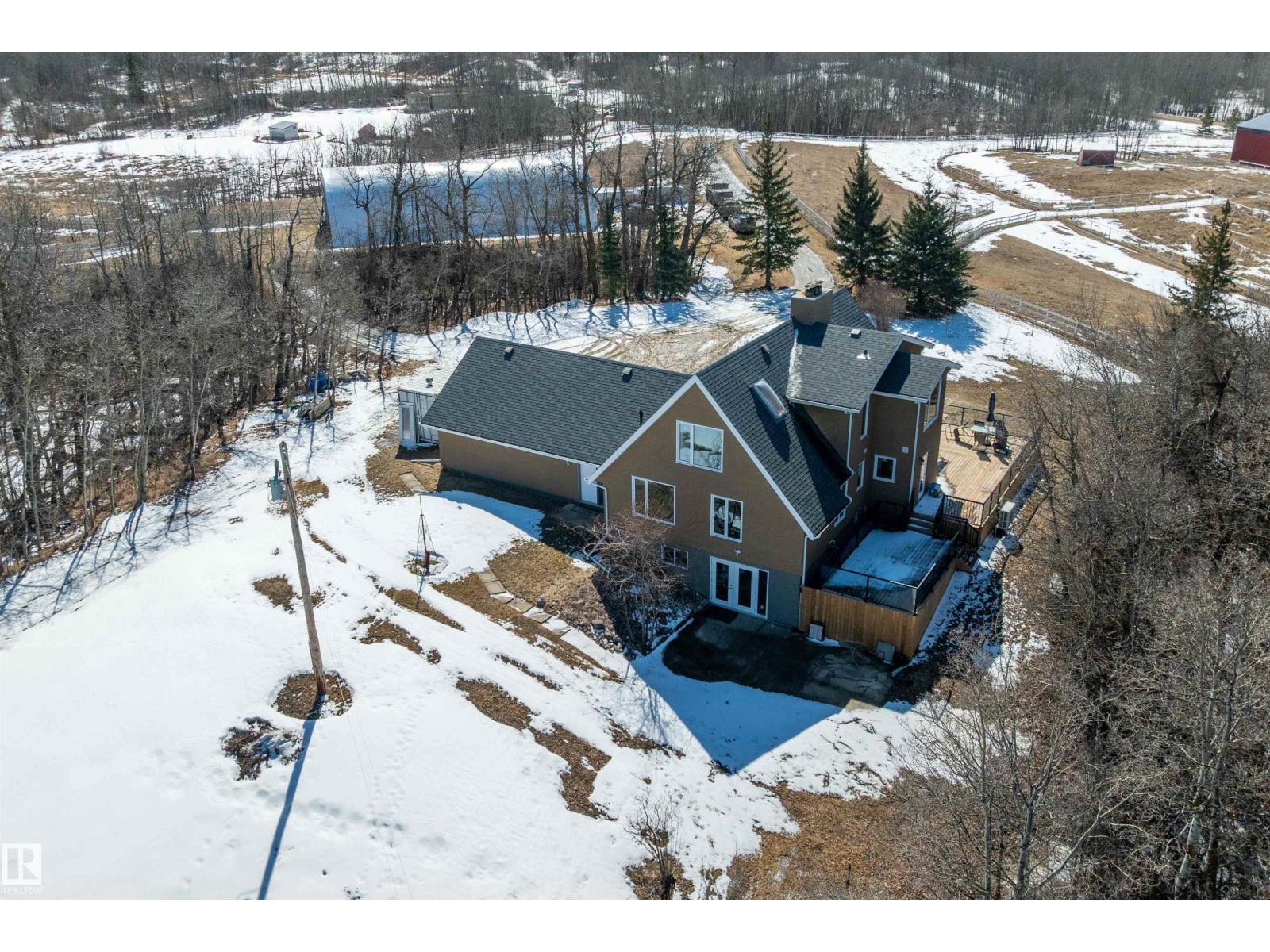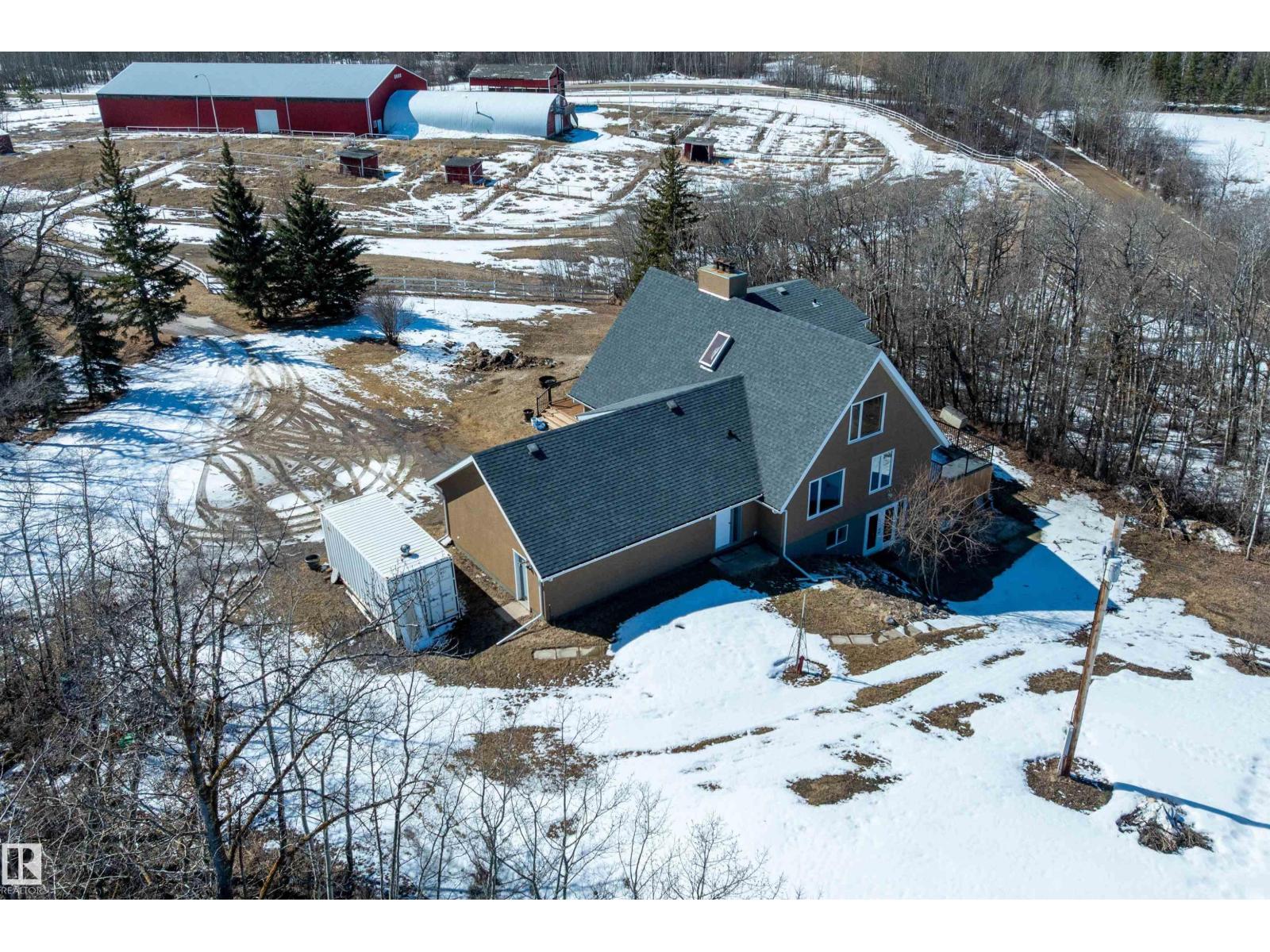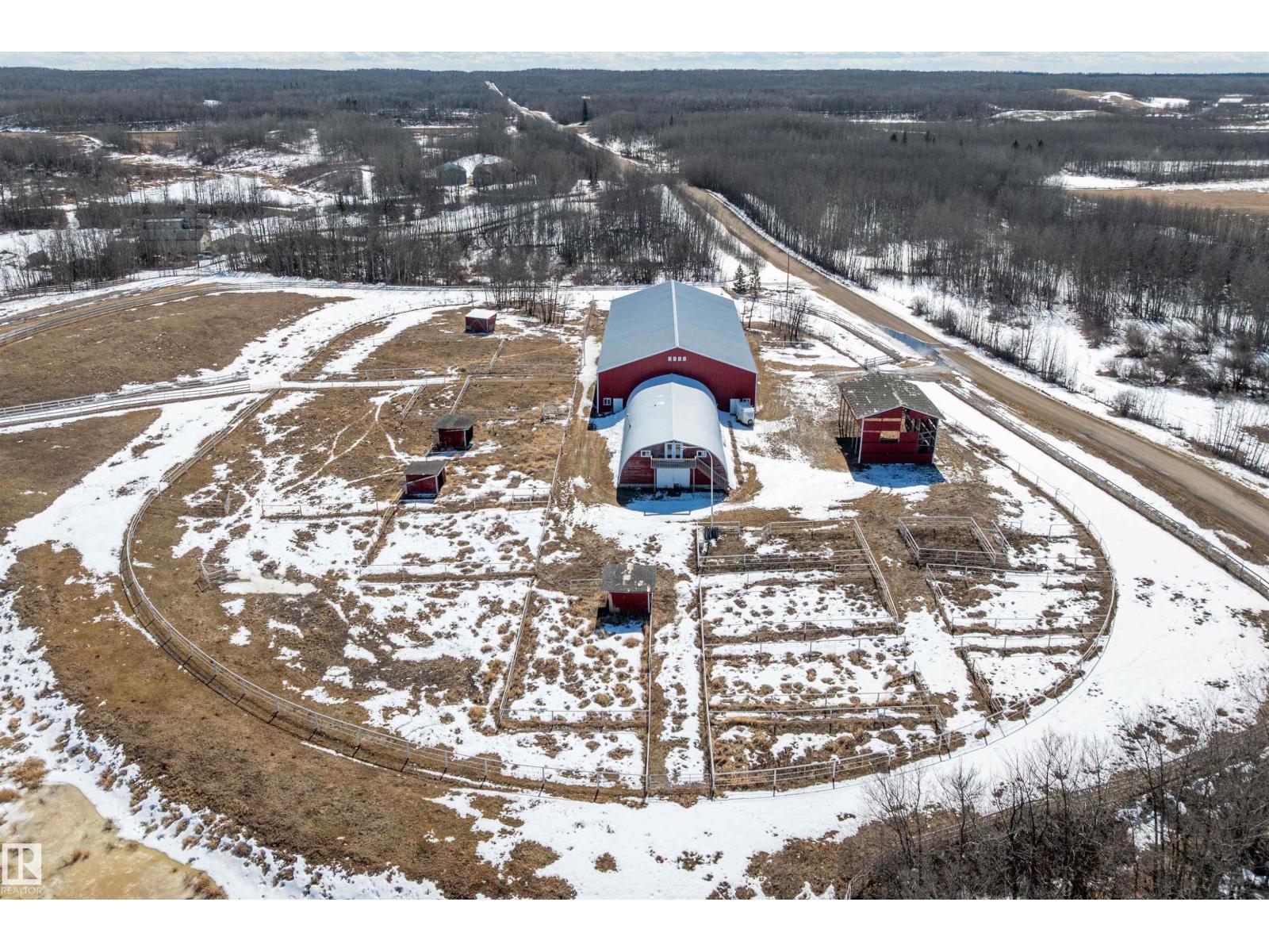This property is a DREAM COME TRUE for EQUINE ENTHUSIASTS! Spanning 40.53 Acres, it offers everything you need for thriving equine activities! A 160 x 70 heated INDOOR RIDING ARENA, INSULATED & HEATED BARN w/septic, THIRTEEN-12 x 10 rubber matted stalls, WASH BAY, LAUNDRY/LUNCH ROOM, TACK RM & LOCKERS, & 2 pce bathrm. Outside you'll find numerous paddocks, 3 AUTO WATERERS, HAY & EQUIPMENT SHEDS, and an OVAL TRACK around the perimeter! The lrg 35 x 78 STORAGE QUONSET has 2x14 ft drive thru overhead doors & new vinyl cover. The FULLY RENOVATED house exudes charm with its vaulted ceilings boasting a cosy living area w/stone fireplace, 2 spacious bedrms, 2 bathrooms, and a GORGEOUS KITCHEN! Upper level has a MASSIVE PRIMARY SUITE w/4 pce ensuite, and is completed with a den w/fireplace overlooking the main level and AMAZING view out the west facing windows. Fully developed lower level is complete w/3 pce bath, bedrm, kitchen and flex areas. AMAZING HORSE PROPERTY on a beautiful and PRIVATE 40.53 Acres. (id:63190)