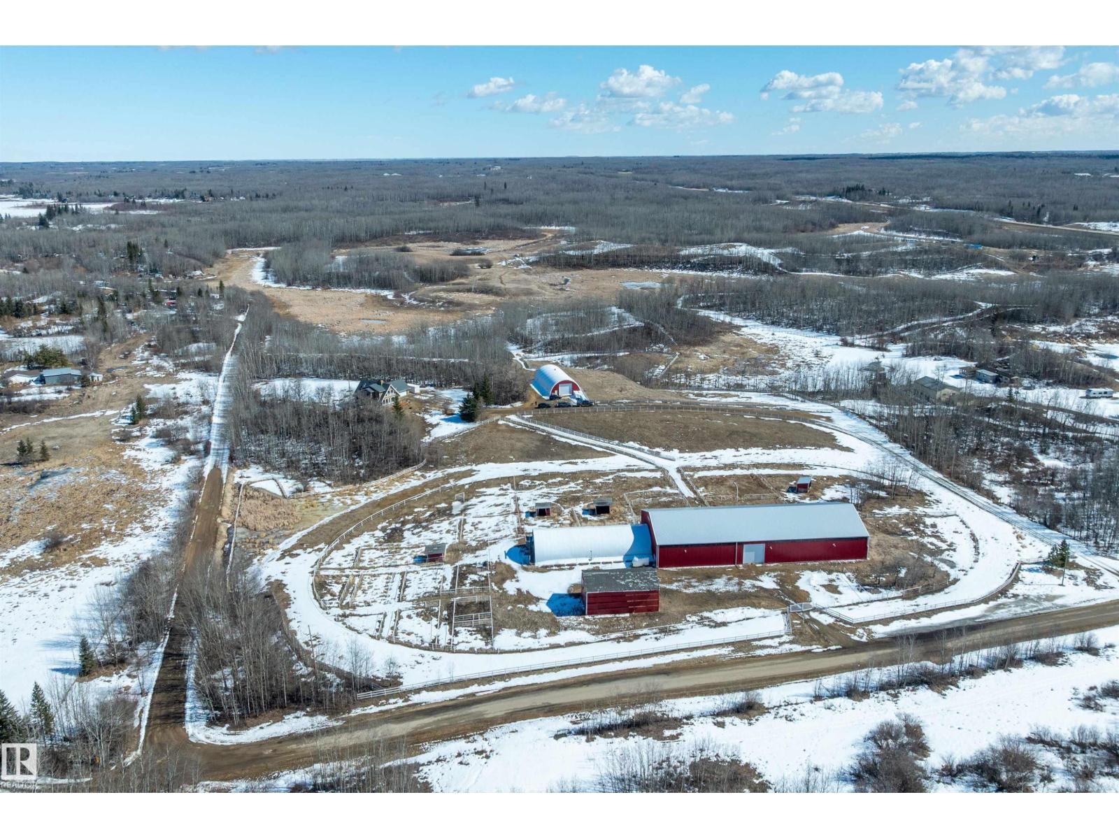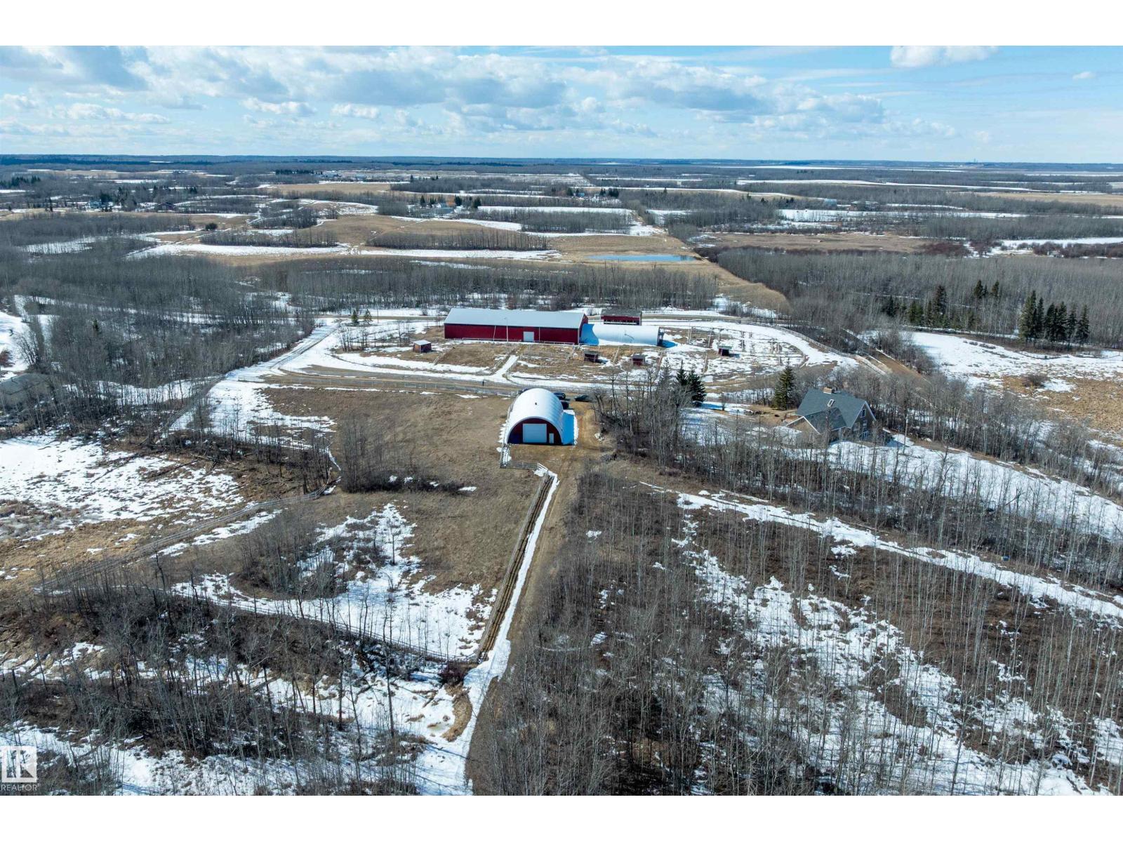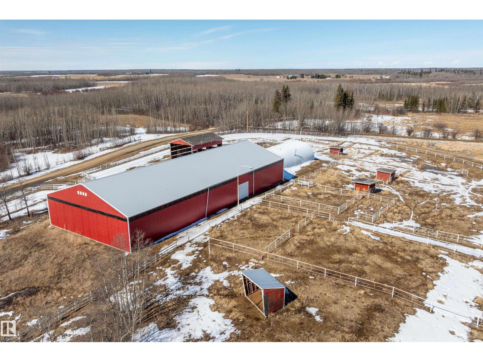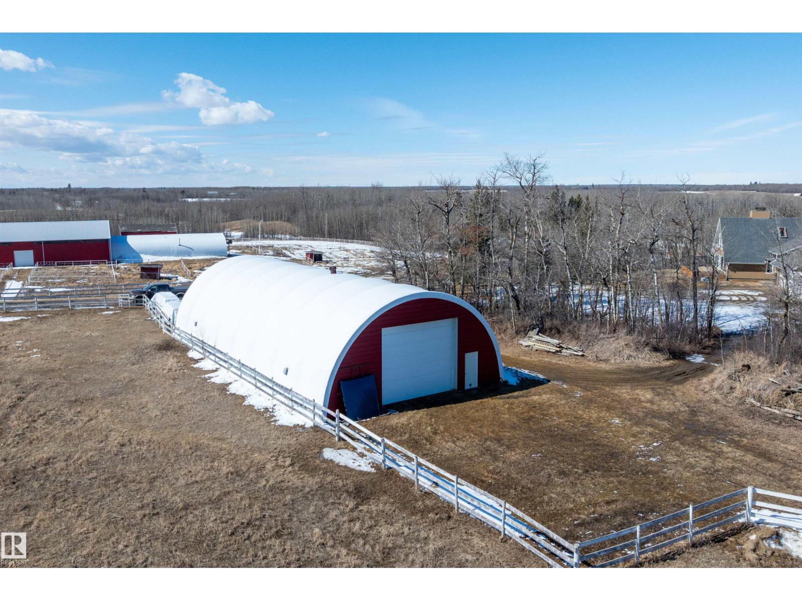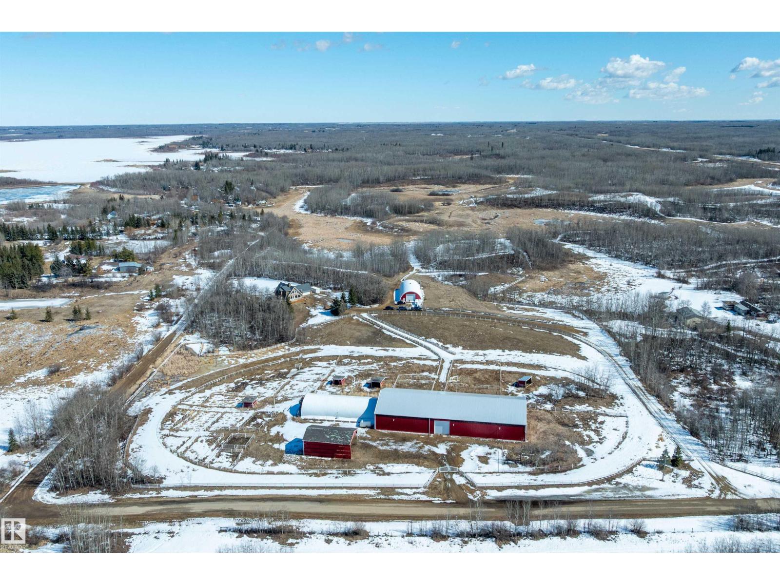 This property is a DREAM COME TRUE for EQUINE ENTHUSIASTS! Spanning 40.53 Acres, it offers everything you need for thriving equine activities! A 160 x 70 heated INDOOR RIDING ARENA, INSULATED & HEATED BARN w/septic, THIRTEEN-12 x 10 rubber matted stalls, WASH BAY, LAUNDRY/LUNCH ROOM, TACK RM & LOCKERS, & 2 pce bathrm. Outside you'll find numerous paddocks, 3 AUTO WATERERS, HAY & EQUIPMENT SHEDS, and an OVAL TRACK around the perimeter! The lrg 35 x 78 STORAGE QUONSET has 2x14 ft drive thru overhead doors & new vinyl cover. The FULLY RENOVATED house exudes charm with its vaulted ceilings boasting a cosy living area w/stone fireplace, 2 spacious bedrms, 2 bathrooms, and a GORGEOUS KITCHEN! Upper level has a MASSIVE PRIMARY SUITE w/4 pce ensuite, and is completed with a den w/fireplace overlooking the main level and AMAZING view out the west facing windows. Fully developed lower level is complete w/3 pce bath, bedrm, kitchen and flex areas. AMAZING HORSE PROPERTY on a beautiful and PRIVATE 40.53 Acres. (id:63190)