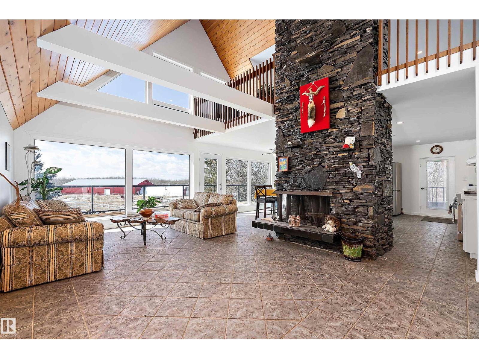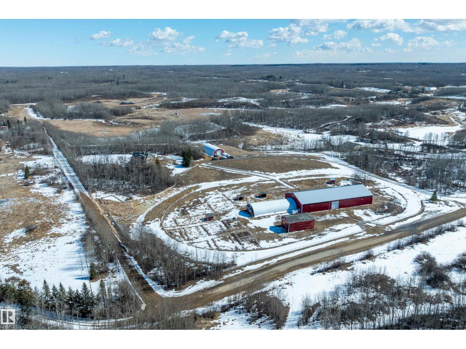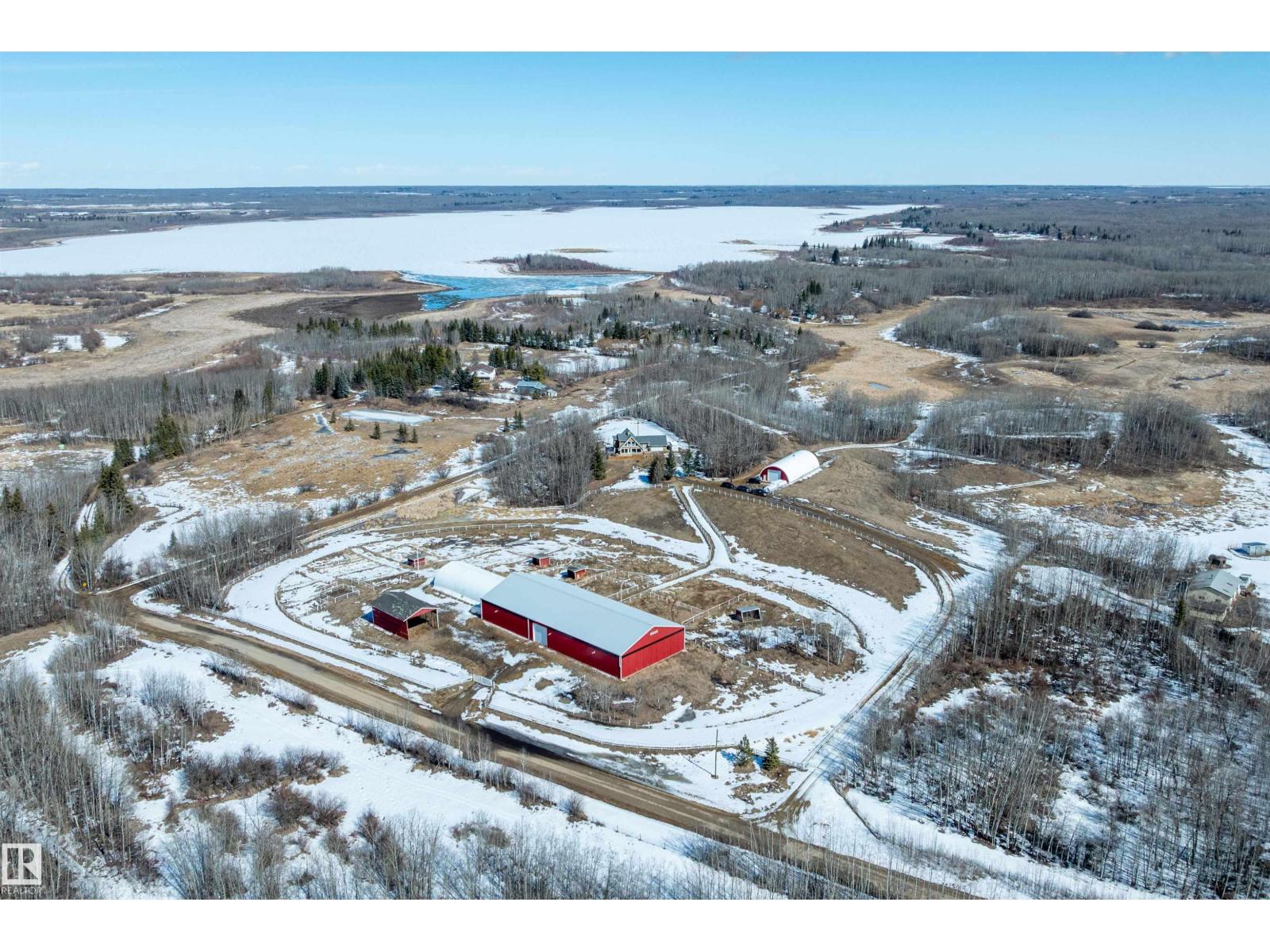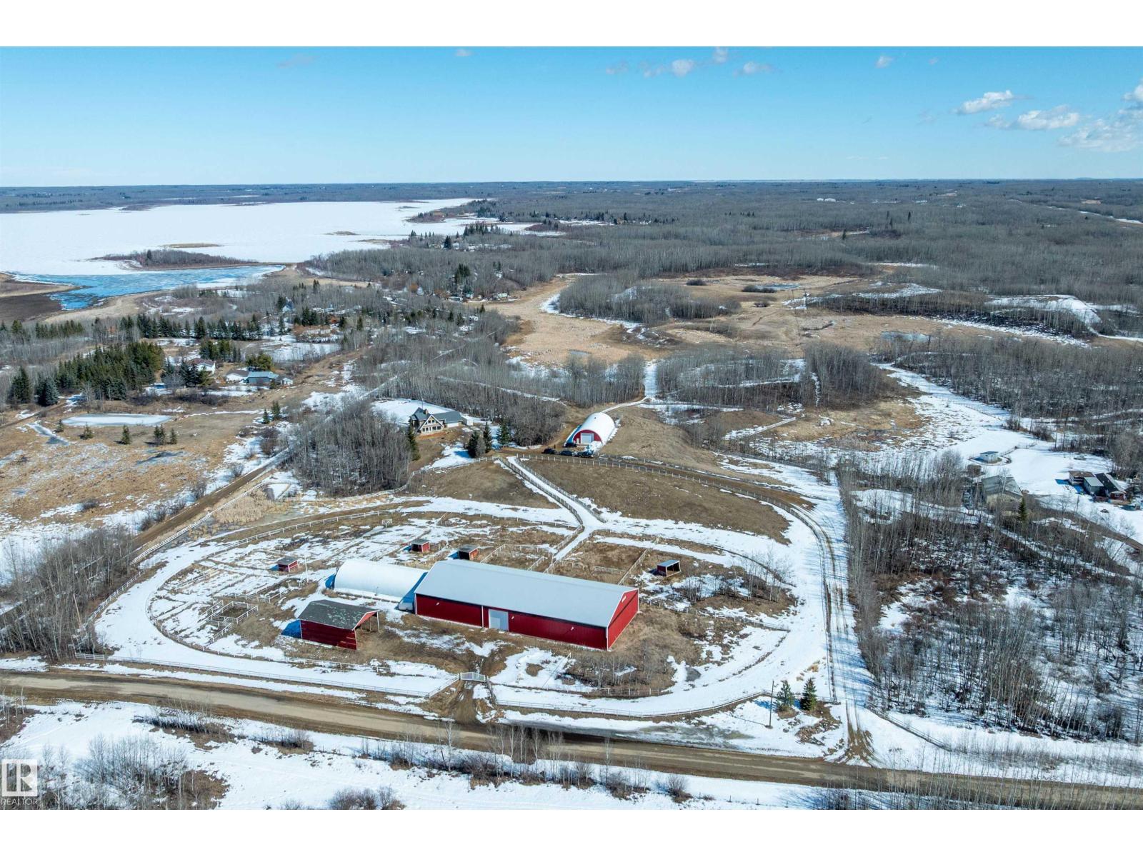This property is a DREAM COME TRUE for EQUINE ENTHUSIASTS! Spanning 40.53 Acres, it offers everything you need for thriving equine activities! A 160 x 70 heated INDOOR RIDING ARENA, INSULATED & HEATED BARN w/septic, THIRTEEN-12 x 10 rubber matted stalls, WASH BAY, LAUNDRY/LUNCH ROOM, TACK RM & LOCKERS, & 2 pce bathrm. Outside you'll find numerous paddocks, 3 AUTO WATERERS, HAY & EQUIPMENT SHEDS, and an OVAL TRACK around the perimeter! The lrg 35 x 78 STORAGE QUONSET has 2x14 ft drive thru overhead doors & new vinyl cover. The FULLY RENOVATED house exudes charm with its vaulted ceilings boasting a cosy living area w/stone fireplace, 2 spacious bedrms, 2 bathrooms, and a GORGEOUS KITCHEN! Upper level has a MASSIVE PRIMARY SUITE w/4 pce ensuite, and is completed with a den w/fireplace overlooking the main level and AMAZING view out the west facing windows. Fully developed lower level is complete w/3 pce bath, bedrm, kitchen and flex areas. AMAZING HORSE PROPERTY on a beautiful and PRIVATE 40.53 Acres. (id:63190)