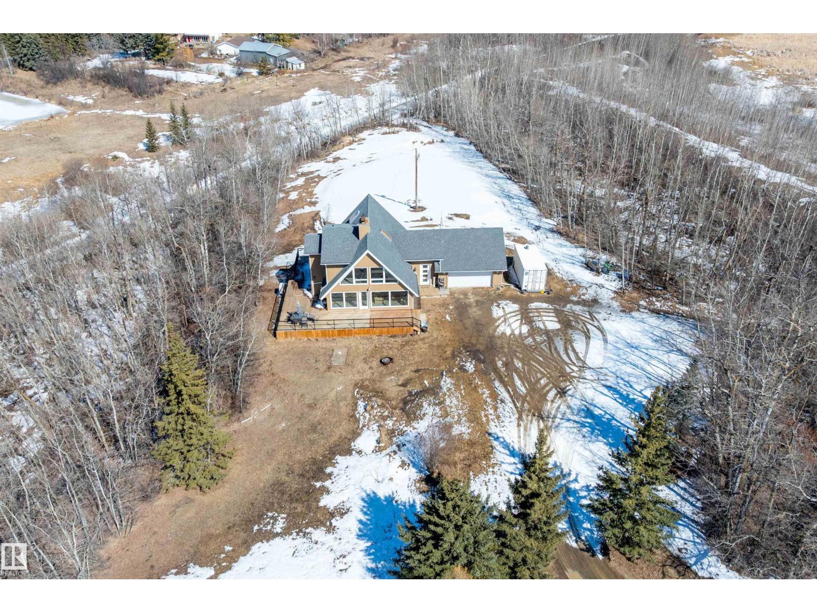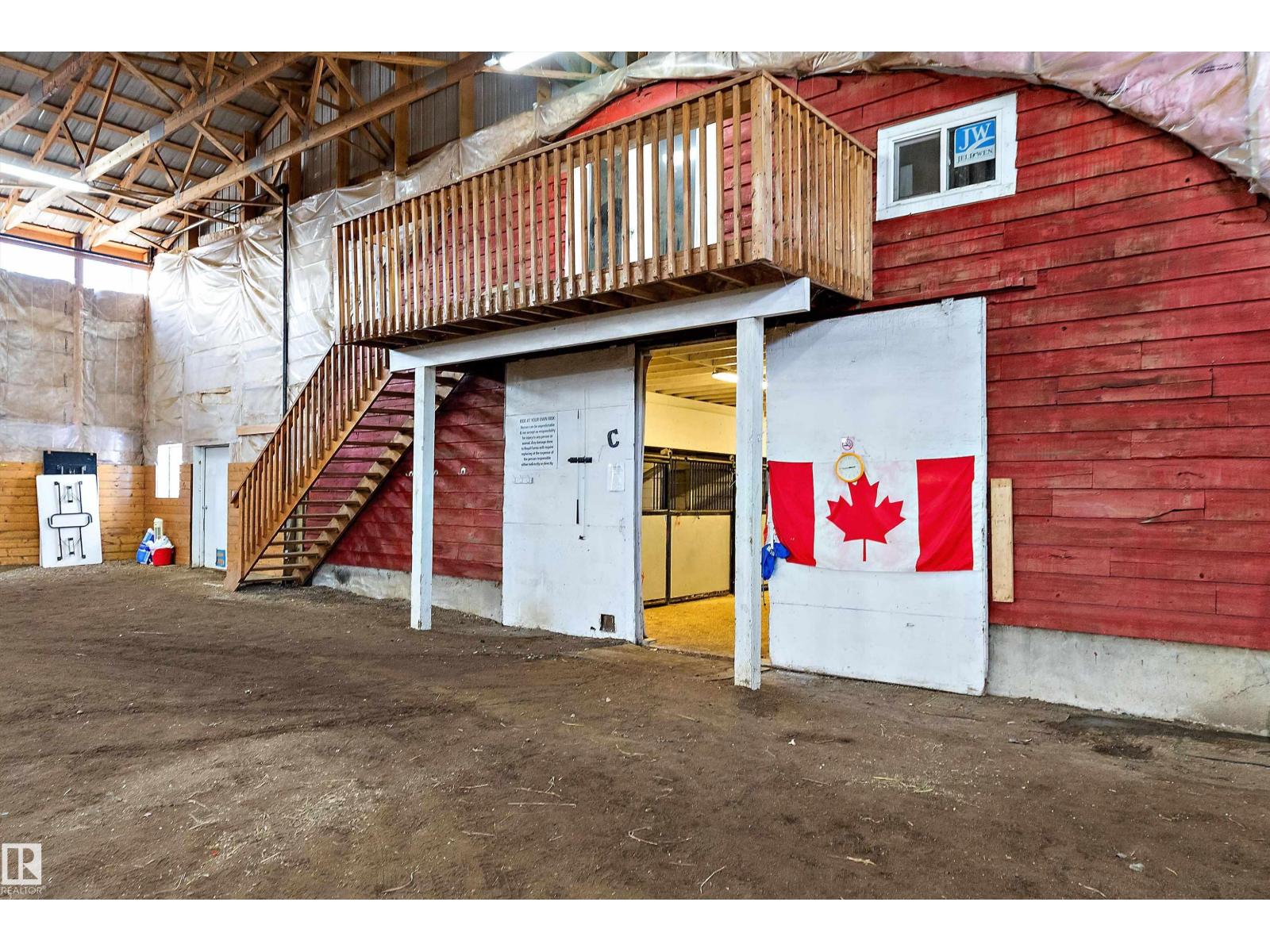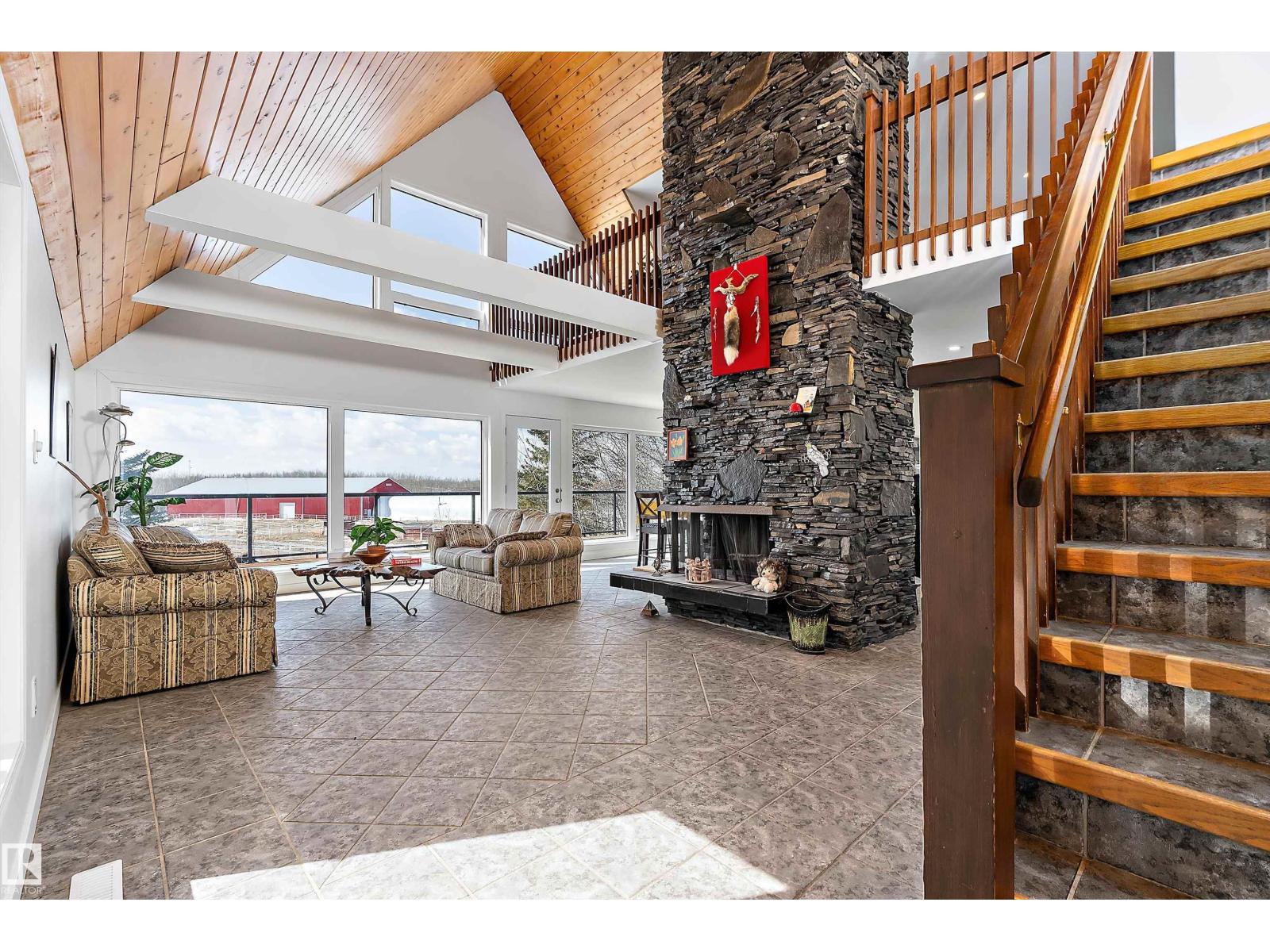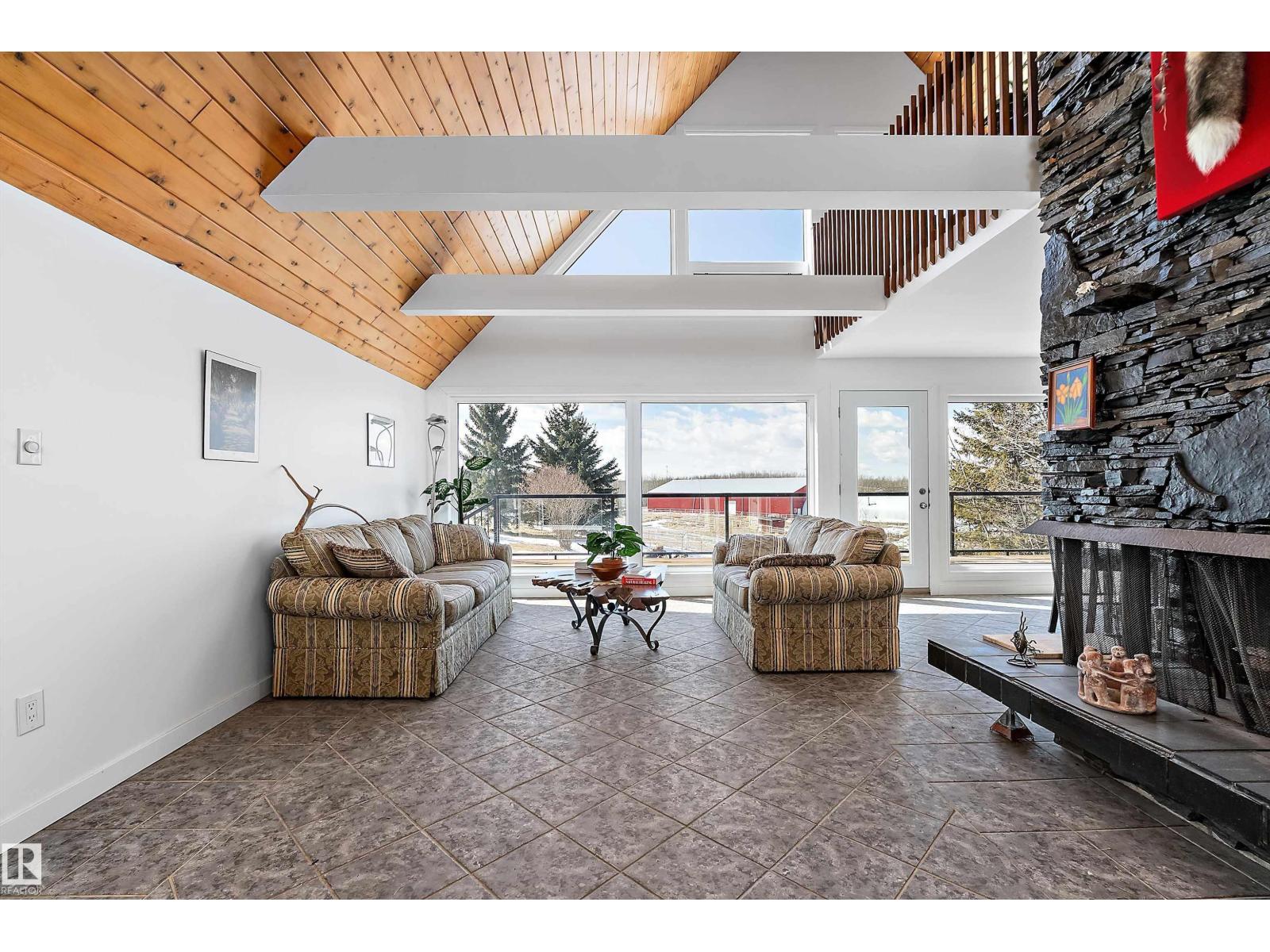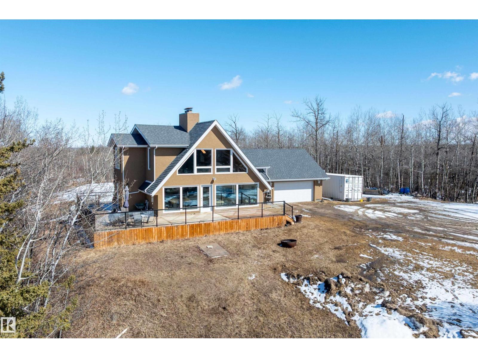 This property is a DREAM COME TRUE for EQUINE ENTHUSIASTS! Spanning 40.53 Acres, it offers everything you need for thriving equine activities! A 160 x 70 heated INDOOR RIDING ARENA, INSULATED & HEATED BARN w/septic, THIRTEEN-12 x 10 rubber matted stalls, WASH BAY, LAUNDRY/LUNCH ROOM, TACK RM & LOCKERS, & 2 pce bathrm. Outside you'll find numerous paddocks, 3 AUTO WATERERS, HAY & EQUIPMENT SHEDS, and an OVAL TRACK around the perimeter! The lrg 35 x 78 STORAGE QUONSET has 2x14 ft drive thru overhead doors & new vinyl cover. The FULLY RENOVATED house exudes charm with its vaulted ceilings boasting a cosy living area w/stone fireplace, 2 spacious bedrms, 2 bathrooms, and a GORGEOUS KITCHEN! Upper level has a MASSIVE PRIMARY SUITE w/4 pce ensuite, and is completed with a den w/fireplace overlooking the main level and AMAZING view out the west facing windows. Fully developed lower level is complete w/3 pce bath, bedrm, kitchen and flex areas. AMAZING HORSE PROPERTY on a beautiful and PRIVATE 40.53 Acres. (id:63190)