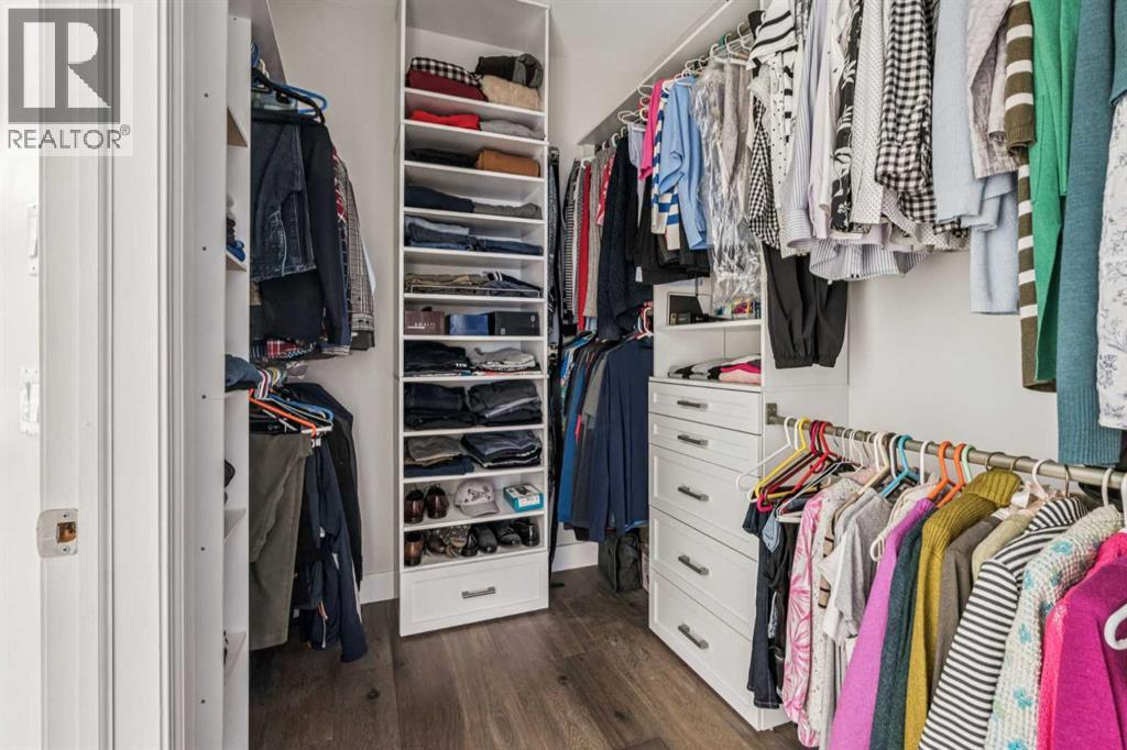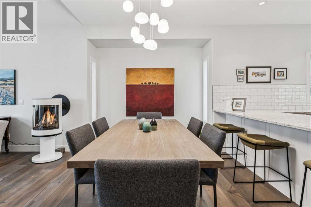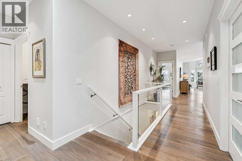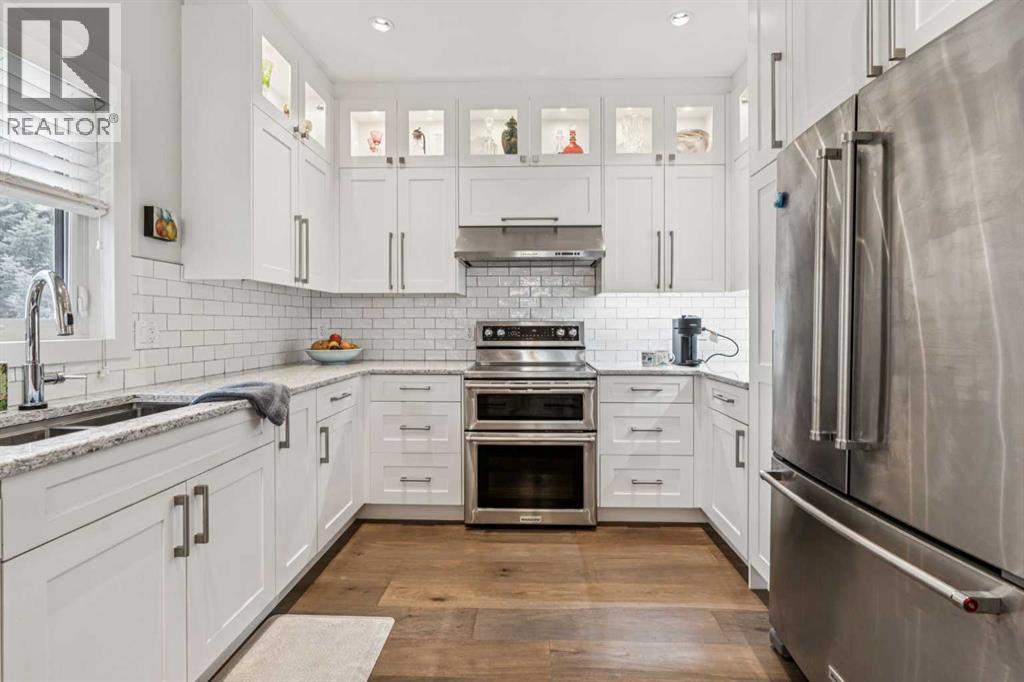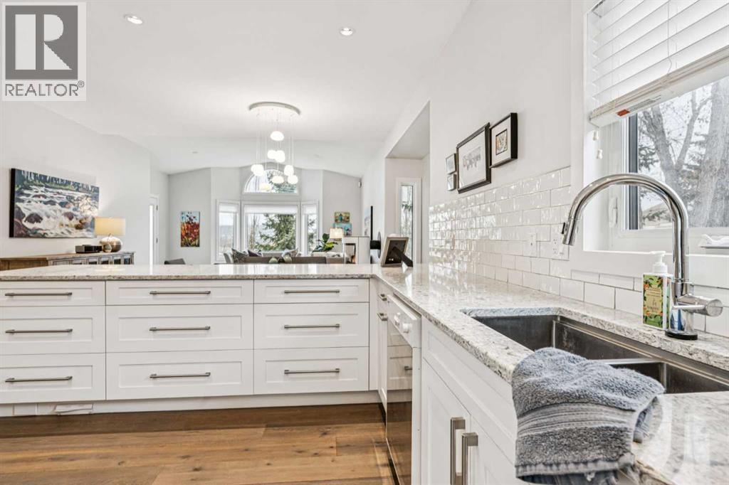This walkout bungalow sits on a large corner lot in Westchester Pointe Gardens, with views of Canada Olympic Park and mature trees surrounding the property for privacy and shade through the summer. The main floor has 9 foot ceilings with Divine Flooring white oak hardwood running across the level and down the stairs. A newer skylight brightens the foyer, and just off it is an office or den with French doors. The kitchen was fully gutted in 2016 with quartz countertops, full-length upper cabinetry, tile backsplash, an island open to the dining area, and new appliances. The dining area flows into the living room, both sitting under a cathedral ceiling anchored by a large arched window, with a new gas fireplace, south-facing exposure, and a walkout to a deck with an awning and a door with embedded blinds. The primary bedroom has a walk-in closet with pocket door and built-in organizers, and the ensuite has been updated with granite counters, a newer vanity, Moen fixtures, and newer flooring. A powder room with a custom cabinet and decorator sink and a laundry room sit off the garage entry. A glass panel stair railing with painted oak leads down to the walkout lower level. The large rec room has a gas fireplace with updated hearth and tile, built-in bookshelves, and opens to a covered patio. Two good-sized bedrooms sit off the hall along with a four-piece bathroom. Both bedroom windows were structurally enlarged for significantly more natural light. The hall and rec room have vinyl plank flooring and the bedrooms have newer carpet. The big-ticket items have all been handled. PolyB plumbing replaced with PEX on a home run manifold, triple pane windows throughout (2022), high efficiency furnace (2016), newer hot water tank (2024), and an electrically heated double garage with a newer opener. All toilets have been replaced and most light fixtures updated. Additional features include a clay tile roof, upgraded 6 inch gutters, water softener, and central vacuum. Westchester Pointe is a well-managed bare land condo with professional landscaping and snow removal. Walking distance to green space and pathways along the Bow River, five minutes to Canada Olympic Park, and quick access to Crowfoot Crossing, the LRT, Stoney Trail, and Highway 1 to the mountains. (id:63190)