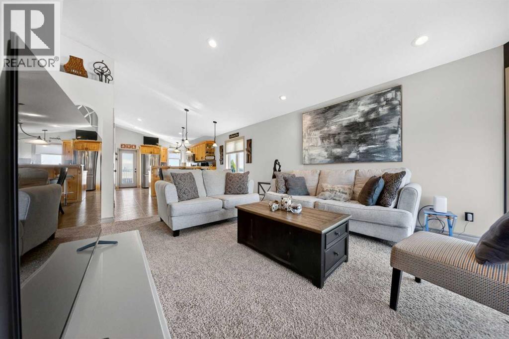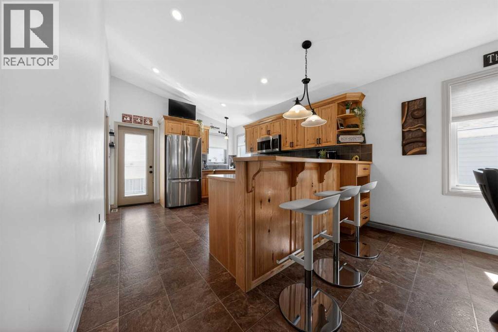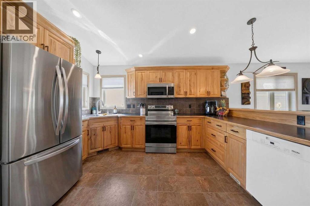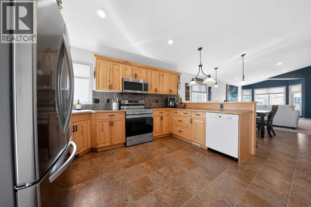 Well kept bi-level in Coalhurst with 6 BEDROOMS, 3 BATHROOMS, & an illegal basement suite backing field, park, and pond. Nice hardiboard plank exterior. Beyond Entry is walled off to upper and lower levels. Entry also has door to garage. Main floor features open plan with vaulted ceilings for living, dining, kitchen. Living room has nice windows for plenty of light. Dining space is a good size. Kitchen features wood cabinets with raised breakfast bar, new fridge and stove stainless steel appliances in 2025, corner sink, white dishwasher, and laundry closet. There is also a door to the deck out back. Primary bedroom is a good size with walk-in closet and 3 piece ensuite with walk-in shower. There are also 2 more bedrooms on the main and a full bathroom. Basement has large rec room, a 2nd kitchen with corner pantry and storage, 3 nice bedrooms, a laundry room, and a full bathroom with tub/shower combo. (id:63190)