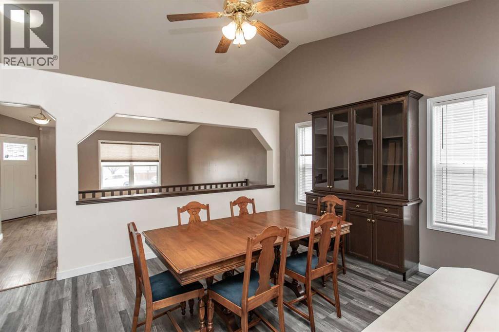 Step into a home where family memories have been made and are ready for many more. Relax on the charming front deck complete with classic porch swing, an ideal spot for morning coffee or winding down in the evening. Inside the open concept design creates a bright and connected living space, perfect for both everyday life and entertaining. The dining area is perfectly suited for family gatherings, holiday meals and everything in between. New laminate flooring throughout sections of the main area make for ease of care and durability. The generous kitchen space is adorned with a large amount of dark oak cabinetry, plenty of drawer space for your cooking essentials, display shelves, center island with eating bar great for additional seating, two closet pantries plus upgraded stainless steel appliances. Front guest room is perfect for company or even could be used for a home office or study. Convenient main floor laundry not only saves you steps but also your back with the appliances raised not only providing storage above but underneath. A spacious Primary bedroom not only offers room for your King size bed but also his & her closets plus your own private three piece en suite. Follow down to the fully developed basement and enjoy the massive rec/games room. Ideal for seasonal parties with the family you will have no shortage of space for everyone. Two additional bedrooms one of them is an extra large teenager dream room with a deep closet and new sliding barn door complimenting the space. An additional three piece bath saves heading back upstairs as well. The large utility room not only offers a newer hot water tank but also plenty of additional storage space for your items. Spring is just about here so why not enjoy spending it on the large back deck. Adjustable louvers added for privacy plus a roll down blind. Great amount of yard space for the kids to enjoy even includes the swing set. Dry storage under the deck plus the large garden shed is ideal for yard items. An incredible 26x26 garage insulated with two over head doors makes for an ideal space for vehicle storage or hobbyist as the large work bench remains plus there is even wiring for small heater and EV charging port. Room for small RV or additional vehicle parking on side of garage. Wonderful location this home is situated two blocks from school, parks, skating rink and green space makes things great for the kids or Grandkids. Keep cool in the summer with the A/C unit perfect for the warm days to come. Whether your a family getting into the market or maybe a retiring downsizer this home will check a lot of your boxes. (id:63190)