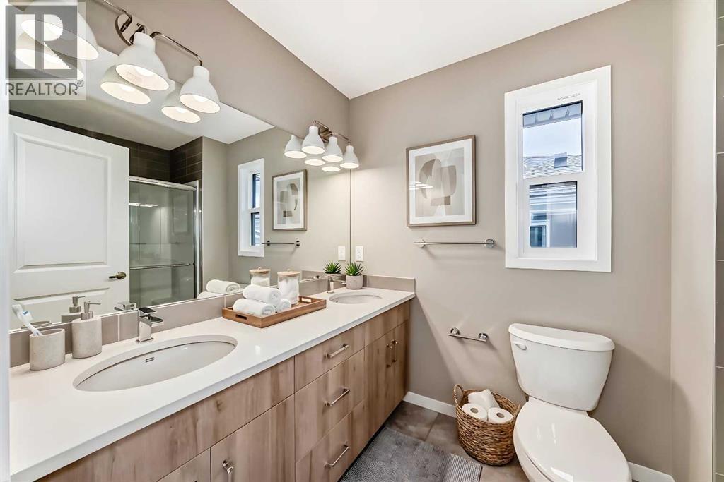 Welcome to the “Joni” floor plan—an intelligently designed semi-detached home that blends stylish finishes, practical functionality, and an unbeatable location in one of Calgary’s most desirable lake communities. Situated directly across from the historic Ollerenshaw Heritage Ranch, this home offers a truly special setting—combining Mahogany’s vibrant modern lifestyle with a sense of character, openness, and charm that is difficult to find elsewhere. Inside, the main floor makes an immediate impression with soaring 10’ ceilings, wide-plank luxury vinyl flooring, and a bright, airy layout that feels both elevated and welcoming. At the front of the home, a versatile flex room creates the perfect space for a home office, reading area, playroom, or creative workspace—offering flexibility to suit a variety of lifestyles. Moving toward the back of the home, the layout opens beautifully into the main living area, where the kitchen, dining, and living spaces connect seamlessly for easy everyday living and effortless entertaining. The spacious living room flows into the oversized dining area, creating a warm and functional setting for family meals, casual gatherings, or hosting friends. The kitchen is a standout, featuring raised cabinetry, quartz countertops, stainless steel appliances, a stand-alone chimney hood fan, modern tile backsplash, and a large central island that anchors the space with style and function. Upstairs, a central bonus room provides valuable additional living space—ideal for movie nights, a kids’ hangout, or a quiet place to relax. The primary bedroom offers a peaceful retreat, complete with a generous walk-in closet and a spa-inspired 4-piece ensuite that adds a touch of everyday luxury. Two additional bedrooms, another full 4-piece bathroom, and a conveniently located upper-floor laundry room complete the level with comfort and practicality. Adding even more value and versatility, the basement is fully finished with a legal 2 bedroom, 2 bathroom seco ndary suite—perfect for multi-generational living, extended family, guests, or those looking for the added benefit of rental income. With its own separate living space and legal status, this lower level significantly enhances both the functionality and long-term appeal of the home. Beyond the home itself, the location is a major highlight. Being directly across from Ollerenshaw Heritage Ranch adds a unique sense of place and character to everyday life. Set within the award-winning lake community of Mahogany, residents enjoy access to Calgary’s largest freshwater lake, two sandy beaches, the private Beach Club, skating rinks, sport courts, fishing docks, and over 22 km of scenic pathways winding through stunning wetlands. Just minutes from South Health Campus, the Seton Urban District, and Mahogany’s growing selection of shops, restaurants, and amenities, this is a community built around convenience, connection, and year-round lifestyle. This is more than just a home—it’s a lifestyle worth enjoying! (id:63190)