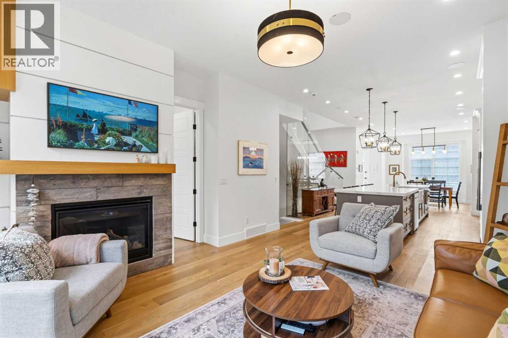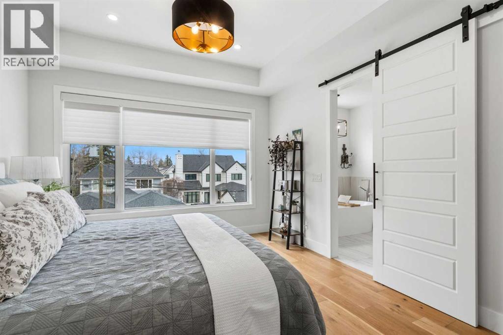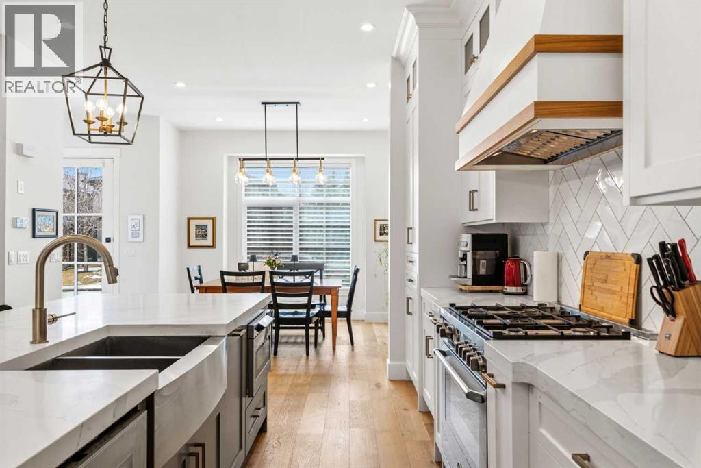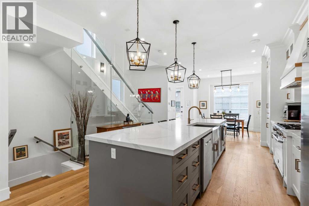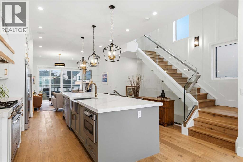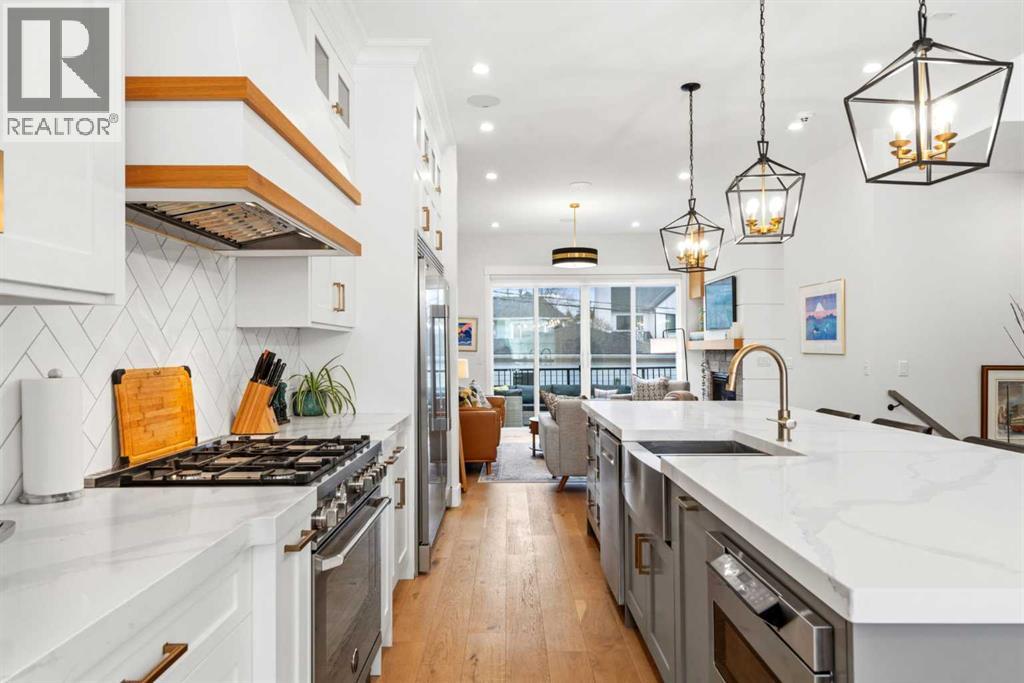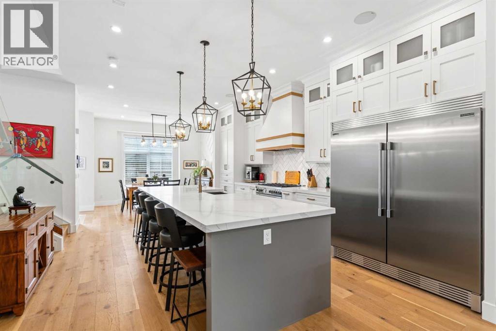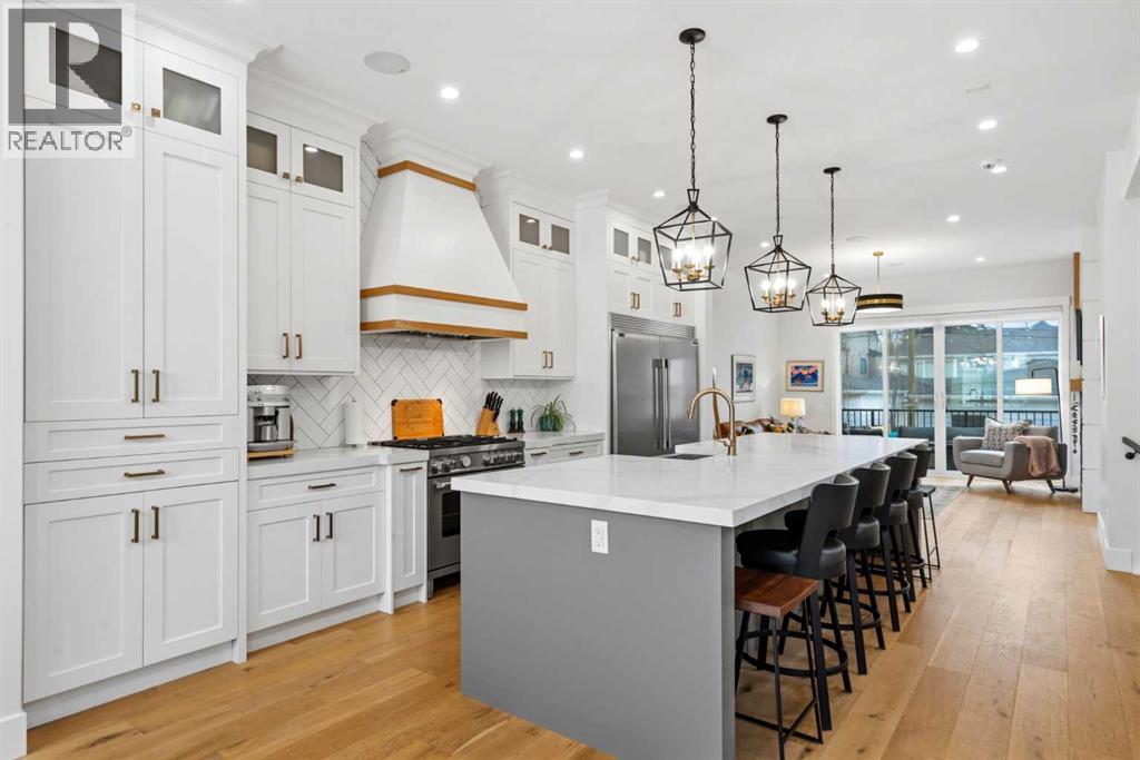 This exceptional, modern farmhouse style home, where architectural refinement & timeless design converge on a quiet, tree-lined street in the heart of Altadore. With 2,836 sq ft of curated living space, this stunning four-bedroom, 3.5 bath residence seamlessly blends upscale finishes with thoughtful functionality. Soaring 10 foot flat ceilings, engineered white oak wood flooring throughout, & striking 8 foot doors enhance the sense of openness & grandeur. Expansive windows flood the open concept main floor with natural light, illuminating a front dining area adorned with a detailed feature wall that flows effortlessly into the chef-inspired kitchen. The kitchen is designed for both everyday living & elegant entertaining & features custom, full height white cabinetry, subway tile backsplash, quartz countertops, a massive two-toned island with an eating bar & premium appliances, including a Bertazzoni gas range, dual full-sized fridge & freezer & drawer style microwave. The inviting living room offers a warm refined atmosphere, with a modern gas fireplace & custom built-ins. Large patio doors open to an expansive rear deck with a Suncoast enclosure featuring a motorized louvre roof and retractable screens - offering all-season outdoor living with adjustable sun, shade, and airflow. The mudroom with custom built-ins & a stylish powder room complete the main level. A dramatic architectural staircase with extra wide wood treads & sleek glass walls leads to the upper floor. The primary suite showcases a tray ceiling and a spacious walk-in closet. A sliding barn door leads to the spa-inspired ensuite, which offers in-floor heating, dual vanities, a freestanding soaker tub, an oversized glass-enclosed shower & a private water closet, delivering a serene experience. Two additional bedrooms, one with a walk-in closet, share a beautiful bathroom, while a dedicated laundry room with cabinetry & sink ensures everyday convenience. The fully finished basement is designed for both relaxation & entertaining, featuring in floor heating, a generous family room, a designer wet bar complete with open shelving, upper & lower cabinetry, & beverage fridge area, plus a fourth bedroom with a large walk-in closet & full bathroom. Enjoy seamless outdoor living with a private front patio, perfect for summer evenings & entertaining. Features include central air conditioning, in-ceiling speakers, custom blinds with blackout in the upstairs bedrooms, plus a fully insulated, drywalled, heated double detached garage with a paved lane. Perfectly positioned in one of Calgary’s most sought-after communities, this residence offers an unmatched lifestyle with exceptional walkability. Enjoy being just moments from River Park, Sandy Beach Park, Monogram Coffee, the vibrant shops, restaurants & cafes of Marda Loop. Quick access to Crowchild, Glenmore & Stoney Trail. This is a meticulously crafted home that delivers sophistication, comfort, and distinction at every turn. (id:63190)