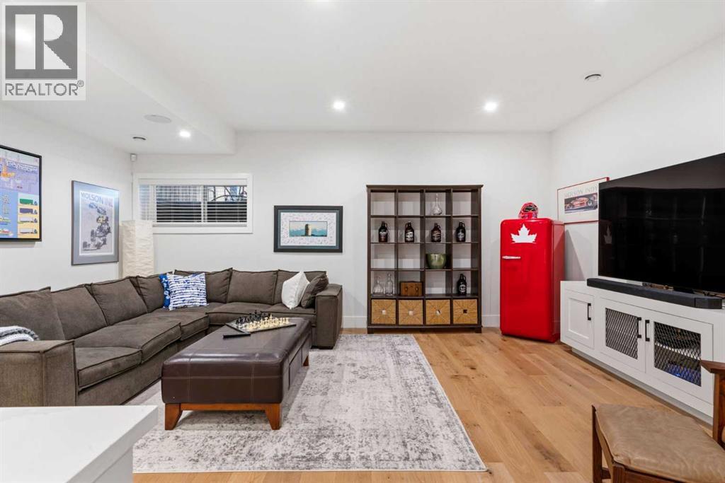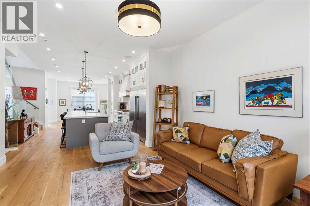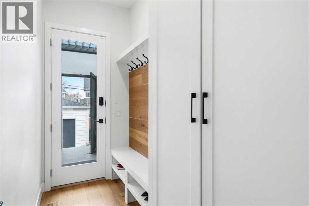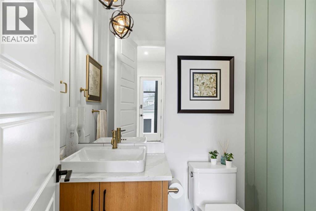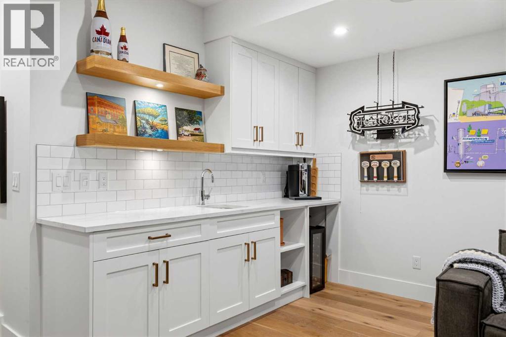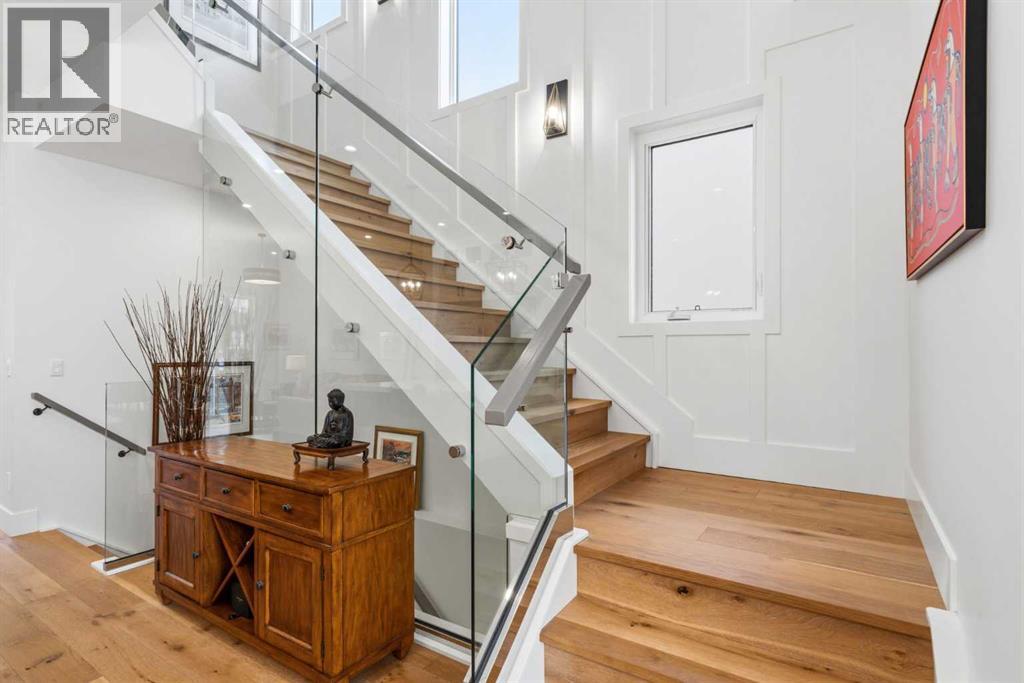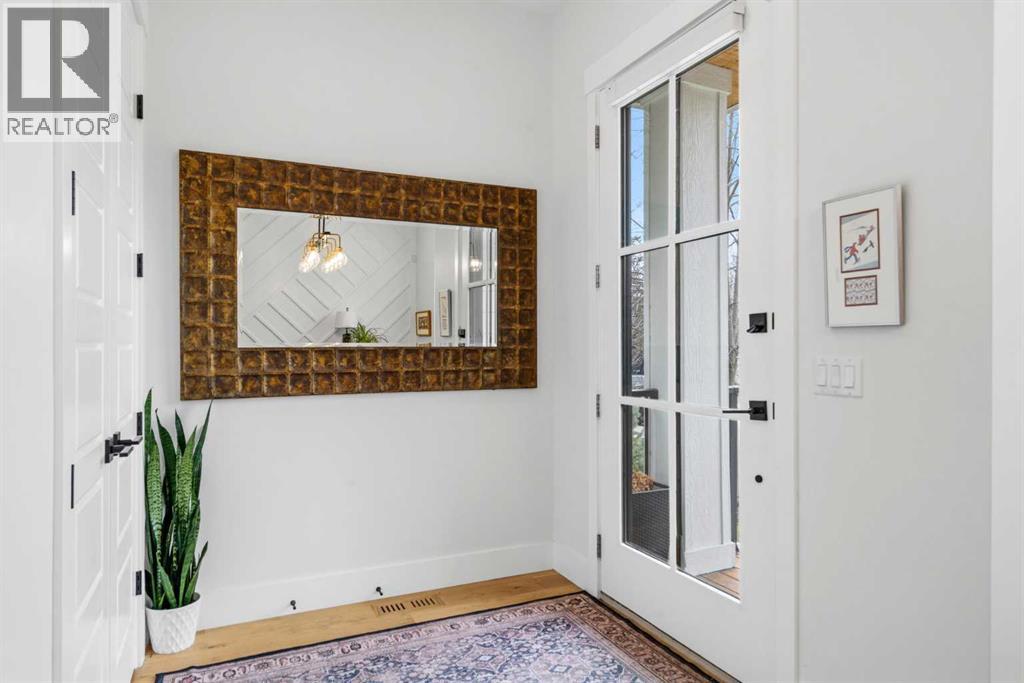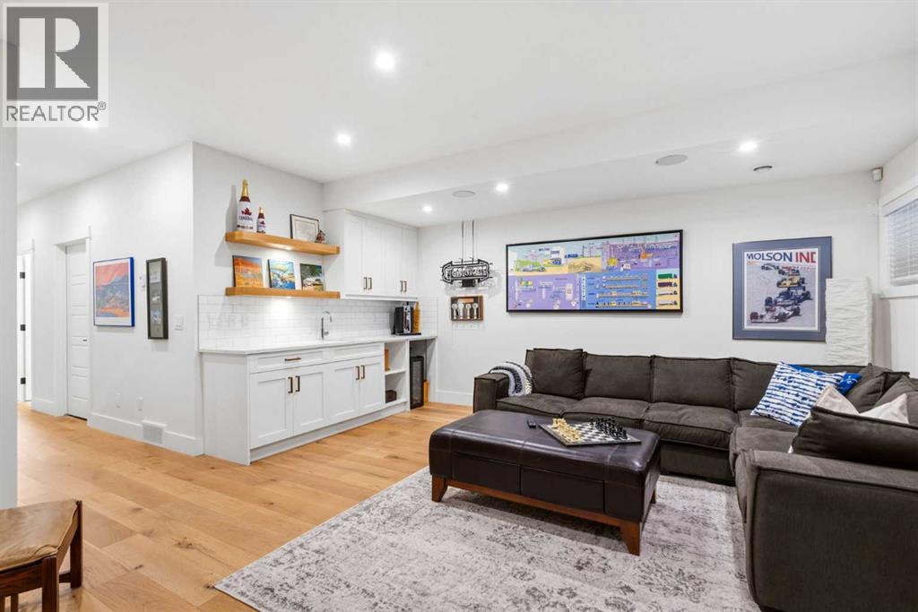 This exceptional, modern farmhouse style home, where architectural refinement & timeless design converge on a quiet, tree-lined street in the heart of Altadore. With 2,836 sq ft of curated living space, this stunning four-bedroom, 3.5 bath residence seamlessly blends upscale finishes with thoughtful functionality. Soaring 10 foot flat ceilings, engineered white oak wood flooring throughout, & striking 8 foot doors enhance the sense of openness & grandeur. Expansive windows flood the open concept main floor with natural light, illuminating a front dining area adorned with a detailed feature wall that flows effortlessly into the chef-inspired kitchen. The kitchen is designed for both everyday living & elegant entertaining & features custom, full height white cabinetry, subway tile backsplash, quartz countertops, a massive two-toned island with an eating bar & premium appliances, including a Bertazzoni gas range, dual full-sized fridge & freezer & drawer style microwave. The inviting living room offers a warm refined atmosphere, with a modern gas fireplace & custom built-ins. Large patio doors open to an expansive rear deck with a Suncoast enclosure featuring a motorized louvre roof and retractable screens - offering all-season outdoor living with adjustable sun, shade, and airflow. The mudroom with custom built-ins & a stylish powder room complete the main level. A dramatic architectural staircase with extra wide wood treads & sleek glass walls leads to the upper floor. The primary suite showcases a tray ceiling and a spacious walk-in closet. A sliding barn door leads to the spa-inspired ensuite, which offers in-floor heating, dual vanities, a freestanding soaker tub, an oversized glass-enclosed shower & a private water closet, delivering a serene experience. Two additional bedrooms, one with a walk-in closet, share a beautiful bathroom, while a dedicated laundry room with cabinetry & sink ensures everyday convenience. The fully finished basement is designed for both relaxation & entertaining, featuring in floor heating, a generous family room, a designer wet bar complete with open shelving, upper & lower cabinetry, & beverage fridge area, plus a fourth bedroom with a large walk-in closet & full bathroom. Enjoy seamless outdoor living with a private front patio, perfect for summer evenings & entertaining. Features include central air conditioning, in-ceiling speakers, custom blinds with blackout in the upstairs bedrooms, plus a fully insulated, drywalled, heated double detached garage with a paved lane. Perfectly positioned in one of Calgary’s most sought-after communities, this residence offers an unmatched lifestyle with exceptional walkability. Enjoy being just moments from River Park, Sandy Beach Park, Monogram Coffee, the vibrant shops, restaurants & cafes of Marda Loop. Quick access to Crowchild, Glenmore & Stoney Trail. This is a meticulously crafted home that delivers sophistication, comfort, and distinction at every turn. (id:63190)
