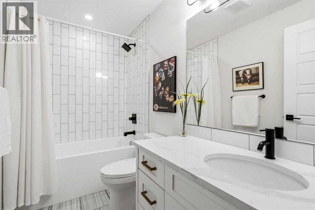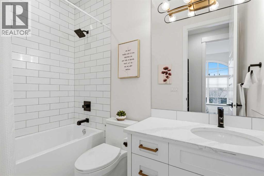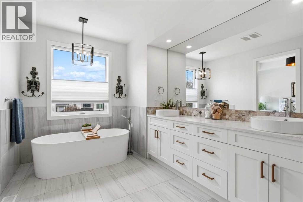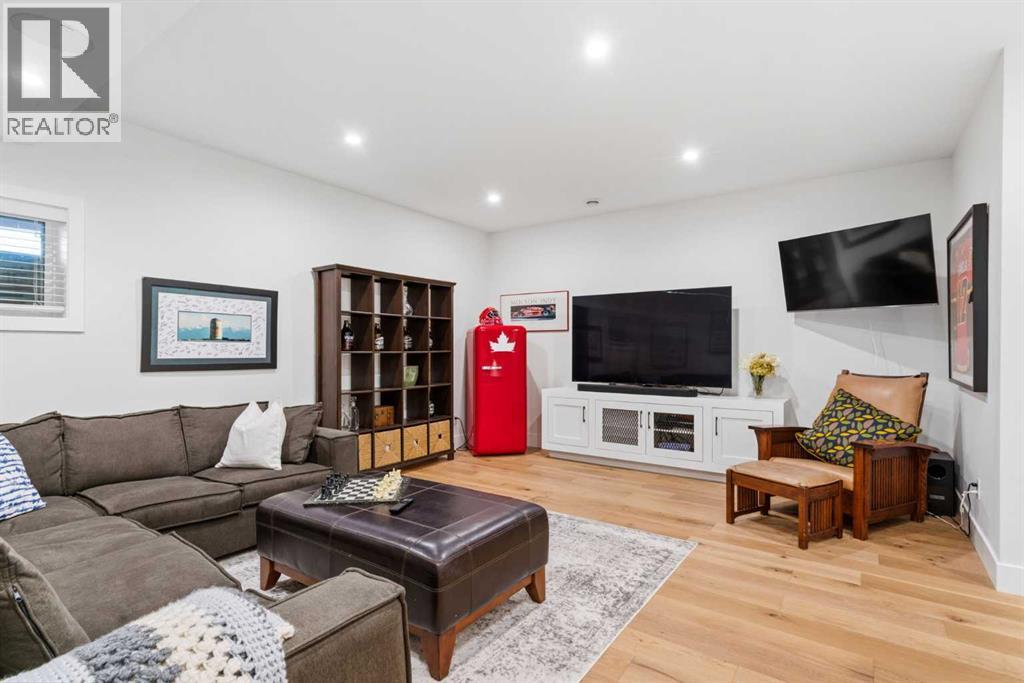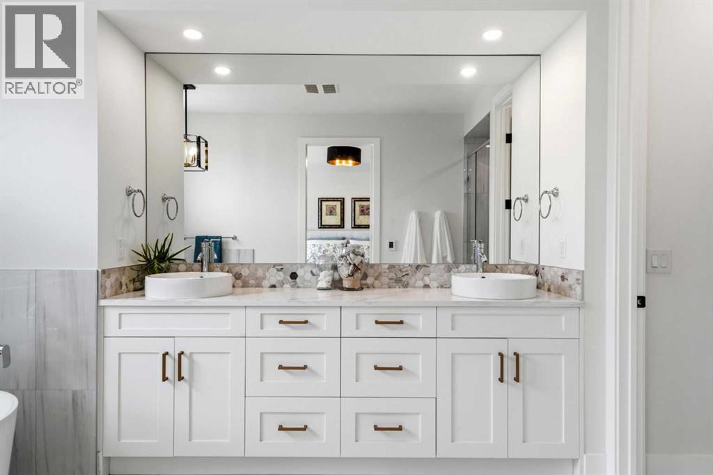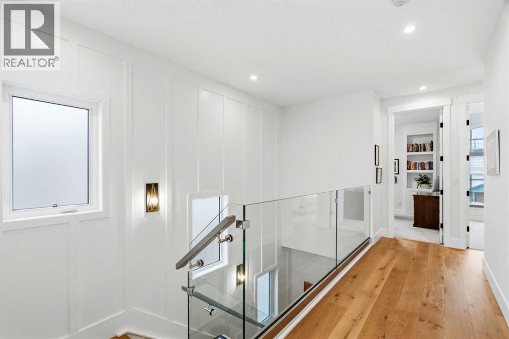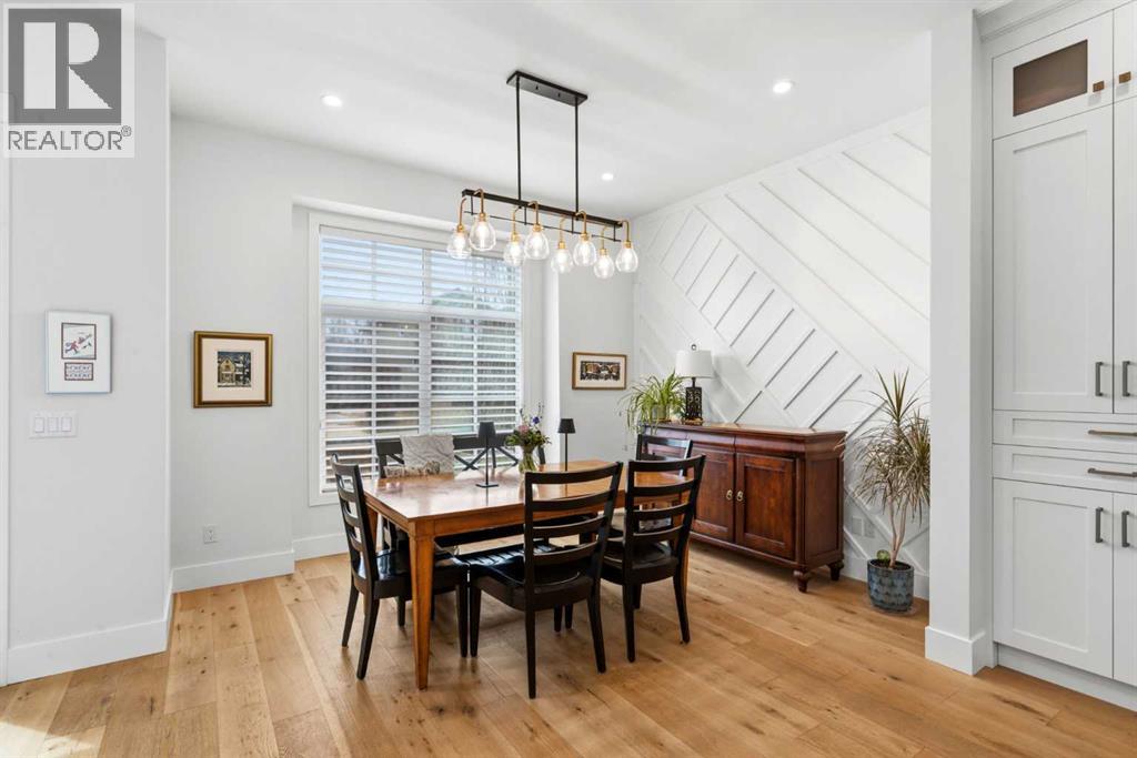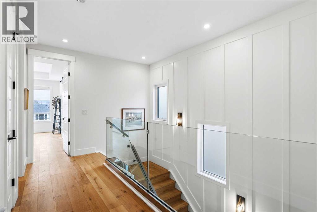 This exceptional, modern farmhouse style home, where architectural refinement & timeless design converge on a quiet, tree-lined street in the heart of Altadore. With 2,836 sq ft of curated living space, this stunning four-bedroom, 3.5 bath residence seamlessly blends upscale finishes with thoughtful functionality. Soaring 10 foot flat ceilings, engineered white oak wood flooring throughout, & striking 8 foot doors enhance the sense of openness & grandeur. Expansive windows flood the open concept main floor with natural light, illuminating a front dining area adorned with a detailed feature wall that flows effortlessly into the chef-inspired kitchen. The kitchen is designed for both everyday living & elegant entertaining & features custom, full height white cabinetry, subway tile backsplash, quartz countertops, a massive two-toned island with an eating bar & premium appliances, including a Bertazzoni gas range, dual full-sized fridge & freezer & drawer style microwave. The inviting living room offers a warm refined atmosphere, with a modern gas fireplace & custom built-ins. Large patio doors open to an expansive rear deck with a Suncoast enclosure featuring a motorized louvre roof and retractable screens - offering all-season outdoor living with adjustable sun, shade, and airflow. The mudroom with custom built-ins & a stylish powder room complete the main level. A dramatic architectural staircase with extra wide wood treads & sleek glass walls leads to the upper floor. The primary suite showcases a tray ceiling and a spacious walk-in closet. A sliding barn door leads to the spa-inspired ensuite, which offers in-floor heating, dual vanities, a freestanding soaker tub, an oversized glass-enclosed shower & a private water closet, delivering a serene experience. Two additional bedrooms, one with a walk-in closet, share a beautiful bathroom, while a dedicated laundry room with cabinetry & sink ensures everyday convenience. The fully finished basement is designed for both relaxation & entertaining, featuring in floor heating, a generous family room, a designer wet bar complete with open shelving, upper & lower cabinetry, & beverage fridge area, plus a fourth bedroom with a large walk-in closet & full bathroom. Enjoy seamless outdoor living with a private front patio, perfect for summer evenings & entertaining. Features include central air conditioning, in-ceiling speakers, custom blinds with blackout in the upstairs bedrooms, plus a fully insulated, drywalled, heated double detached garage with a paved lane. Perfectly positioned in one of Calgary’s most sought-after communities, this residence offers an unmatched lifestyle with exceptional walkability. Enjoy being just moments from River Park, Sandy Beach Park, Monogram Coffee, the vibrant shops, restaurants & cafes of Marda Loop. Quick access to Crowchild, Glenmore & Stoney Trail. This is a meticulously crafted home that delivers sophistication, comfort, and distinction at every turn. (id:63190)