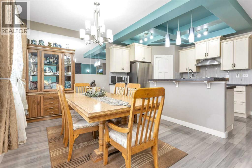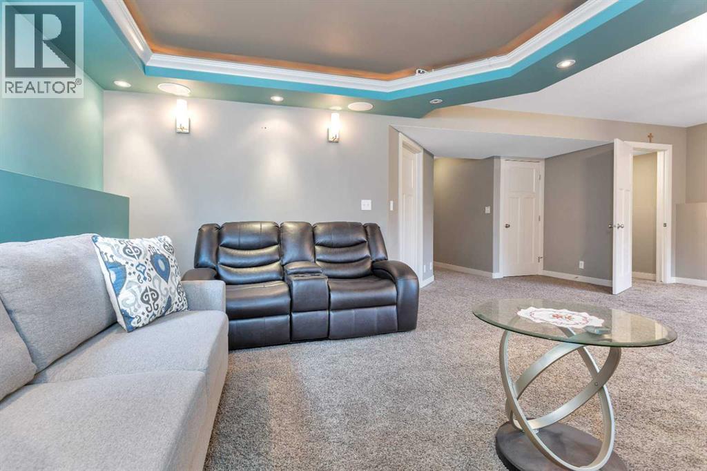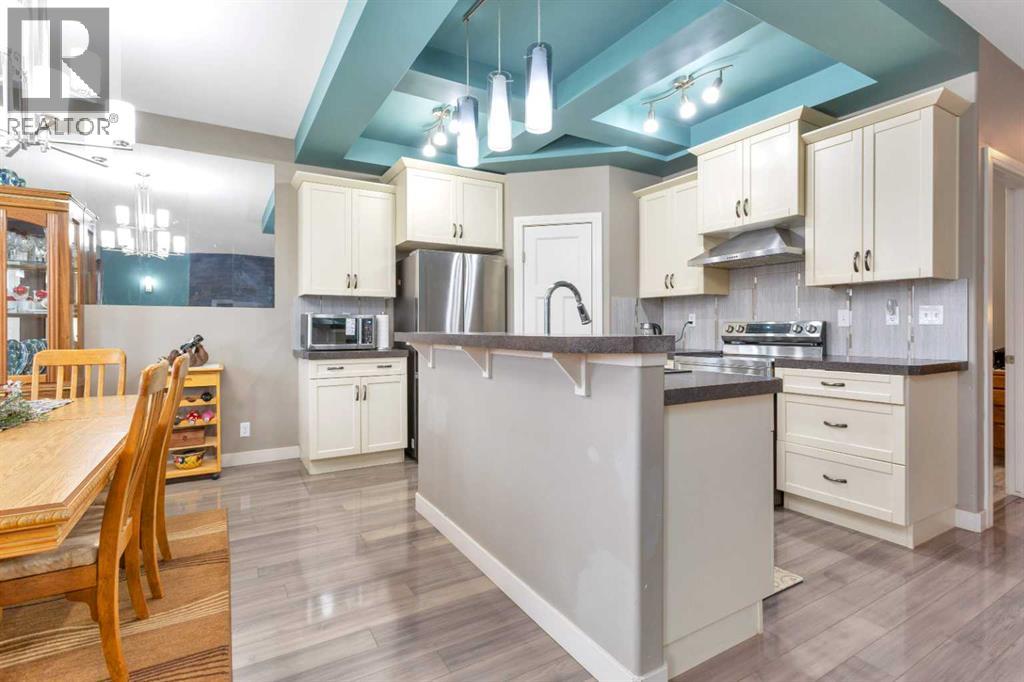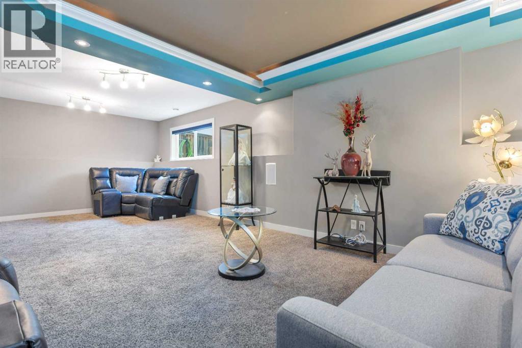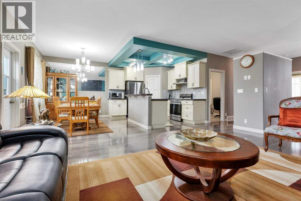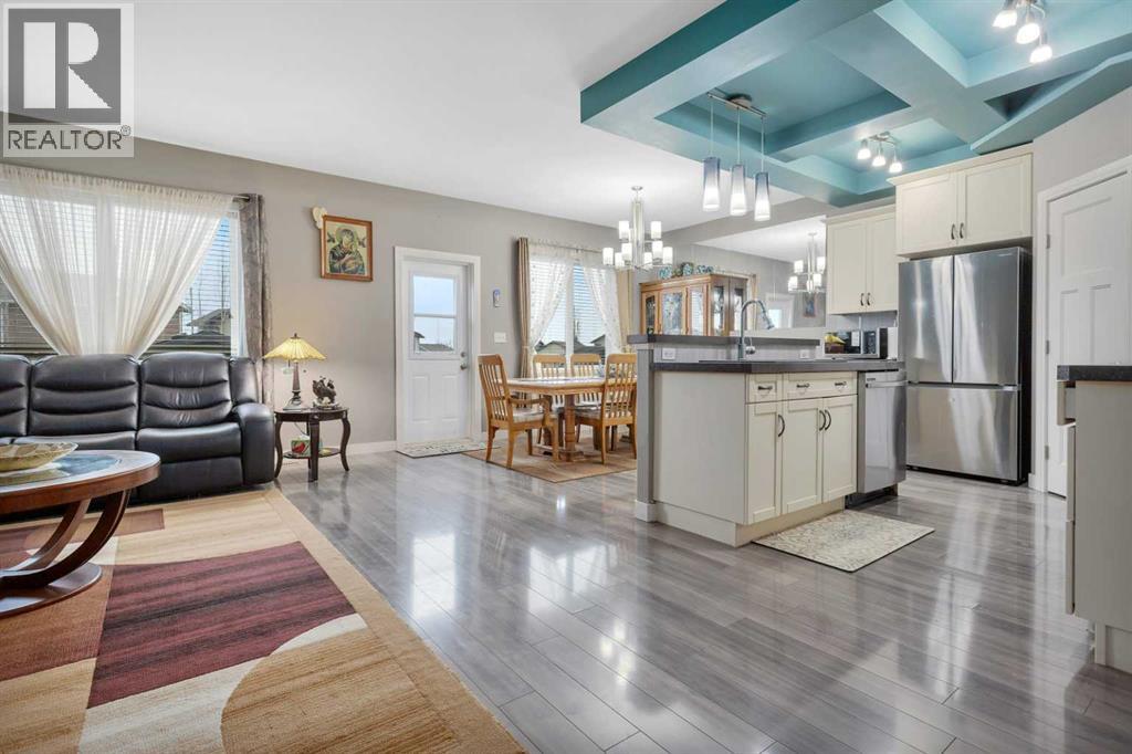 Gorgeous fully finished bi-level featuring coffered 9’ ceilings throughout the main floor and a bright, open-concept design. This 4 bedroom, 3 bathroom home offers a warm and inviting living space complete with a gas fireplace accented by stone surround, built-in shelving, and gleaming laminate flooring. The spacious entry welcomes you with a generous closet, leading upstairs to a well-appointed kitchen showcasing stainless steel appliances, quality cabinetry, and a functional breakfast bar. The open layout seamlessly connects the kitchen, dining, and living areas, with garden door access to a large south-facing deck—perfect for summer BBQs and effortless entertaining. The primary bedroom easily accommodates a king-sized suite and features a walk-in closet and private 3-piece ensuite. A second bedroom and a full 4-piece bathroom complete the main level. Downstairs, you’ll be impressed by the massive 21’ x 18’ family room, highlighted by a stunning coffered, lighted ceiling and several built in speakers. The lower level also includes two additional bedrooms (one with a large walk-in closet), a 4-piece bathroom, and a laundry room with in-floor heat and large windows that bring in plenty of natural light. Step outside to enjoy the fully fenced yard and BRAND NEW 20’ x 24’ garage. All of this is perfectly complemented by peaceful country views right across the street. Solar panels provide an added benefit, enhancing energy efficiency and long-term savings. (id:63190)