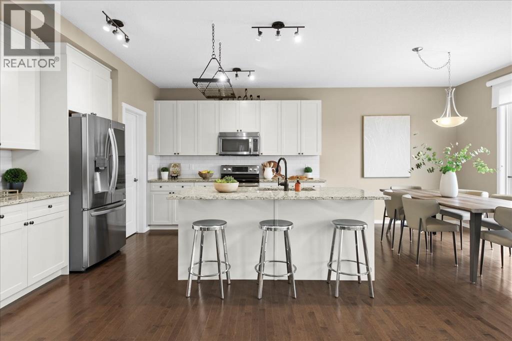 From the moment you arrive, this home makes a lasting impression: rich blue exterior, stacked stone accents, and striking gable detailing come together to create a home that stands out beautifully on this quiet Tuscany street. The mature landscaping and welcoming front entry only add to that first feeling, an unmistakable sense that this is a well-loved home, one that makes it easy to understand why the current owner has happily spent the past decade here.Inside, natural light moves effortlessly through the main floor, lending a warmth that settles in the moment you step inside. The kitchen is generous without ever feeling overstated; timeless white shaker cabinets, quartz countertops, classic subway tile, and stainless-steel appliances anchored together with ease. The breakfast nook and walk-through pantry sit right where you need them, adding to the rhythm of everyday life. Just beyond, the living room unfolds beneath soaring vaulted ceilings, and a home office sits tucked away, allowing the entire main floor to breathe as one, unhurried and connected. Upstairs, a flex space offers endless possibilities: a cozy reading nook, entertainment zone, or play area for the kids. The primary retreat is a true highlight, spacious and quietly refined, complete with a generous walk-through closet and direct access to upper-level laundry, a detail that makes daily life feel just a little more effortless. Two additional bedrooms and a well-appointed full bath round out the upper level, offering comfortable space for the whole family.Downstairs, the fully finished walkout basement adds another dimension of living. The wet bar makes it a natural gathering place, whether that means a lively game night or a quiet evening with a glass of wine. An additional bedroom and bathroom complete the lower level, a natural retreat for teens seeking independence or guests who deserve their own space.Step outside to a backyard the current owners have genuinely cherished. Mornings with coffe e on the patio, afternoons in the garden, evenings in the last of the light soaking in the sunset. The sunny southern exposure and thoughtful landscaping make it an extension of this home, you'll want to spend time in, season after season.This is a home that has held children's footsteps, countless quiet moments, and a decade of care. Its owners move on to their next chapter, and the next family is sure to enjoy thoughtful updates including solar panels, diligently maintained home systems, and a coveted address in one of NW Calgary's most desirable family-friendly communities. (id:63190)