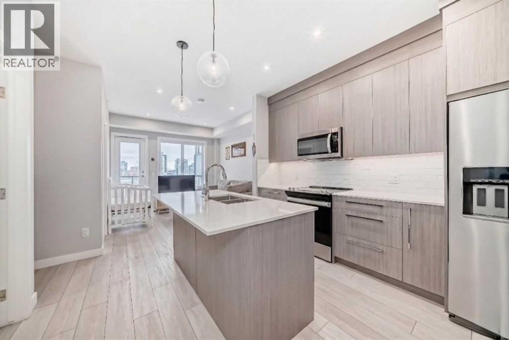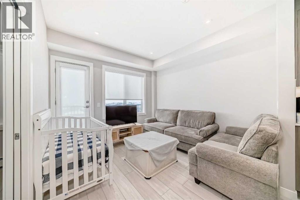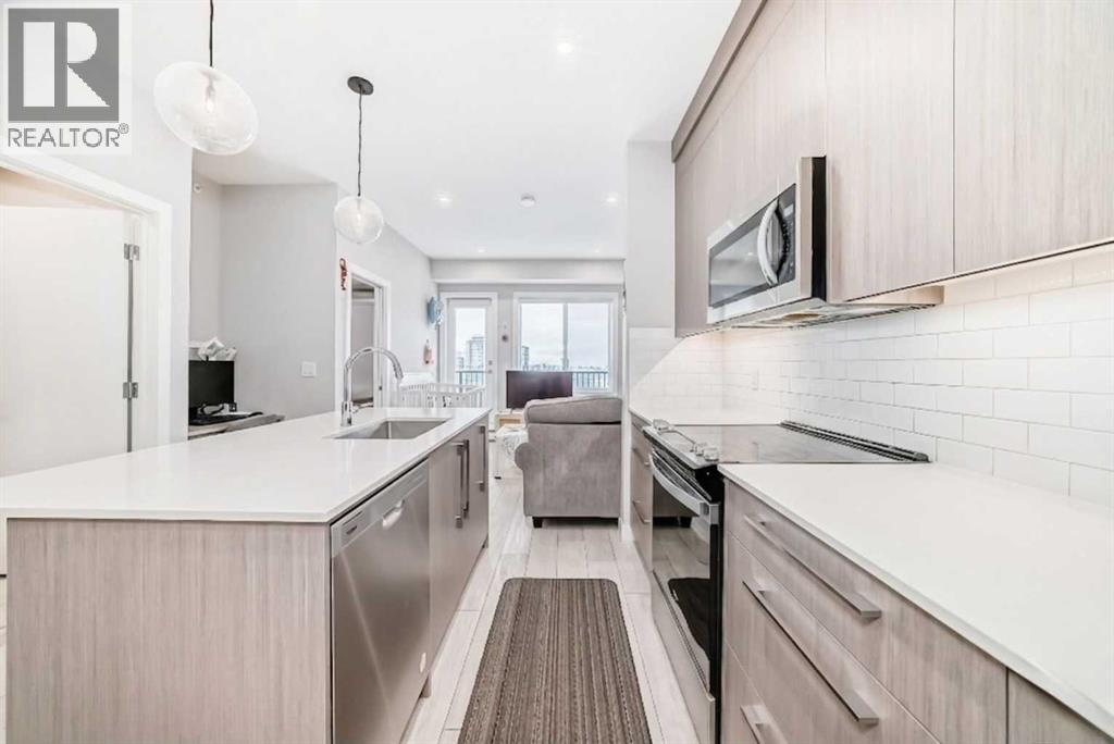 Stylish Top-Floor Condo with Premium Finishes & Top Amenities. Welcome to this modern, energy-efficient top-floor unit offering comfort, convenience, and low-maintenance living. This home features 2 bedrooms, 1 bathroom, 1 storage/locker, and 1 outdoor titled parking stall and low condo fees; ideal for first-time buyers, downsizers, or investors. Conveniently located close to the elevator with easy access east to major highways and nearby amenities. The building offers secure entry, landscaped grounds, and excellent amenities including a full fitness centre (weights, yoga & spin studio), entertainment lounge, pet spa, bike storage/repair room, and a courtyard seating area. Inside, enjoy 9’ ceilings, large windows, luxury vinyl plank flooring, designer lighting, and in-suite laundry. The contemporary kitchen features quartz countertops, full-height backsplash, stainless steel Whirlpool appliances, and sleek cabinetry with soft-close details. The bathroom is finished with quartz counters, modern fixtures, and a deep soaker tub. A perfect blend of style, location, and everyday convenience. (id:63190)
