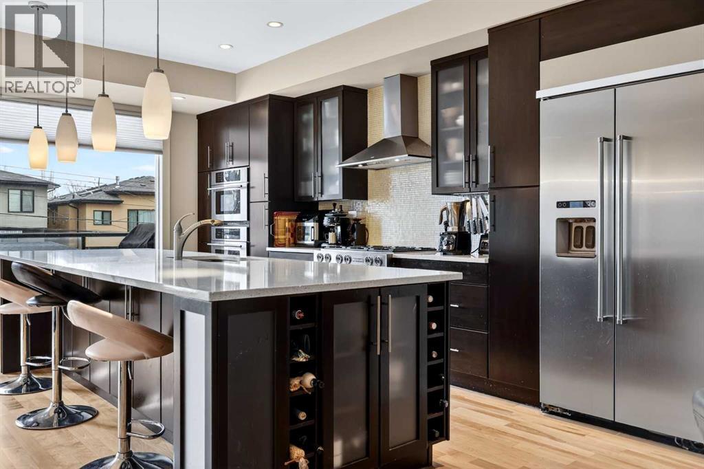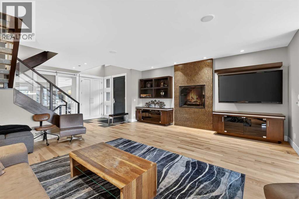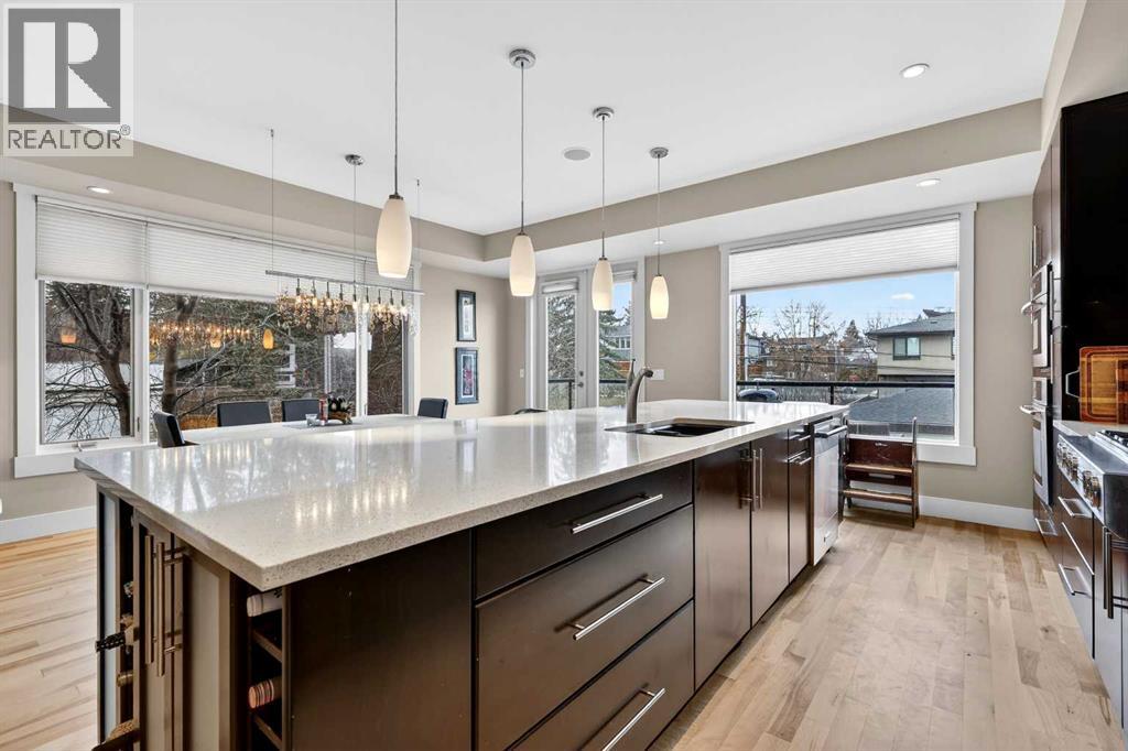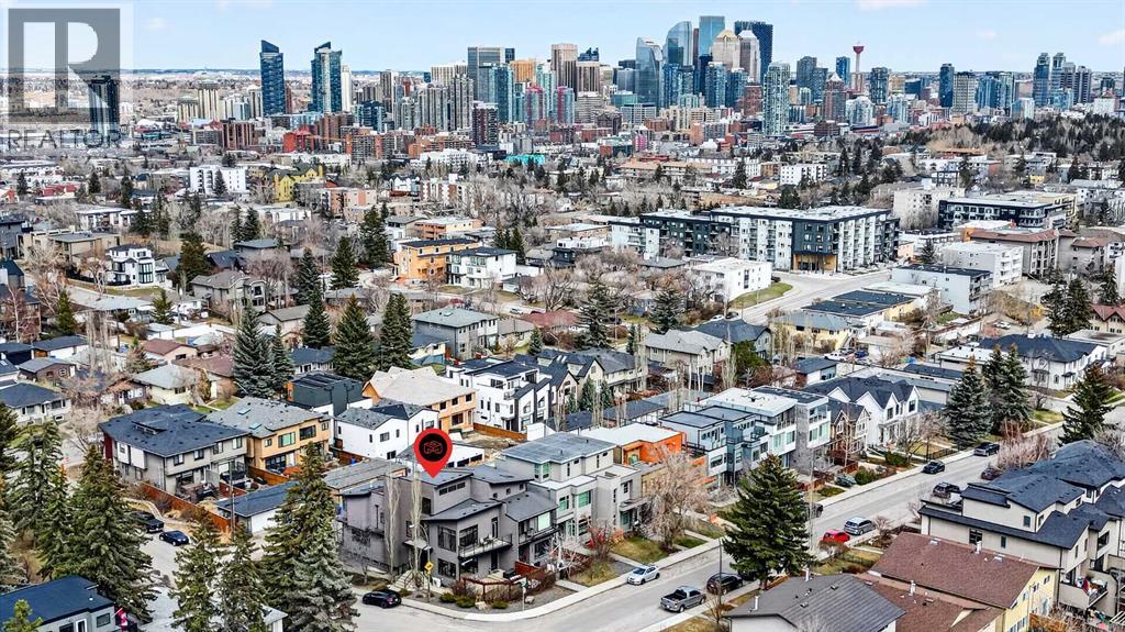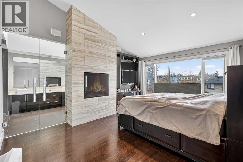 Nestled on a corner lot in the heart of the established inner city community of South Calgary, this meticulously maintained and move-in-ready 3-bedroom home offers nearly 3,300 sq ft of luxury living space. Extensively renovated with high-end upgrades throughout, this home ensures a modern, premium experience for families who value both comfort and connection.The bright, open concept main floor is ideal for everyday living and entertaining, featuring beautifully refinished hardwood floors, high ceilings, and large windows that fill the home with natural light. The spacious living room is anchored by a cozy floor-to-ceiling fireplace with built ins perfect for family movie nights. The chef inspired kitchen is both stylish and functional, complete with quartz countertops, a generous island, and easy access to the deck for effortless summer BBQs. A standout feature on this level is the dedicated professional office space, providing the ultimate environment for working from home or private consultations, while two convenient powder rooms complete the main level.Upstairs, a unique split staircase leads to a well planned layout featuring new high end carpet throughout. The primary suite provides a peaceful retreat with a double sided fireplace, walk in closet, and a 5 piece ensuite with heated floors and a soaker tub. A third bedroom offers added privacy with its own ensuite and access to a private balcony perfect for older kids, guests, or extended family. An additional versatile workspace on the upper levels offers flexibility for a second home office or homework station.The top level is a true bonus space the whole family will love, with a large media/family room and wet bar ideal for game nights, movie marathons, or entertaining friends. Step out onto the rooftop patio and take in the city views while the kids play or unwind at the end of the day.The fully developed basement adds even more space with a recreation room, laundry area, and direct access to the double attached underdrive garage making busy family life that much easier. Additional features include central air conditioning and built in speakers. Outside, enjoy a private, professionally landscaped yard featuring a beautiful outdoor living space perfect for summer evenings and a secure area for children and pets to play.Located just steps from parks, excellent schools, and all the amenities of Marda Loop, with quick access to downtown via 14th Street, this home offers the perfect balance of inner city convenience and family friendly luxury. (id:63190)