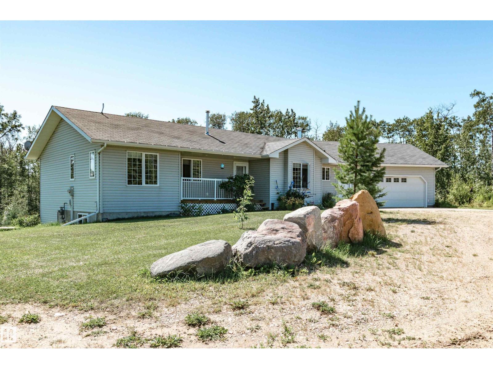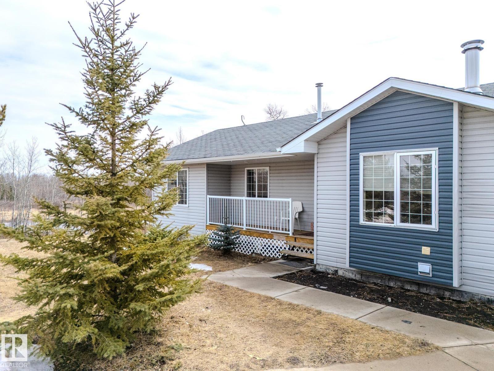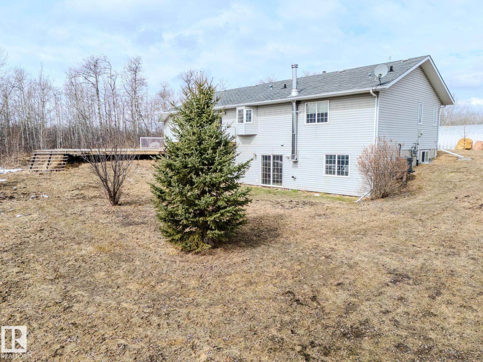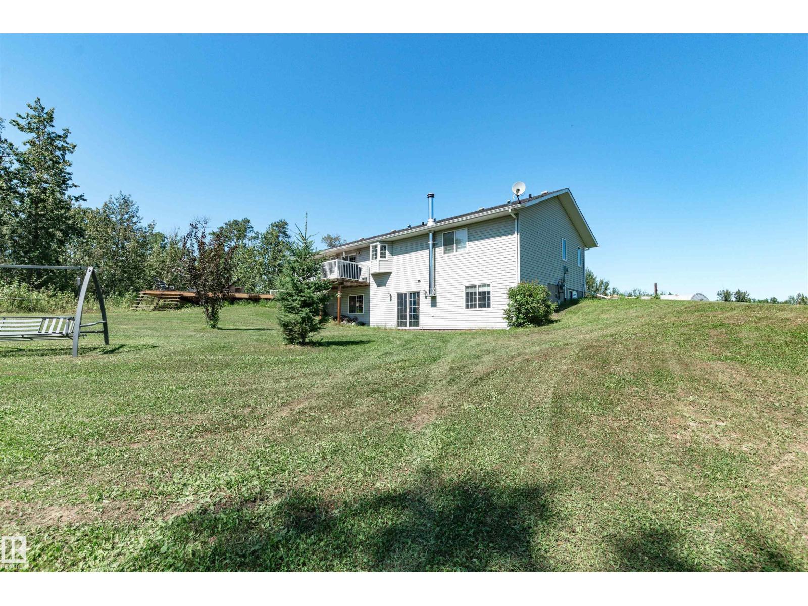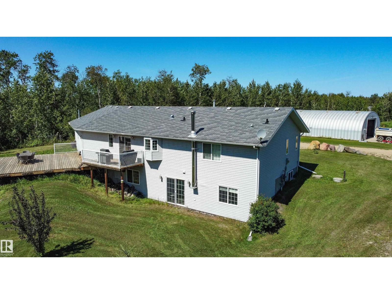 ~!WELCOME!~ A heated double garage PLUS a 63x40' metal Quonset with in-floor heat, boiler system, floor drain, service pit, 220 power, and a 20' overhead door — toys, work, or both… you’re set up. PLUS CITY WATER! And the land? TREES. PRIVACY. POND VIEWS. South-facing exposure with a picturesque pond to the east — this walkout bungalow checks the acreage boxes and then some. Inside, the open-concept main floor is anchored by a granite kitchen with island and stainless appliances. Three bedrooms up, including a primary with ensuite, plus the convenience of main floor laundry. Out back, a massive deck and dedicated BBQ area overlook nothing but nature. Quiet mornings. Long summer nights. This is why people move to the country! The walkout basement adds even more potential with 2 additional bedrooms, a bath, and a wood-burning fireplace to tie it all together. Municipal water, close to Tofield and Parkland Natural Area, and quick possession available. Acreage living done right. (id:63190)