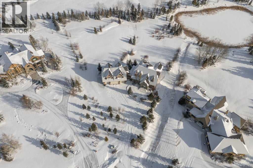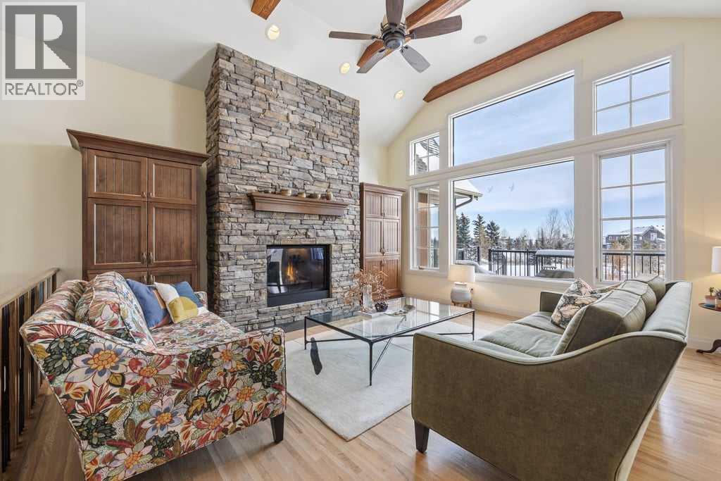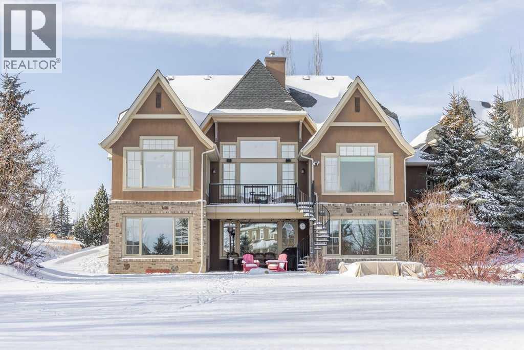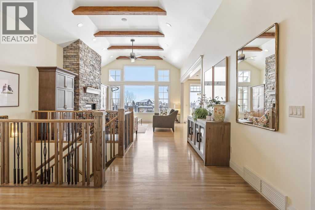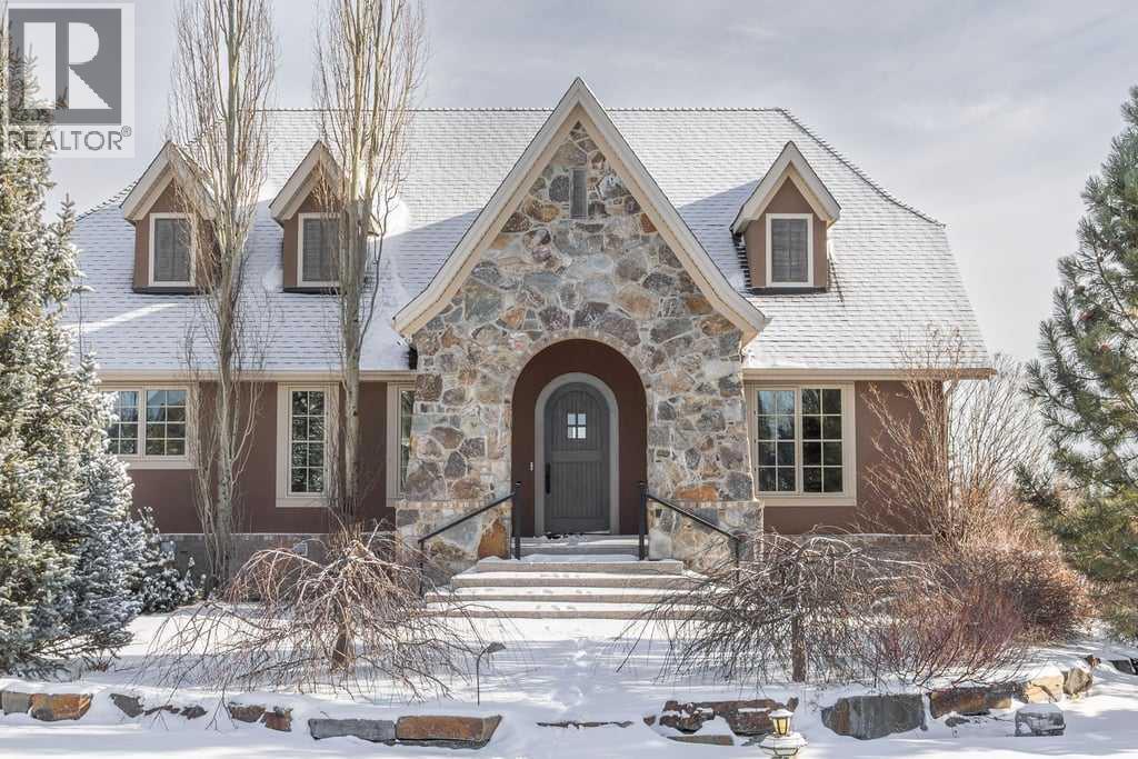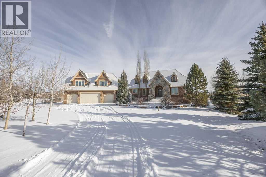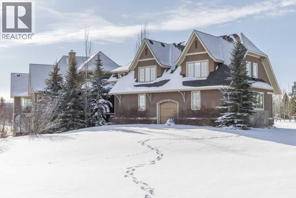 Set on over 2 acres of beautifully treed land, this exceptional Springbank home offers a rare blend of privacy, space, and refined comfort, all just minutes from west Calgary amenities and top schools.A curved driveway winds through mature landscaping, creating a strong sense of arrival as the home comes into view. Inside, soaring vaulted ceilings with exposed beams and rich hardwood floors set the tone in the main living area, where a striking stone fireplace anchors the space and invites both quiet evenings and larger gatherings.The kitchen is designed for both everyday living and entertaining, featuring integrated Thermador appliances, a walk-in pantry, a generous island with seating, and thoughtful details like a built-in wine rack. The adjacent dining area is surrounded by views of the natural landscape and opens onto a private balcony, extending your living space outdoors.The main floor primary suite is positioned to take full advantage of the peaceful setting, with views toward the pond and a well-appointed ensuite complete with dual vanities, a soaker tub, steam shower, heated floors, and separate walk-in closets. An office, along with a functional mudroom and laundry space with built-ins, completes the main level.Upstairs, a dedicated family zone offers two spacious bedrooms, a full bathroom, and a flexible recreation or study area, ideal for growing families.The walkout lower level is bright and expansive, designed for both relaxation and entertainment. Heated floors run throughout, with spaces that include a wet bar, wine cellar, theatre area, gym, and multiple recreation areas, along with two additional bedrooms and a full bathroom for guests.Outdoors, the property feels like a private retreat. Mature trees, two patio areas, a tranquil water feature with a flowing stream, and a firepit setting near the pond create multiple spaces to unwind or host throughout the seasons.Additional features include an oversized four-car garage with access to both t he front and rear of the property, air conditioning, and whole-home audio. Residents also enjoy community features such as pond maintenance and seasonal stocking through the HOA.Located within the Springbank school system and close to Calgary’s leading private schools, with convenient access west to the mountains, this is a rare opportunity to own a truly special property in a sought-after setting. (id:63190)