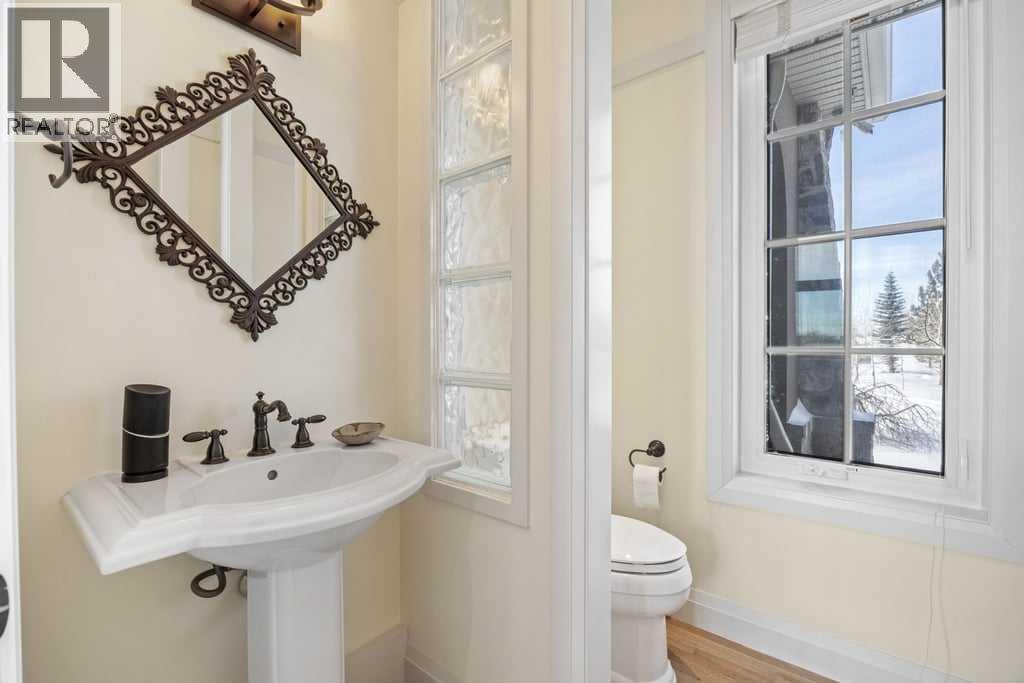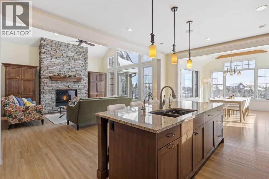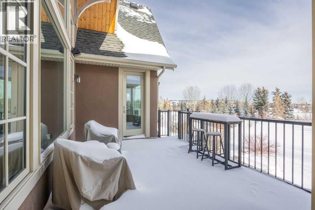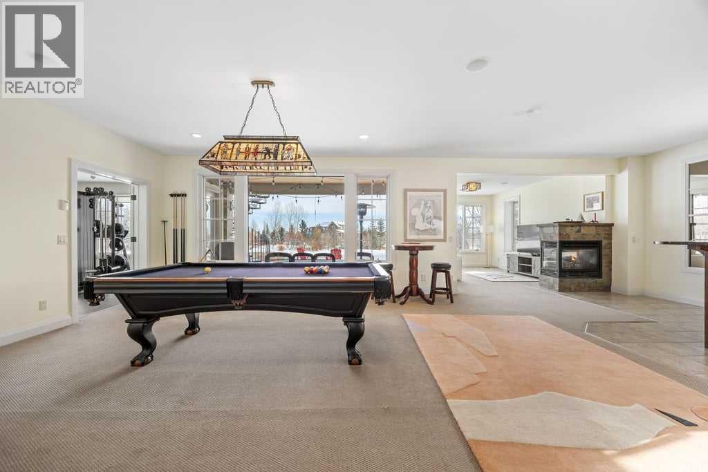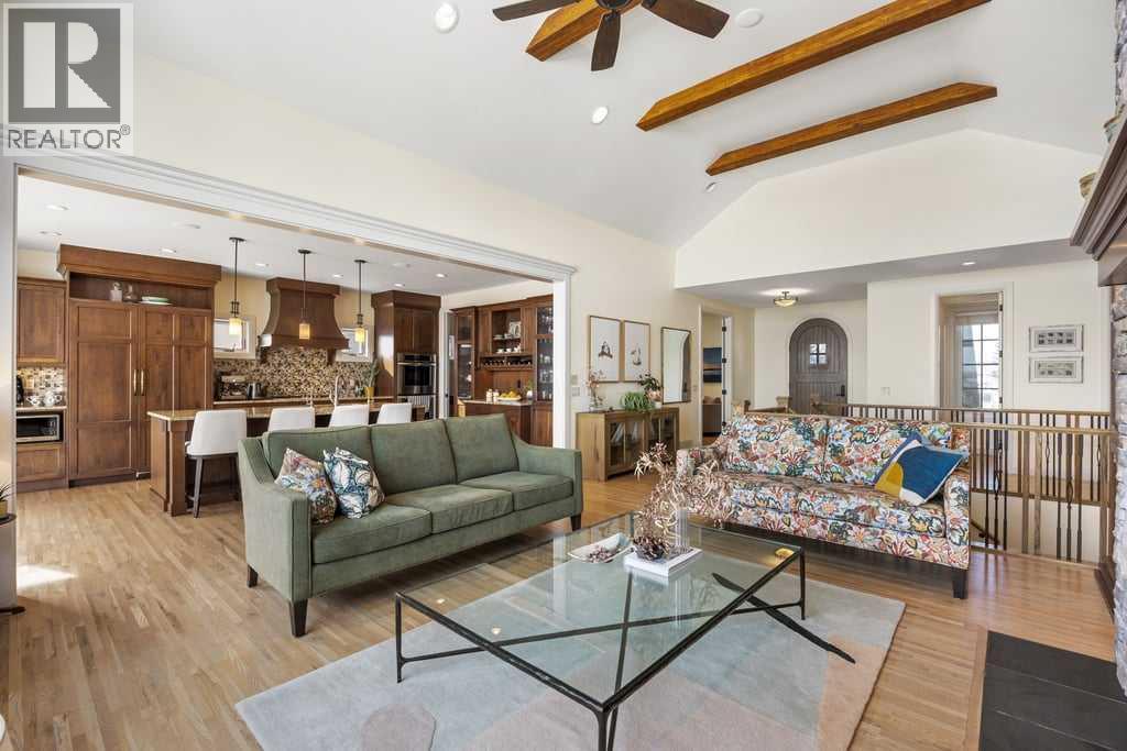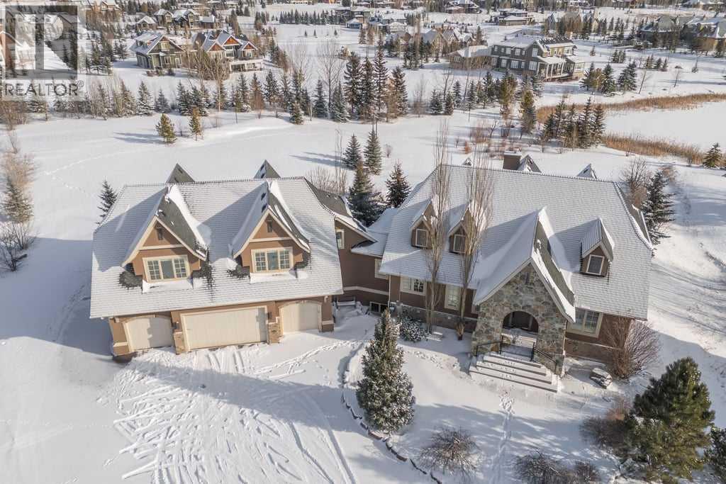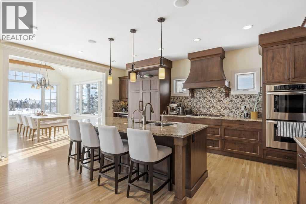 Set on over 2 acres of beautifully treed land, this exceptional Springbank home offers a rare blend of privacy, space, and refined comfort, all just minutes from west Calgary amenities and top schools.A curved driveway winds through mature landscaping, creating a strong sense of arrival as the home comes into view. Inside, soaring vaulted ceilings with exposed beams and rich hardwood floors set the tone in the main living area, where a striking stone fireplace anchors the space and invites both quiet evenings and larger gatherings.The kitchen is designed for both everyday living and entertaining, featuring integrated Thermador appliances, a walk-in pantry, a generous island with seating, and thoughtful details like a built-in wine rack. The adjacent dining area is surrounded by views of the natural landscape and opens onto a private balcony, extending your living space outdoors.The main floor primary suite is positioned to take full advantage of the peaceful setting, with views toward the pond and a well-appointed ensuite complete with dual vanities, a soaker tub, steam shower, heated floors, and separate walk-in closets. An office, along with a functional mudroom and laundry space with built-ins, completes the main level.Upstairs, a dedicated family zone offers two spacious bedrooms, a full bathroom, and a flexible recreation or study area, ideal for growing families.The walkout lower level is bright and expansive, designed for both relaxation and entertainment. Heated floors run throughout, with spaces that include a wet bar, wine cellar, theatre area, gym, and multiple recreation areas, along with two additional bedrooms and a full bathroom for guests.Outdoors, the property feels like a private retreat. Mature trees, two patio areas, a tranquil water feature with a flowing stream, and a firepit setting near the pond create multiple spaces to unwind or host throughout the seasons.Additional features include an oversized four-car garage with access to both t he front and rear of the property, air conditioning, and whole-home audio. Residents also enjoy community features such as pond maintenance and seasonal stocking through the HOA.Located within the Springbank school system and close to Calgary’s leading private schools, with convenient access west to the mountains, this is a rare opportunity to own a truly special property in a sought-after setting. (id:63190)